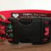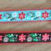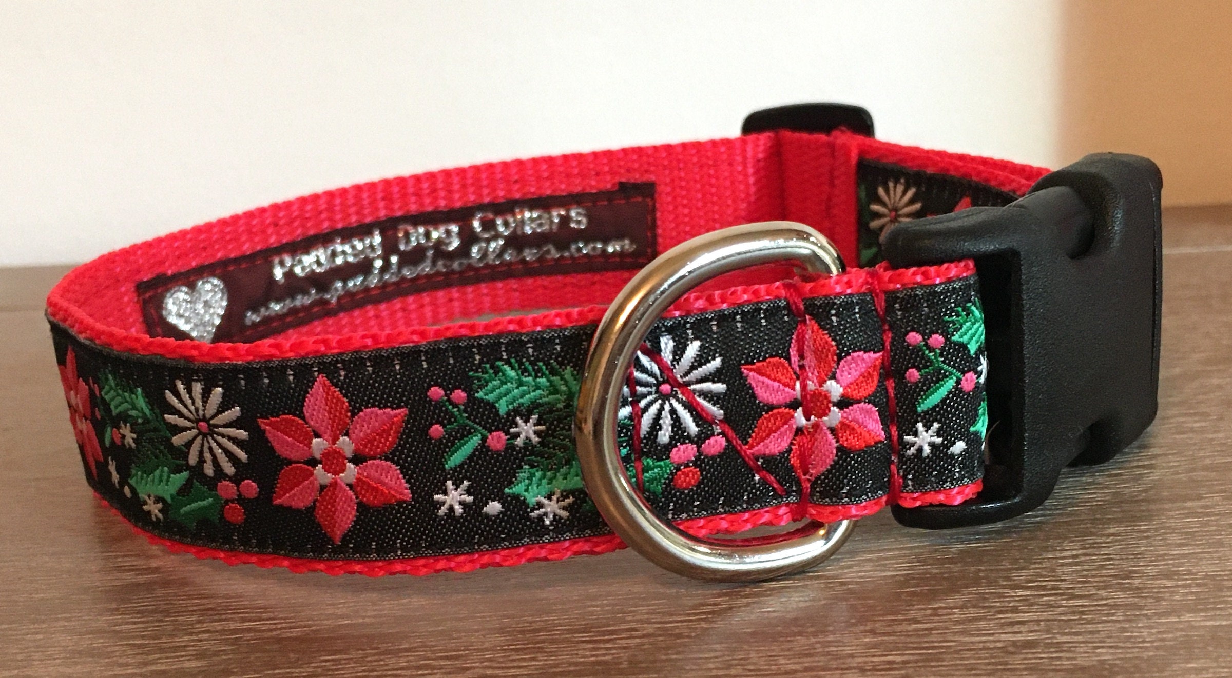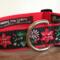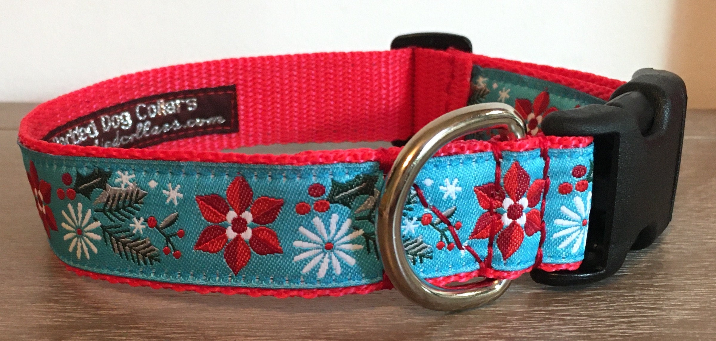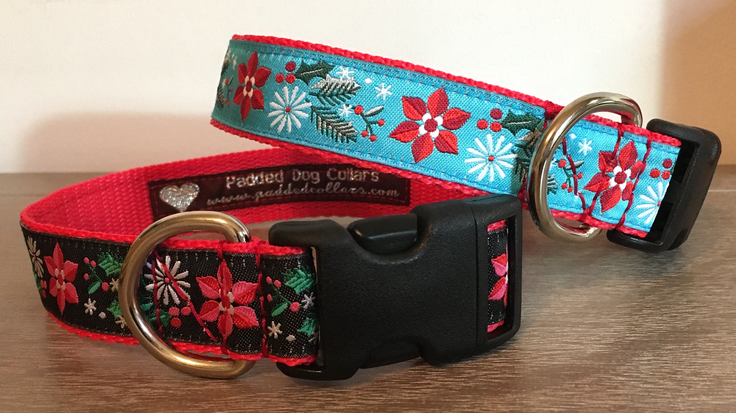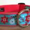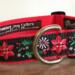 A special occasion collar, more suitable for house / on leash wear (rather than wallowing in the mud) - due to the woven fabric aspect. Choose from black pattern on a red webbing collar, or turquoise pattern on a red webbing collar.