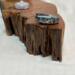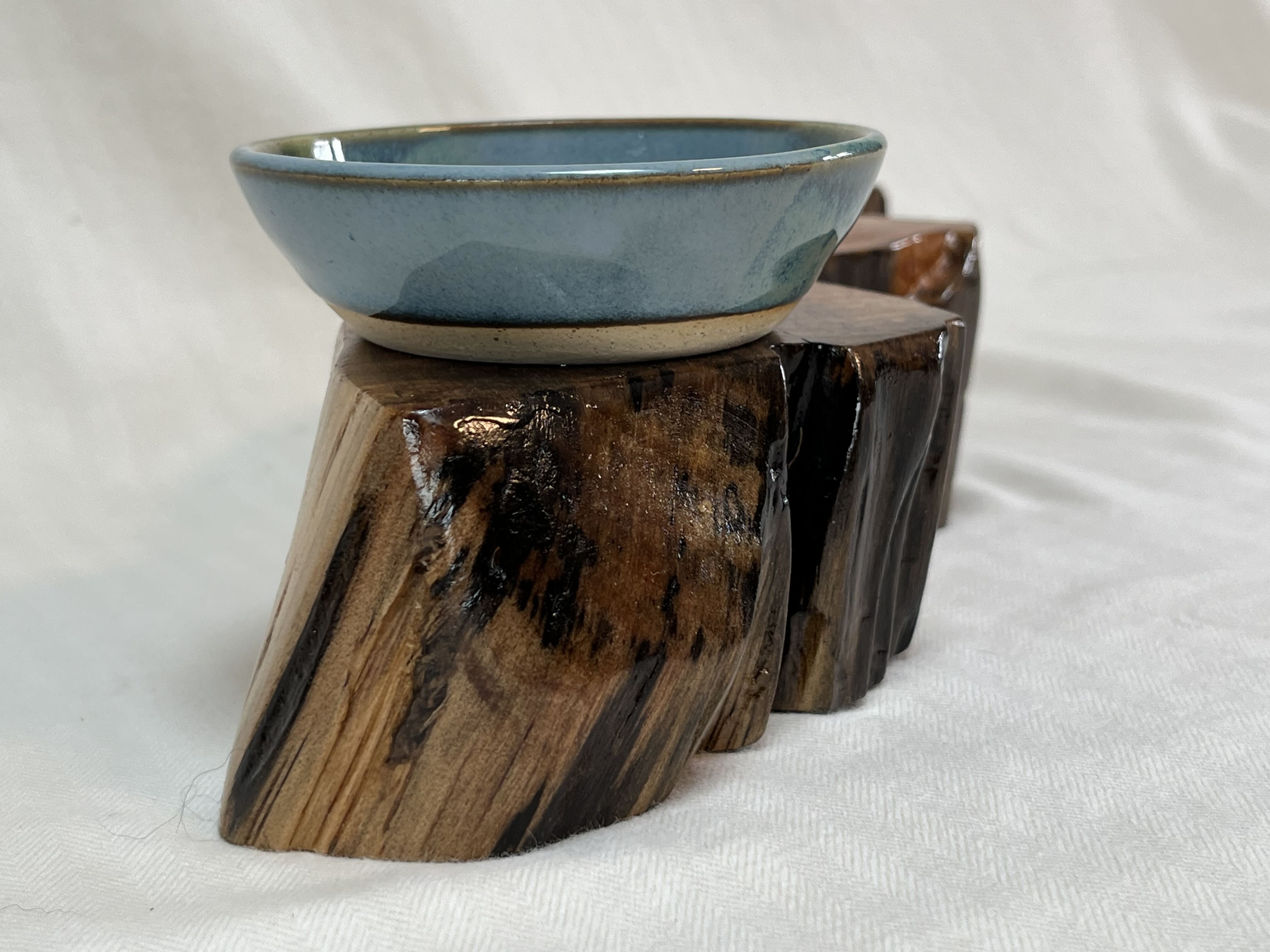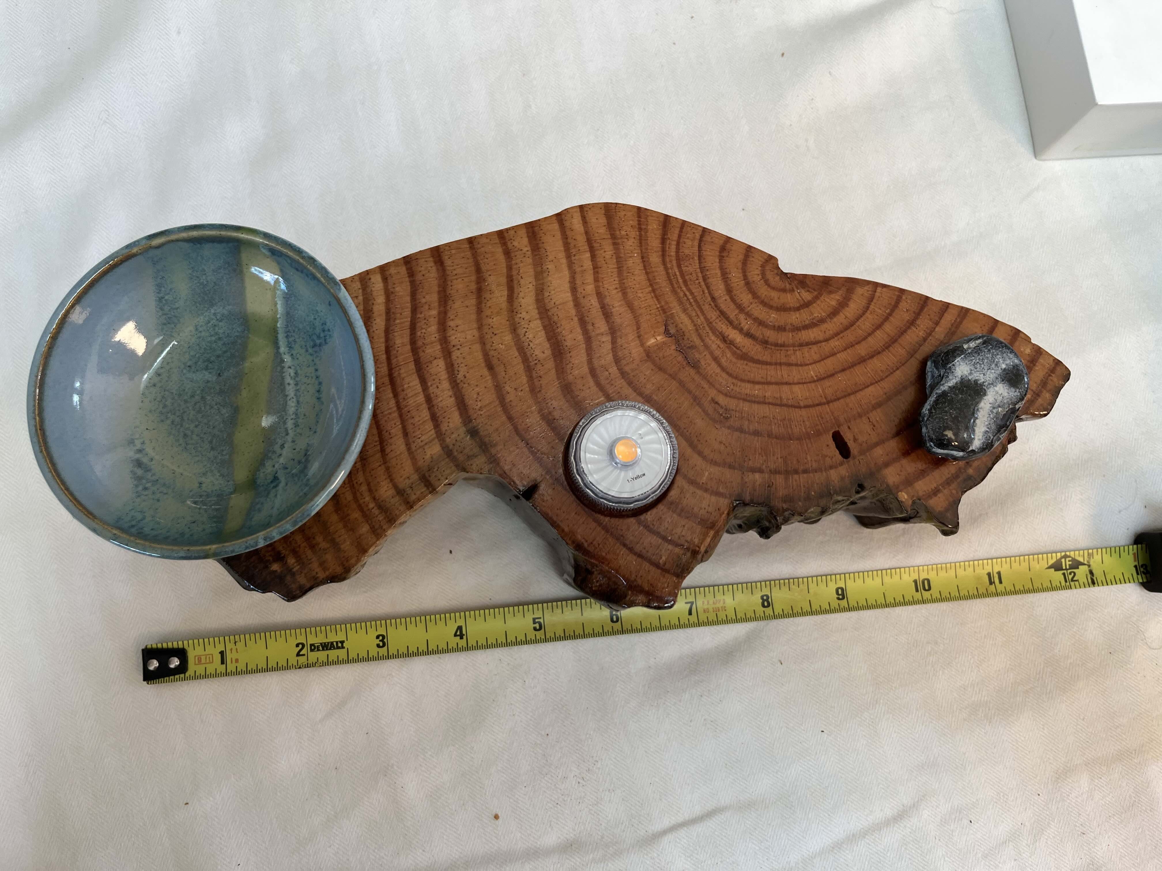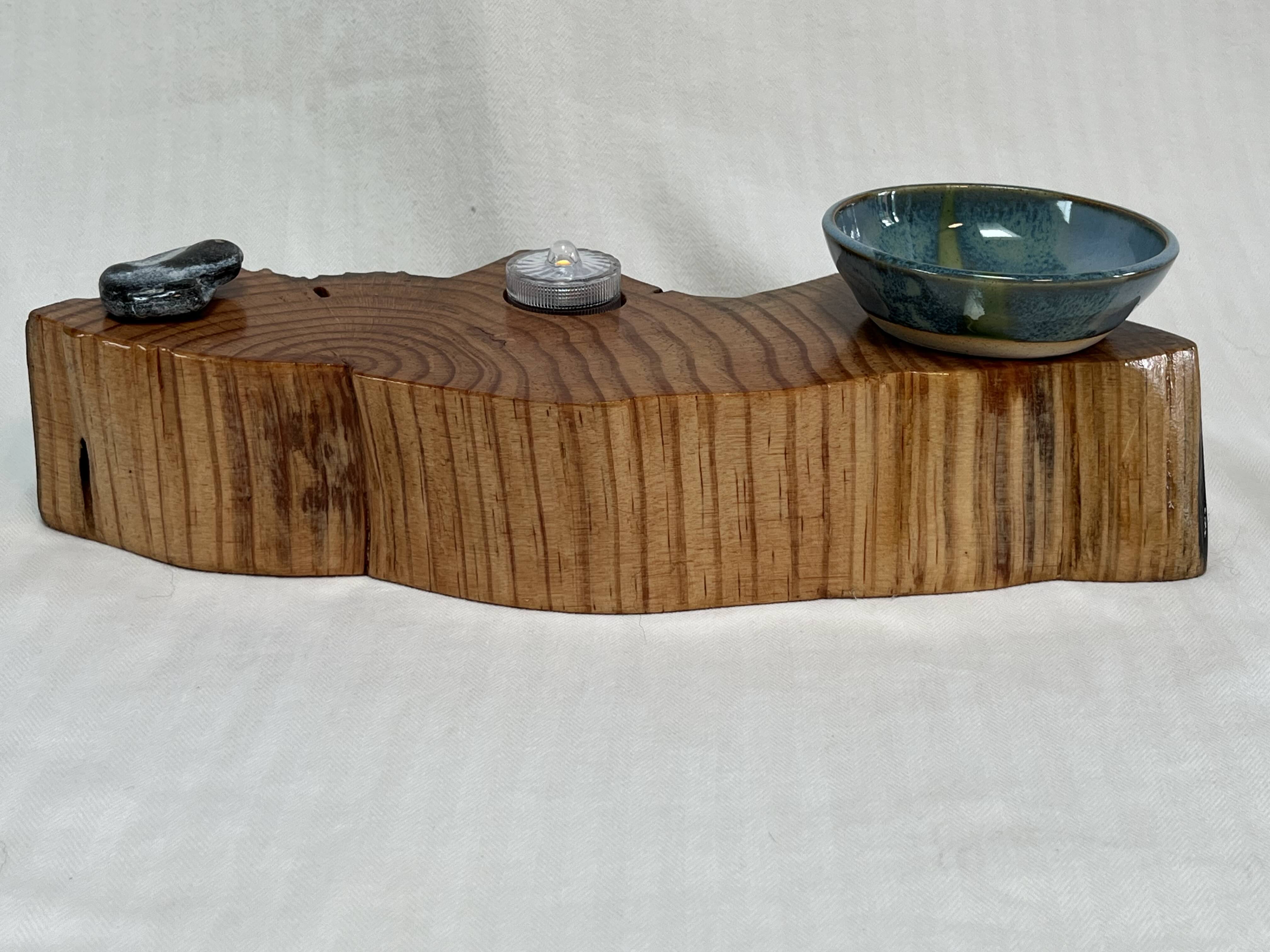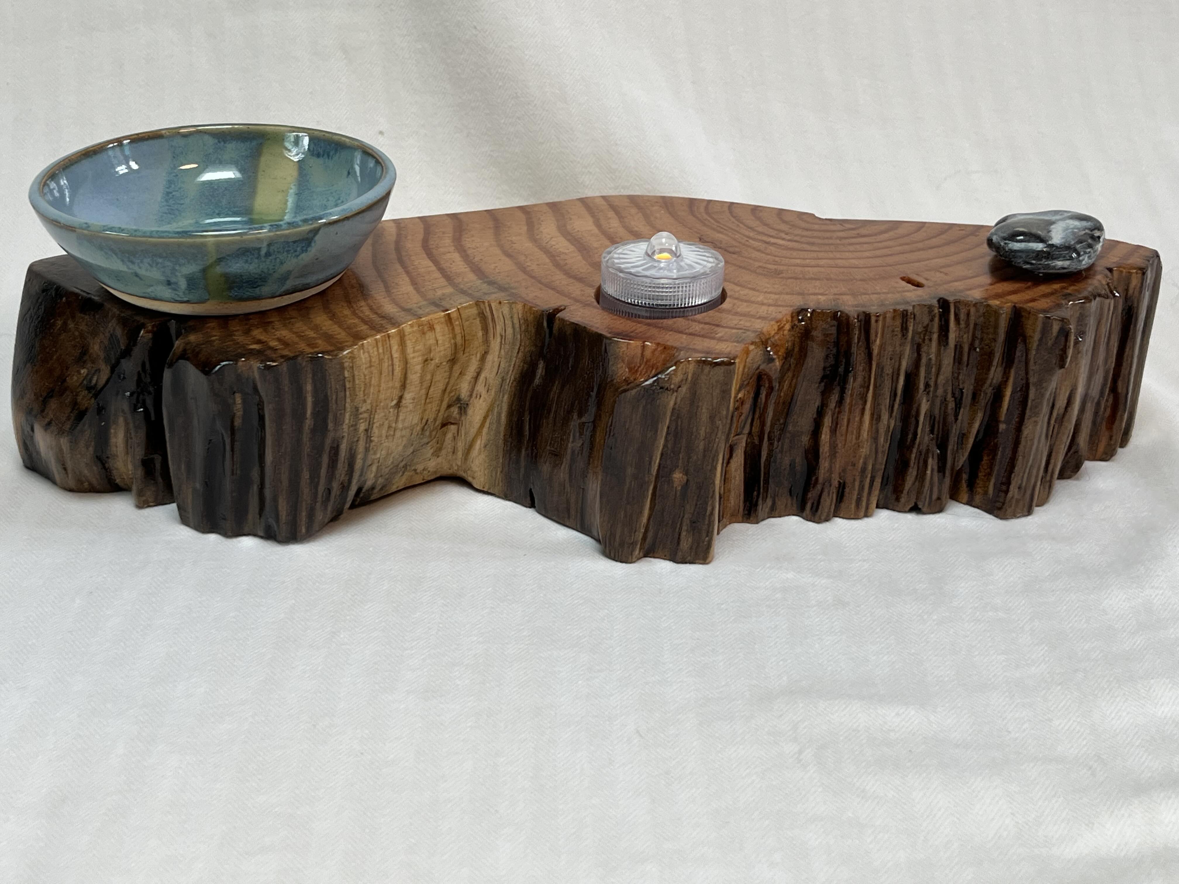 The Soul Connections Collection includes one-of-a-kind smaller stump pieces of various sizes and thicknesses. Most of these golden hued wonders are quite heavy due to the sap concentration and come in an array of sizes. Small ones are between 4-6 inches in length, medium-sized ones are 7-9 inches in length and large-sized ones are 10-12 inches in length. All are misshapen in various ways due to the way that they were pried out of the ground but most have at least one side that was exposed to the earth. These are designed for a home side table, fireplace hearth or mantle or atop a chest of drawers or bookcase. Each piece is designed to represent the four elements earth, fire, air and water in some way and include a small blue or amber tea LED light, a meta-physical stone and a small hand thrown pottery dish. The pottery dish can be used to add your own unique offerings to the altar or for incense burning.