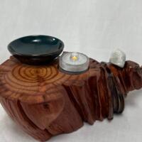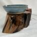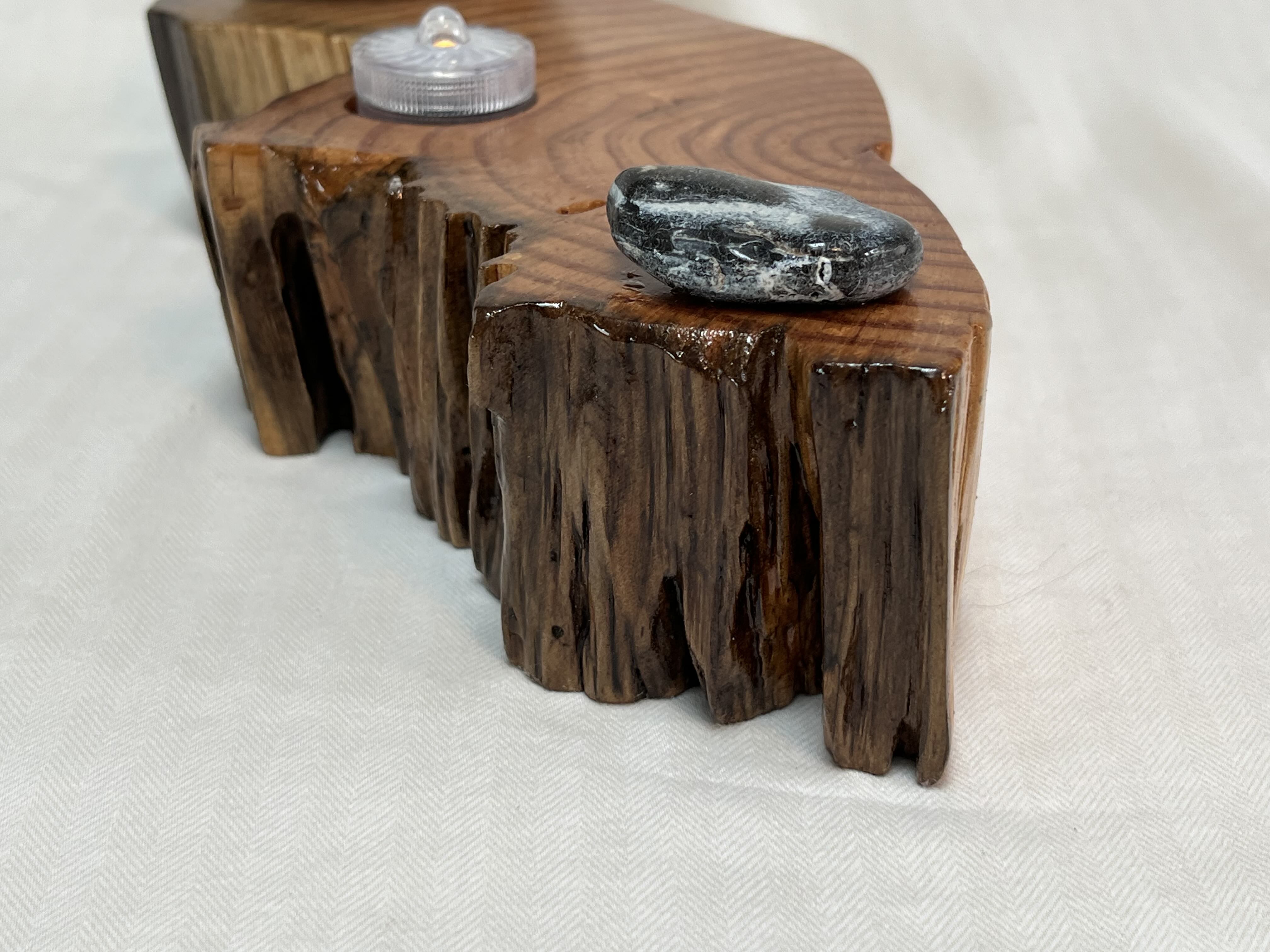 After about two years of resting, the roots and misshapen wood started calling to me to be reinvented as works of art. After washing away dirt and debris, the pieces were sanded, carefully inspected and hand shaped to bring out each individual root’s beauty and sap formation. In some areas the sap colors the wood nearly black, and in others the wood displays multiple luminous shades of gold and even reds on some pieces. Each root piece of my Earth Spirits Collection has been hand rubbed with at least two coats of Danish oil and are mounted on vintage cast-iron lamp stands of various sizes. Each also includes a healing stone to help start you on your own personal earth caretaking journey. The stump pieces of my Soul Connections Collection are a little more uniform in color but have unique tree rings, grains and thicknesses. They have been sealed with three coats of urethane and most have at least one natural outer edge which would, at one time, have been exposed to the soil. To this base I’ve added an LED tea light and a small pottery dish to hold your own offerings or for incense burning in addition to a healing stone.