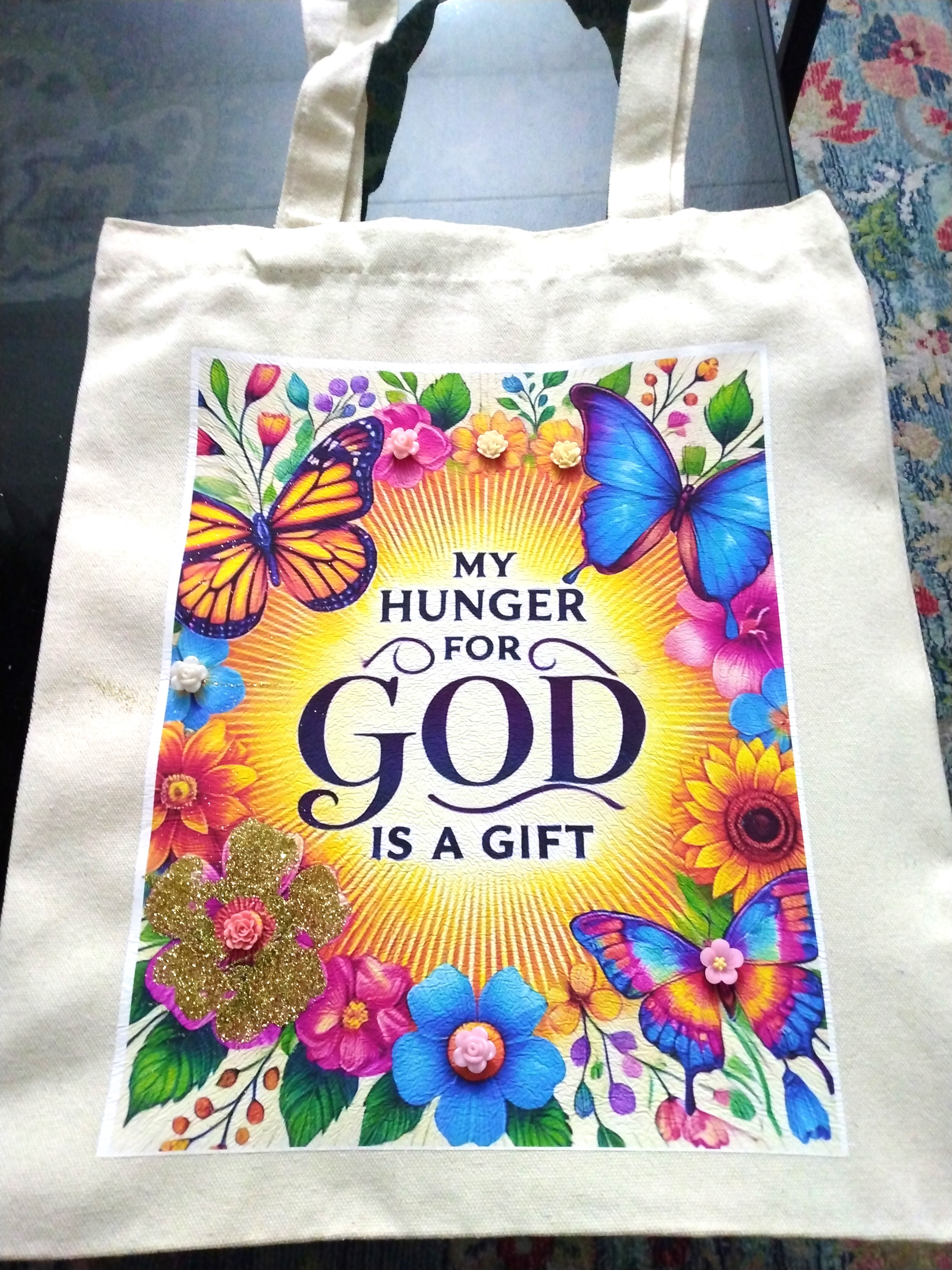 12 x14 tote bag with uplifting spring theme "My hunger for God is a gift