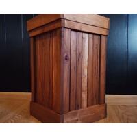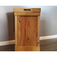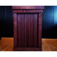 Made from reclaimed wood, this trash can was stained using Red Oak stain and features Silver Hardware. With it's 2 sides, it's great as a recycling bin or you can use 1 side for trash and 1 side for recycling.