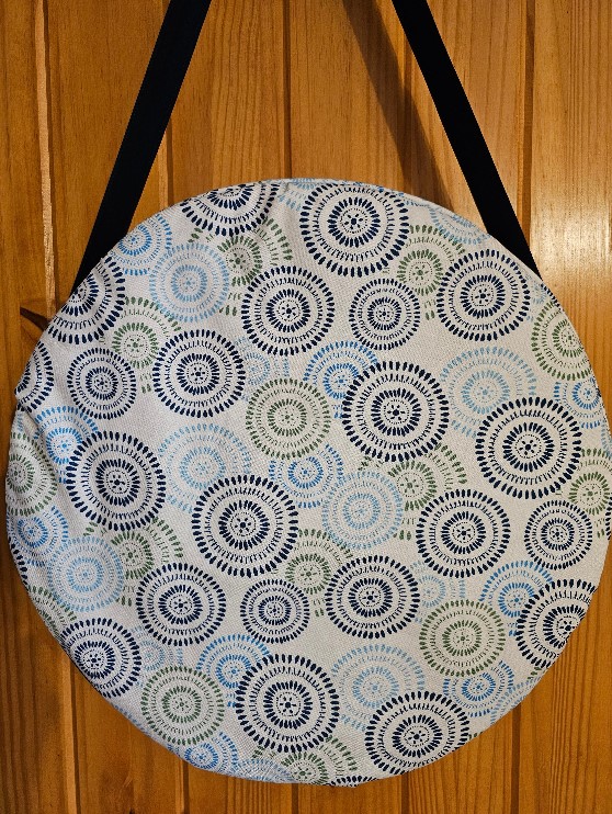 This drum bag or carrying case will fit a Remo frame drum 16" x 4" and is made of cotton print with solid cotton contrast fabric. The inside is lined with a solid color and there is protective batting between the layers for both sides of the drum. The inside seams are reinforced for durability. It features an easy access zipper on top. The shoulder strap is 2" wide and a 14" drop. This bag is designed for a Frame (hoop, hand or shamanic) drum.