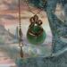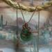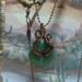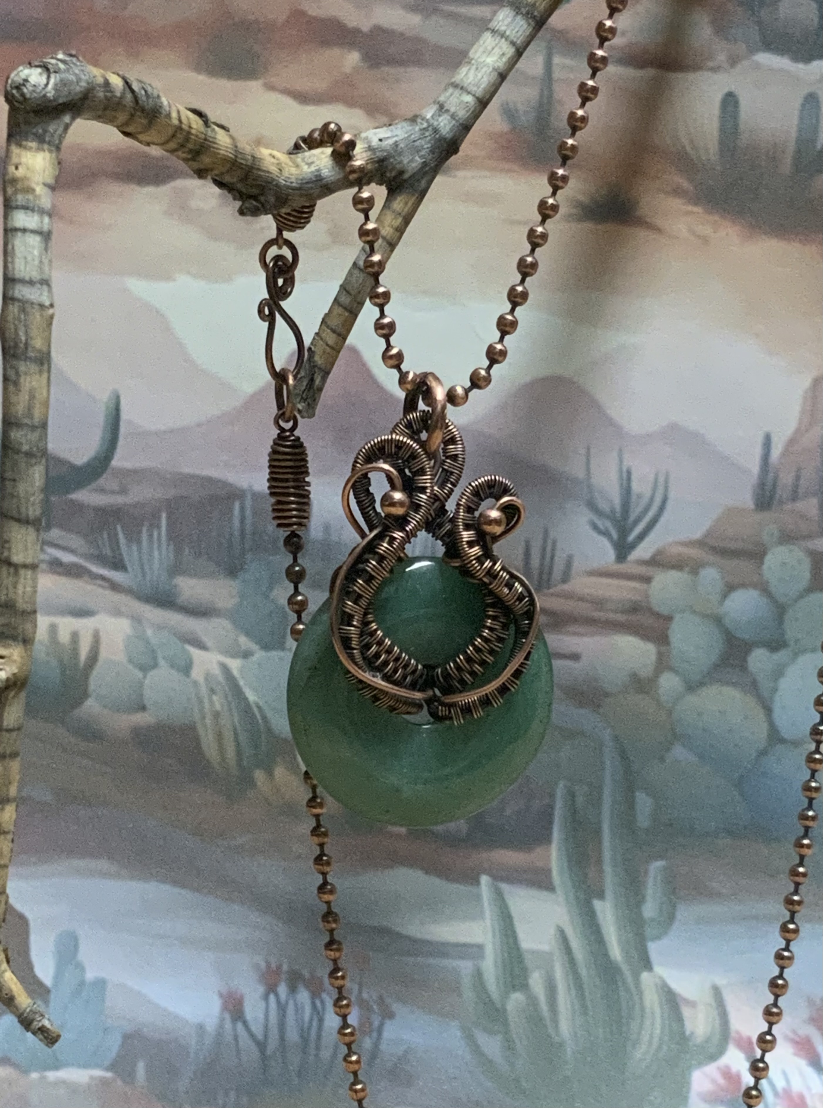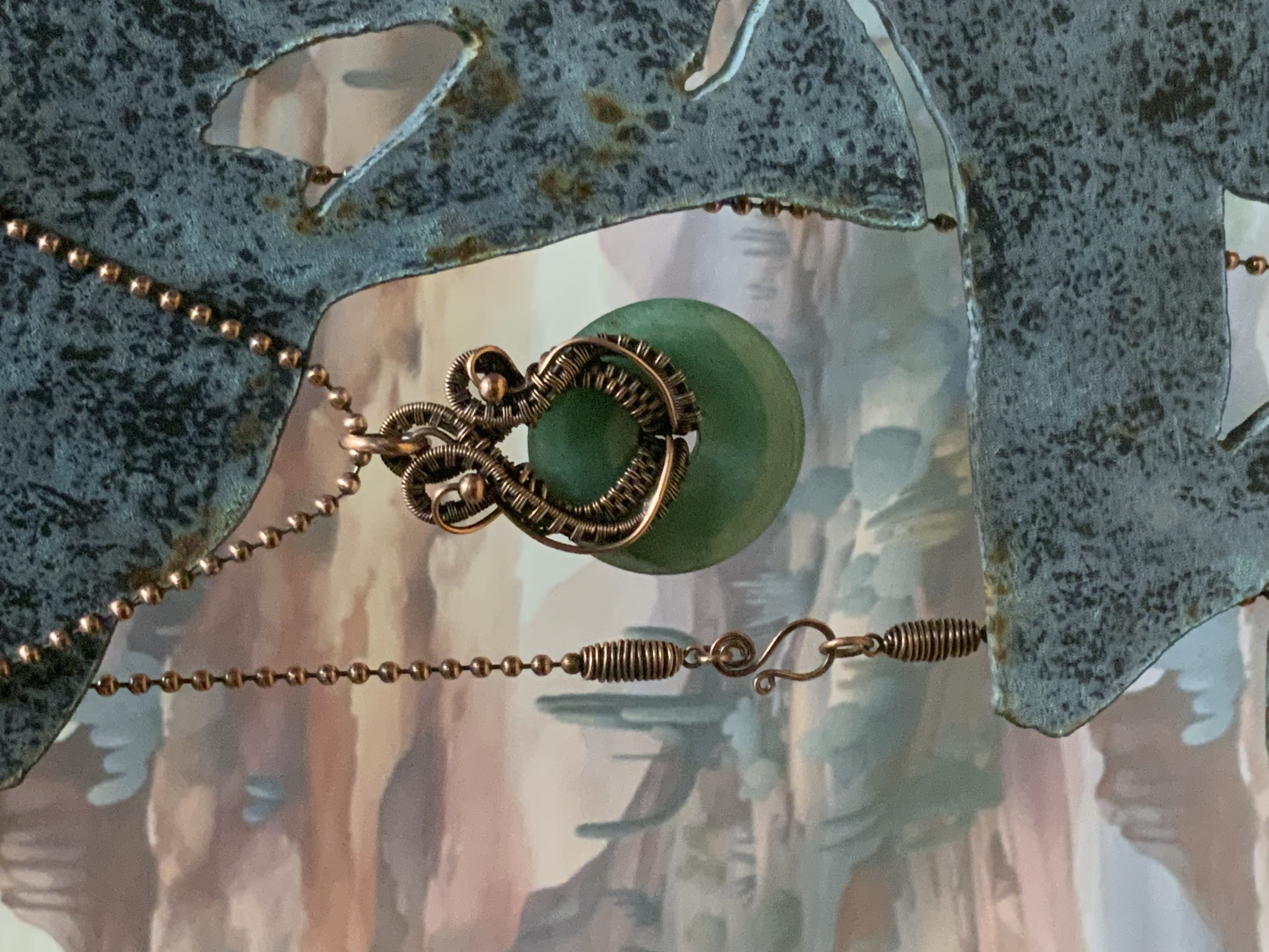 This pendent is a aventurine donut stone, that has been wire wrapped in copper wire, then patined to give it the antiqued look. The darker copper color makes the green stone pop. The copper ball chain is about 18” not including the handmade clasp. I hand cut my chain from a spool, so the lengths will be slightly different. The original pendent design is a tutorial by Kelly Jones Jewelry Design.
