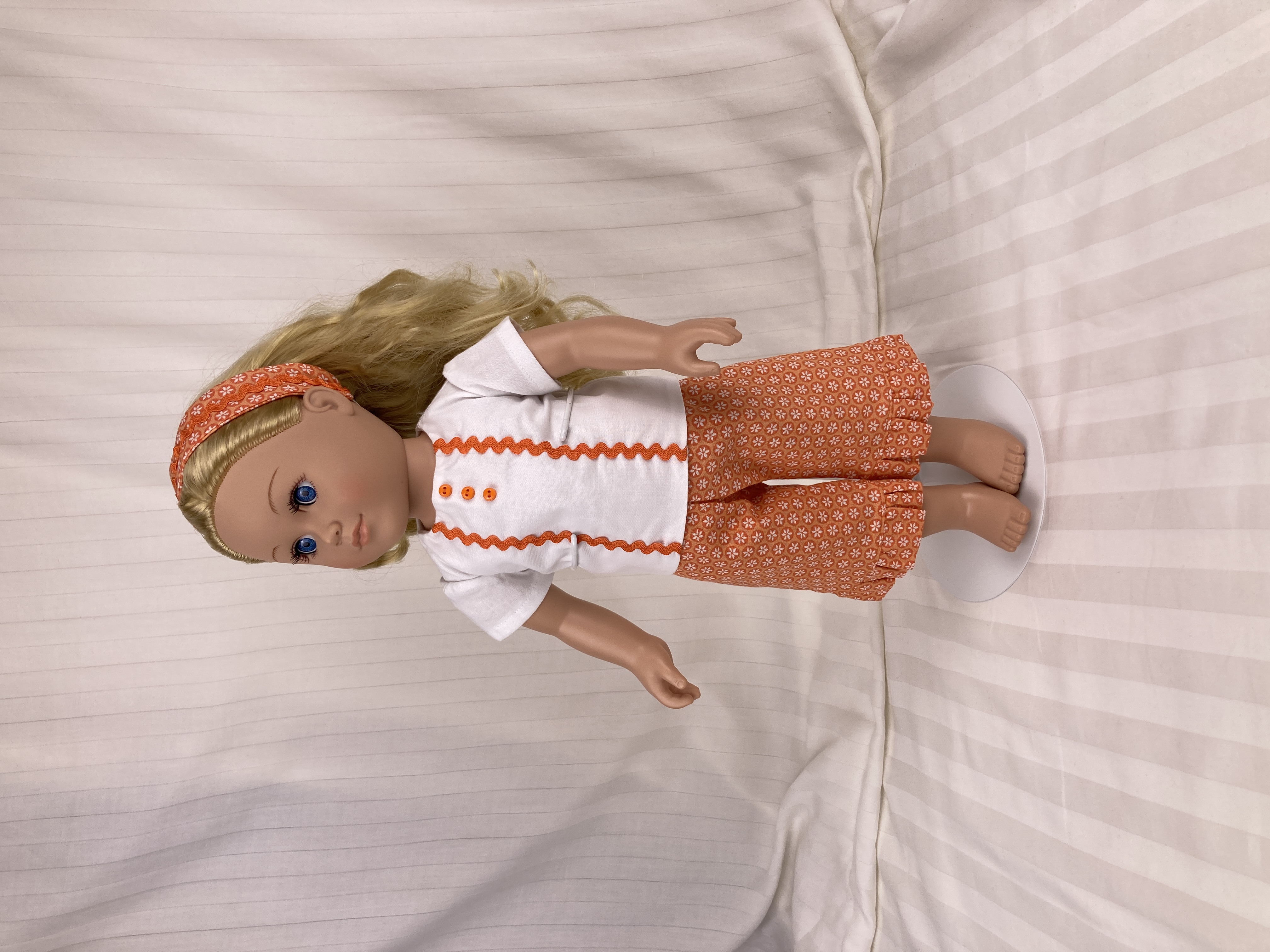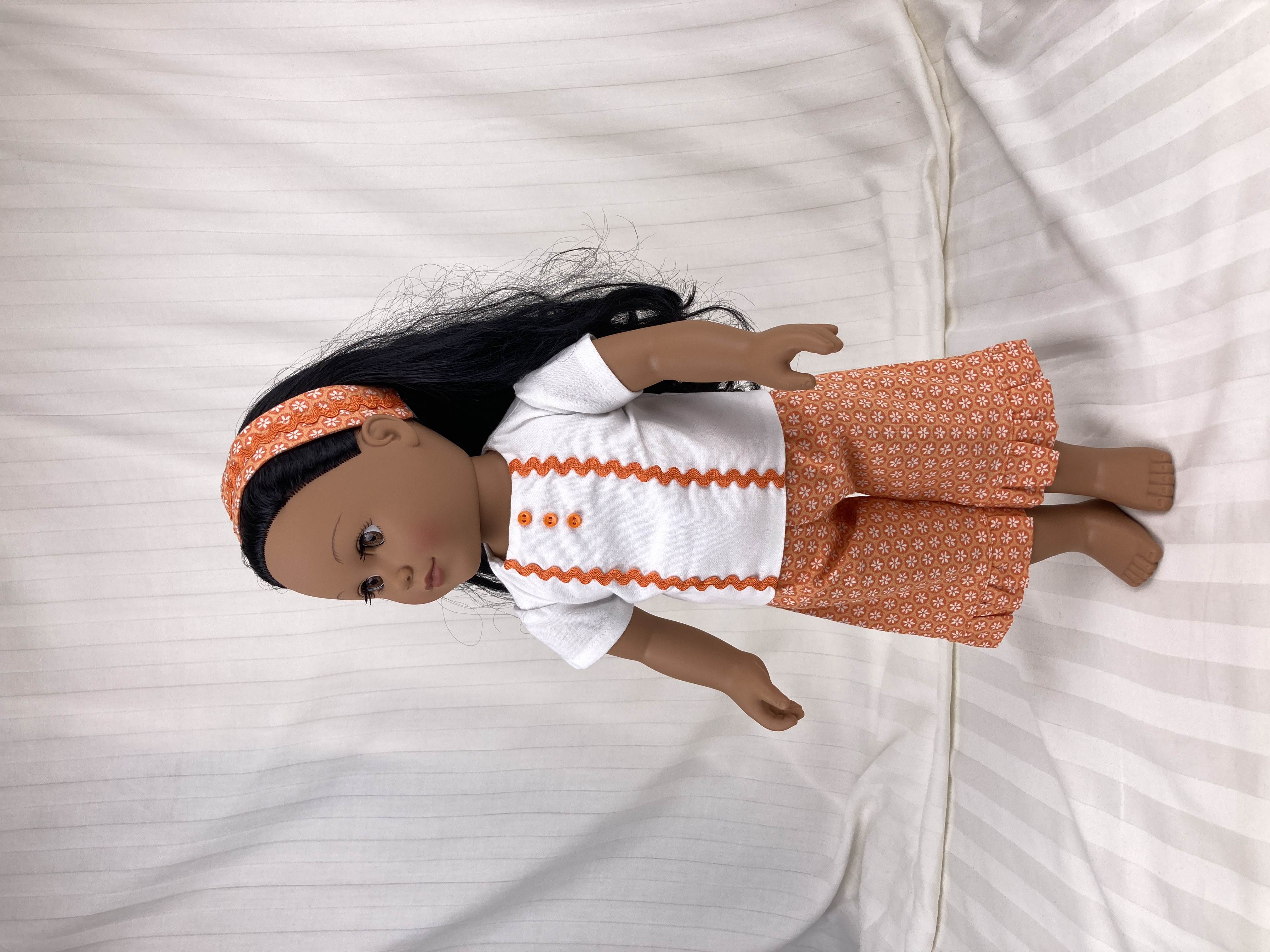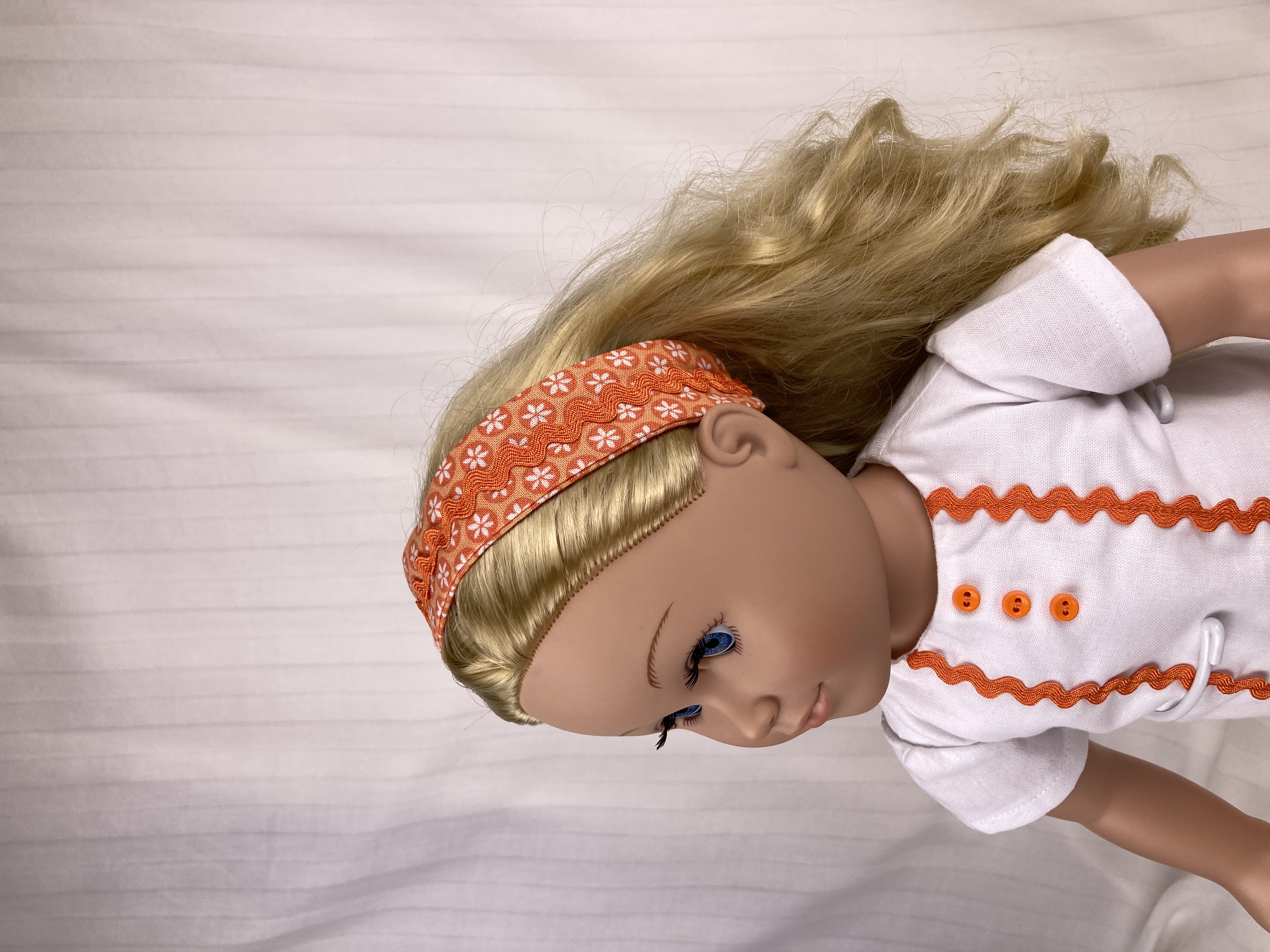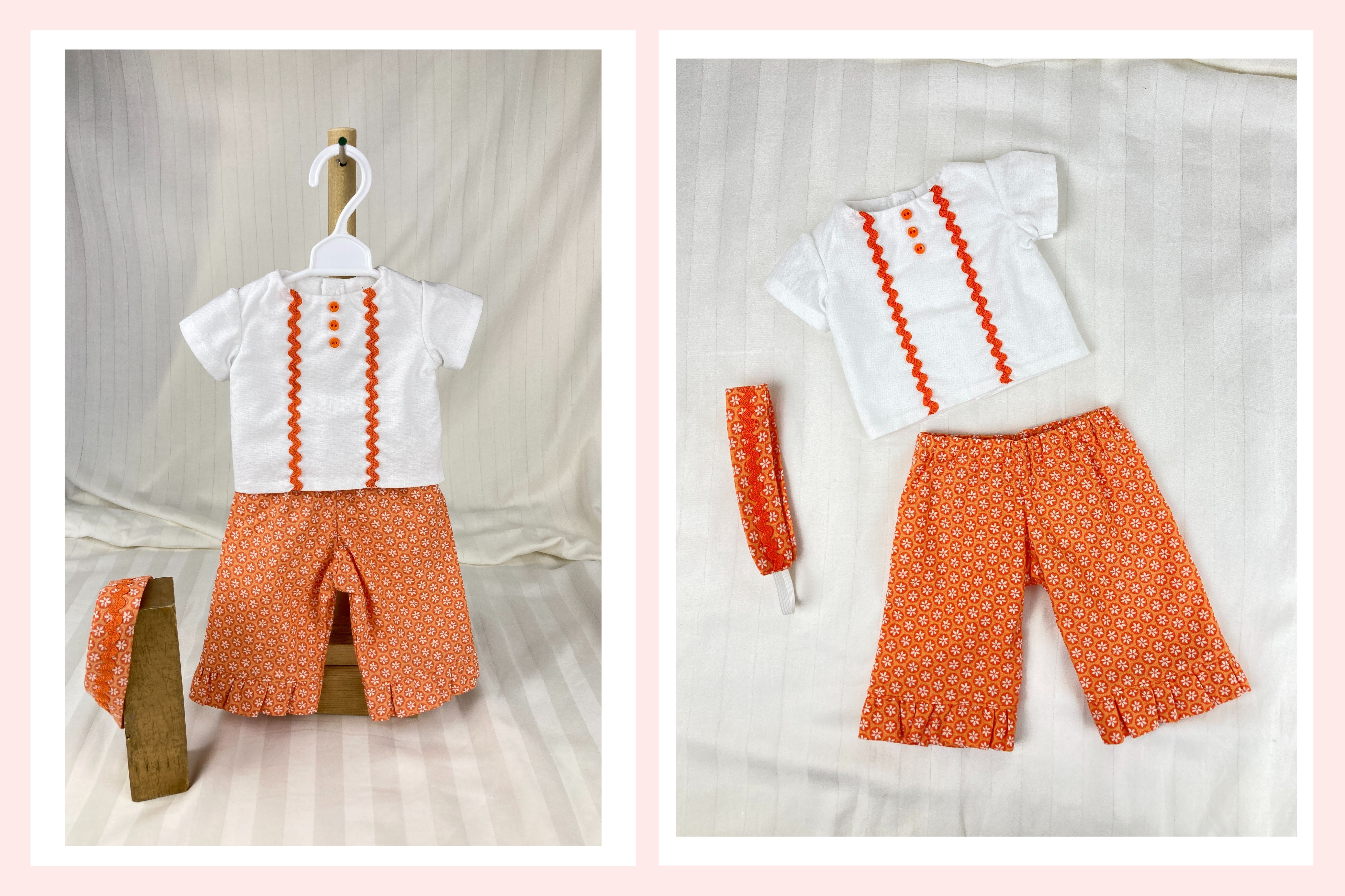 The top/shirt is made from white cotton and is lined. It has short sleeves and a hook and loop back closure. Two rows of orange ric rac run down the front, along with three small orange buttons, adding a playful and casual look. The pants are made from a cotton orange floral print and feature an inch long ruffle along the bottom. The pants are elastic waist. The matching headband is made from the same orange fabric as the pants. A single strand of orange ric rac adorns the top of the headband.
