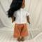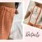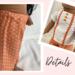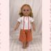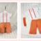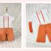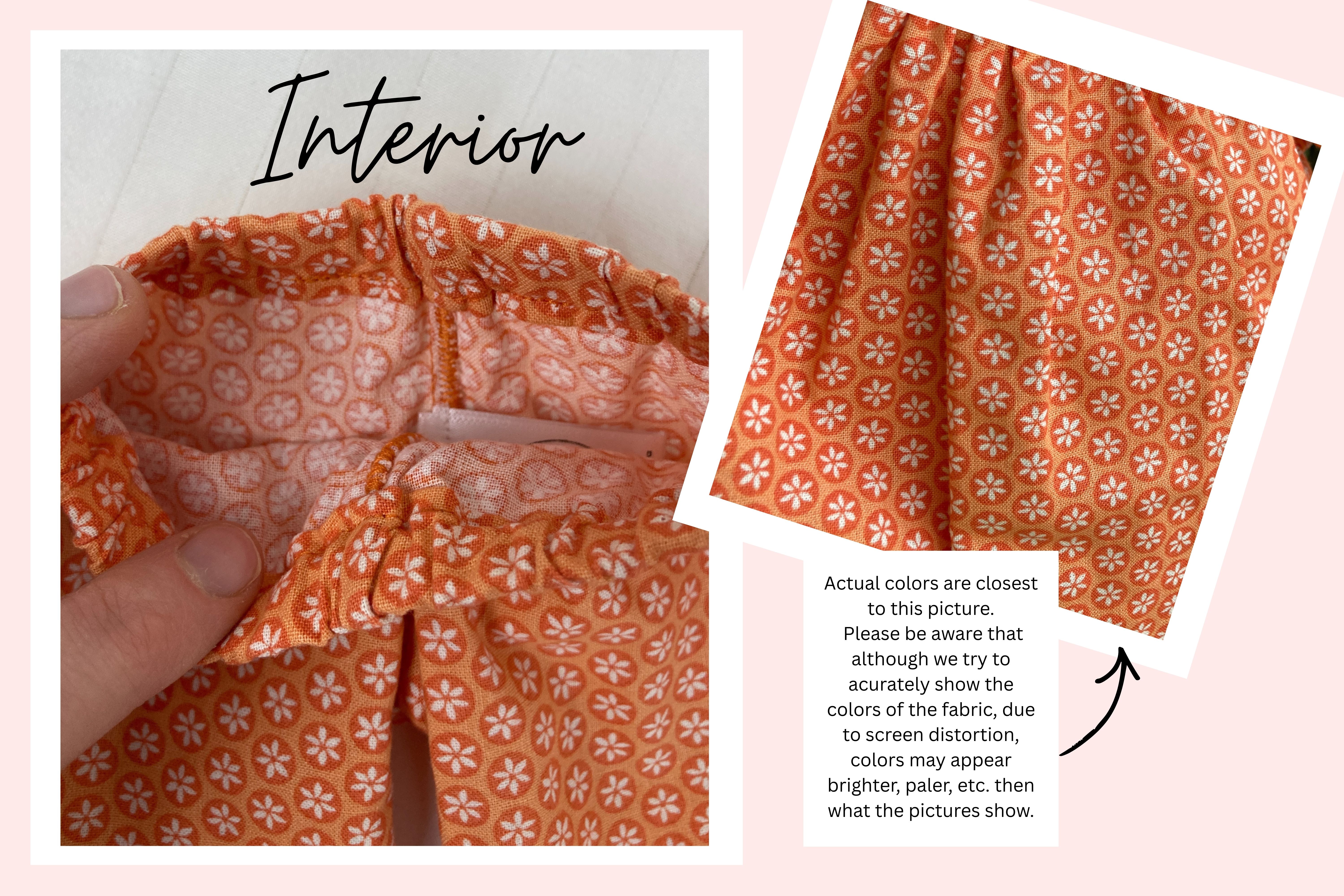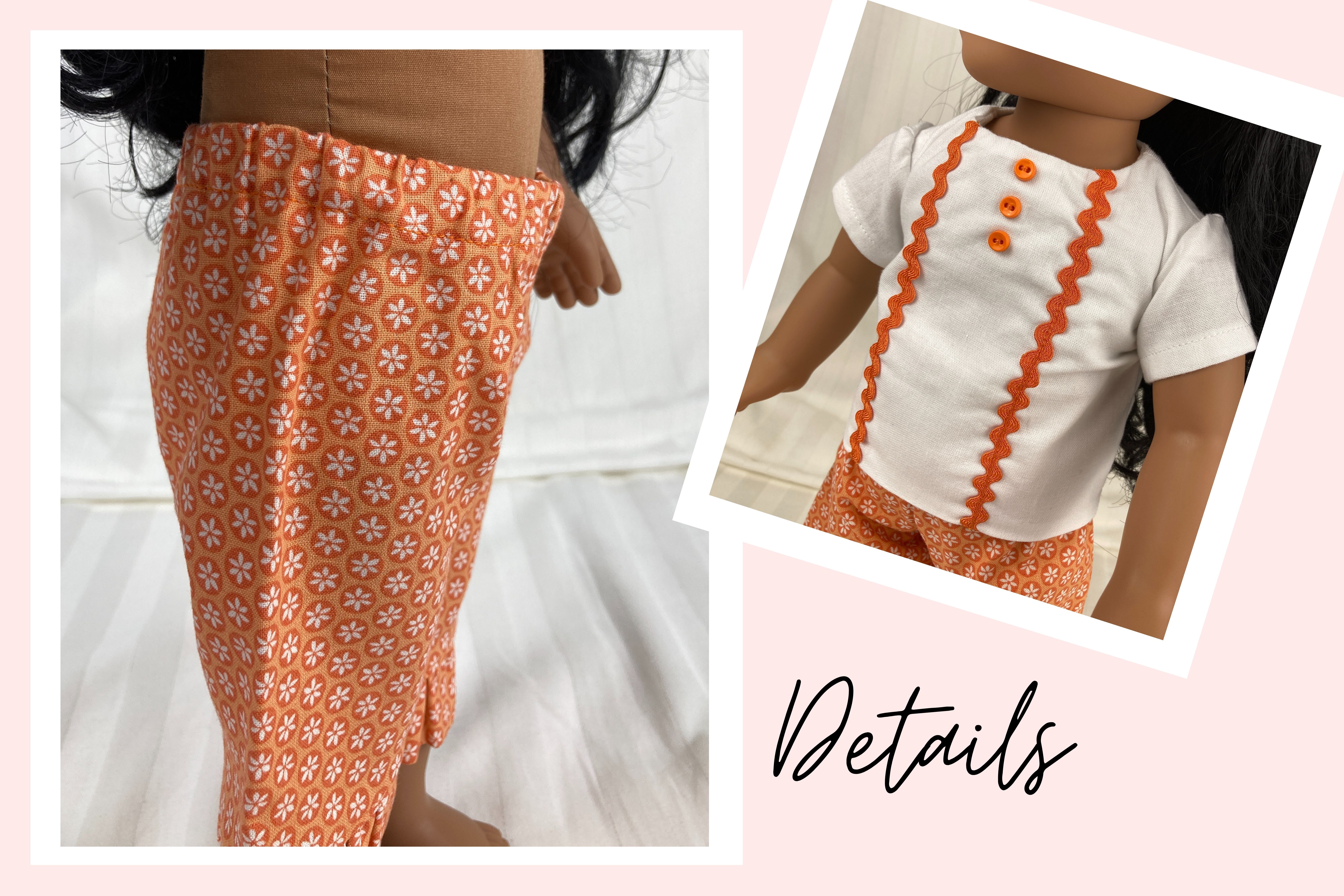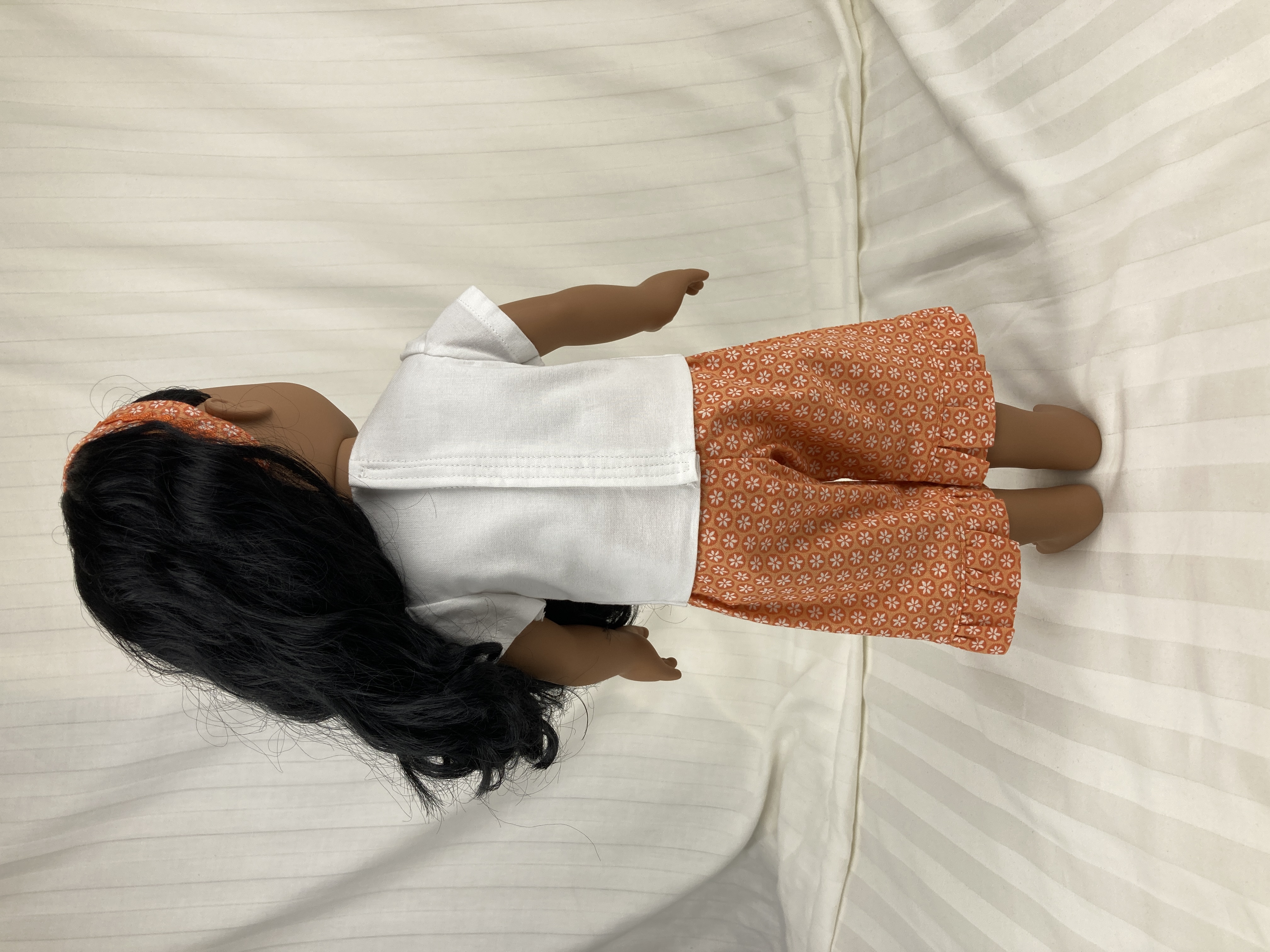 The top/shirt is made from white cotton and is lined. It has short sleeves and a hook and loop back closure. Two rows of orange ric rac run down the front, along with three small orange buttons, adding a playful and casual look. The pants are made from a cotton orange floral print and feature an inch long ruffle along the bottom. The pants are elastic waist. The matching headband is made from the same orange fabric as the pants. A single strand of orange ric rac adorns the top of the headband.