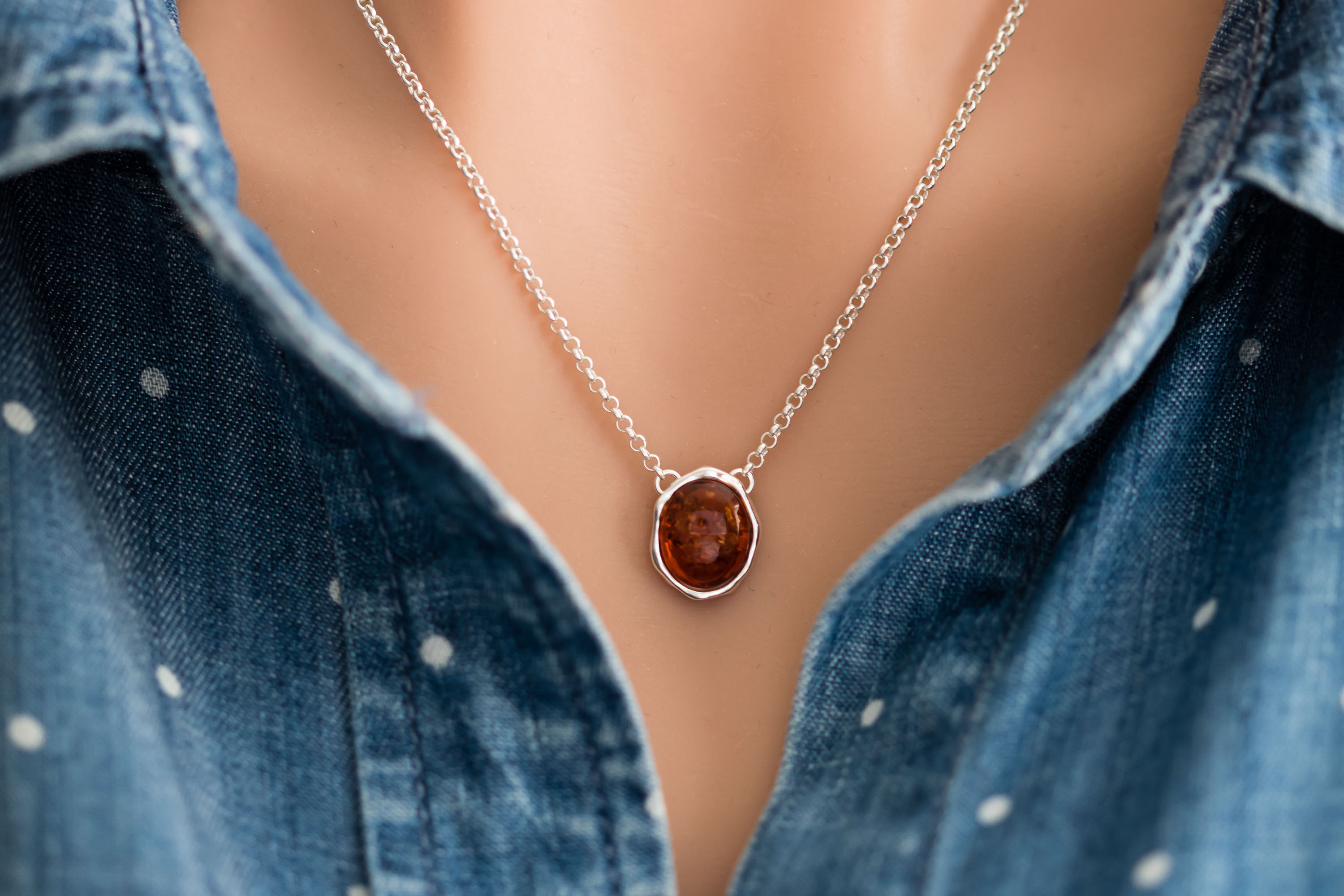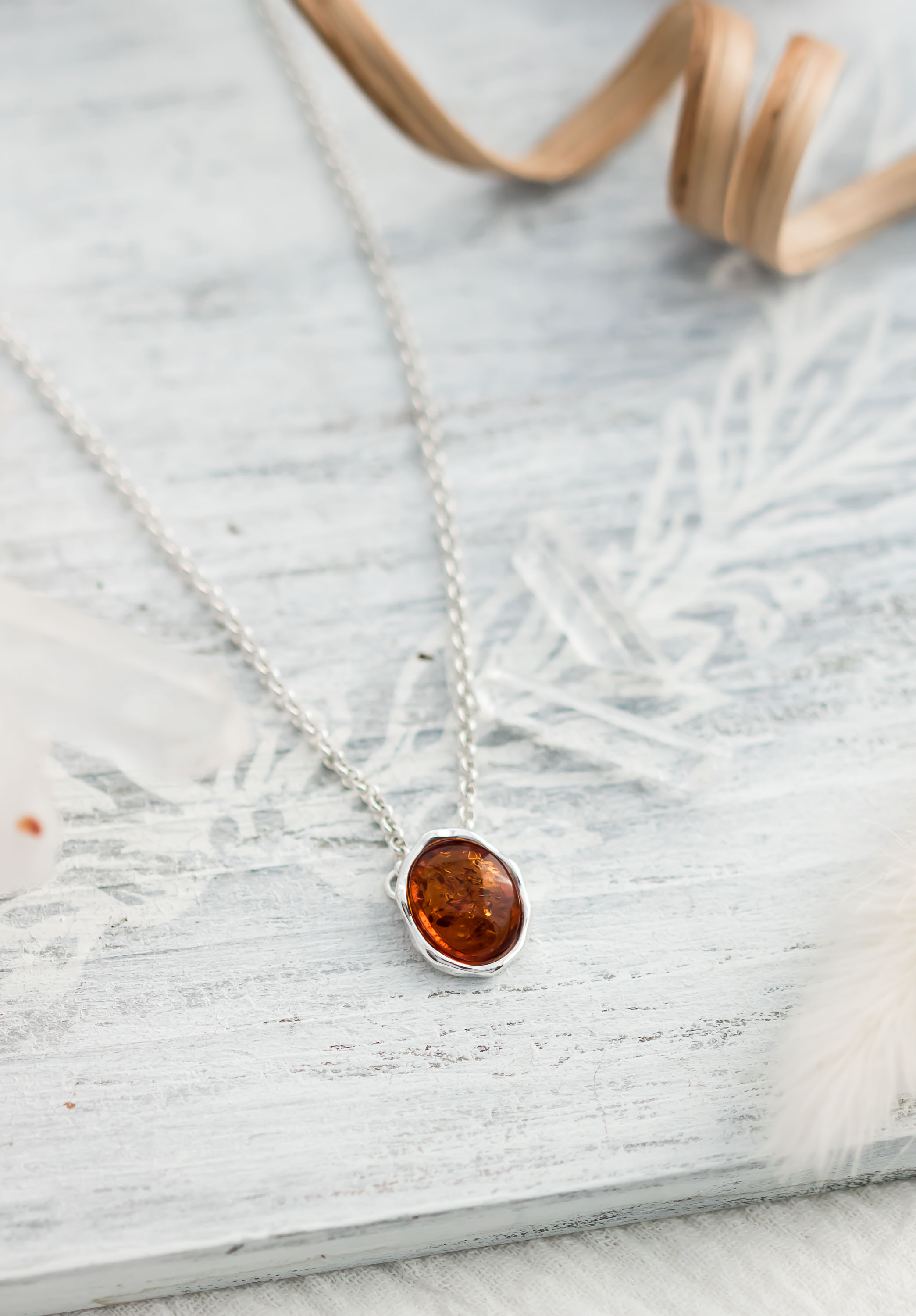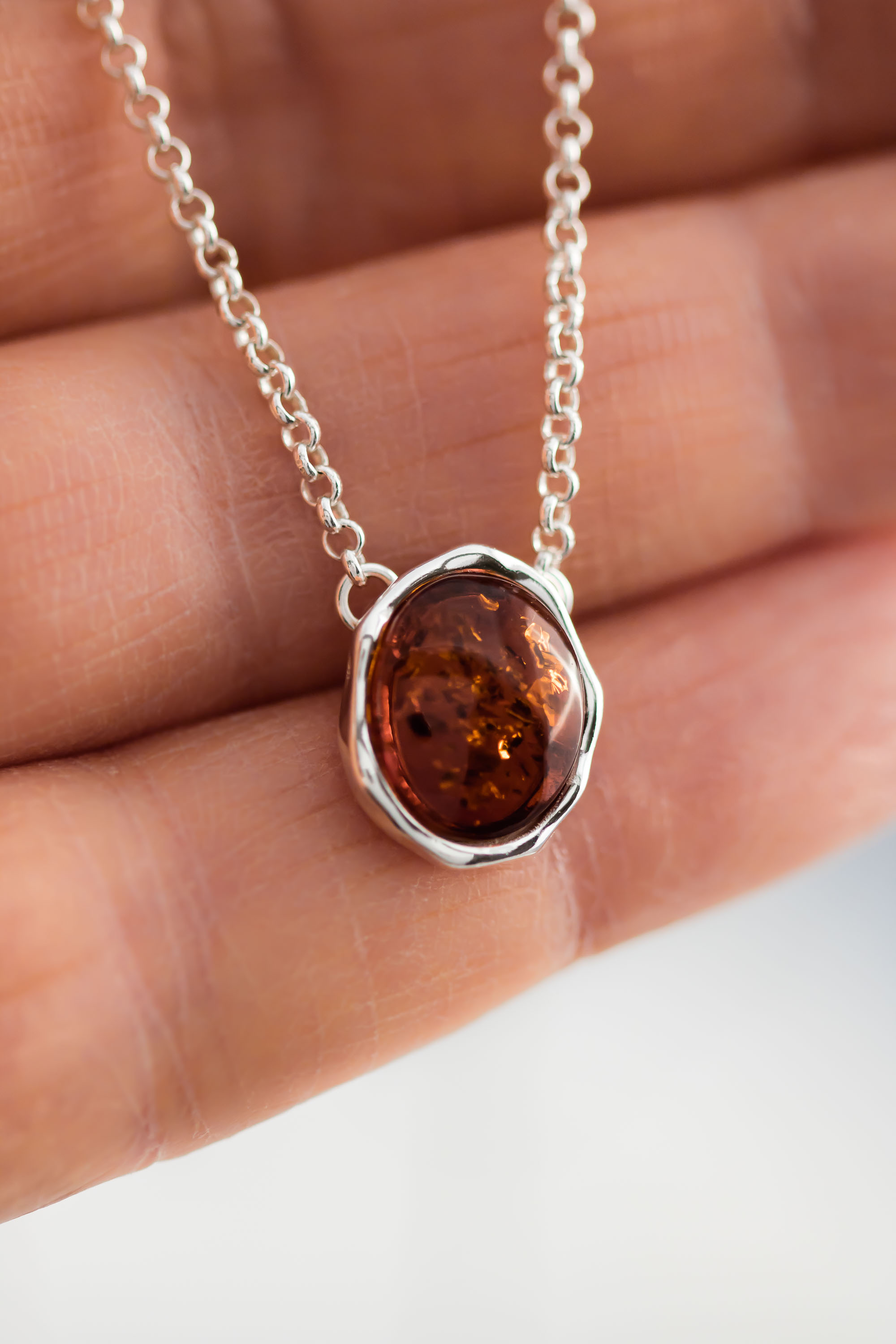 Showcases a dazzling 10mm x 8.5mm Baltic amber oval pendant with quirky, natural speckles