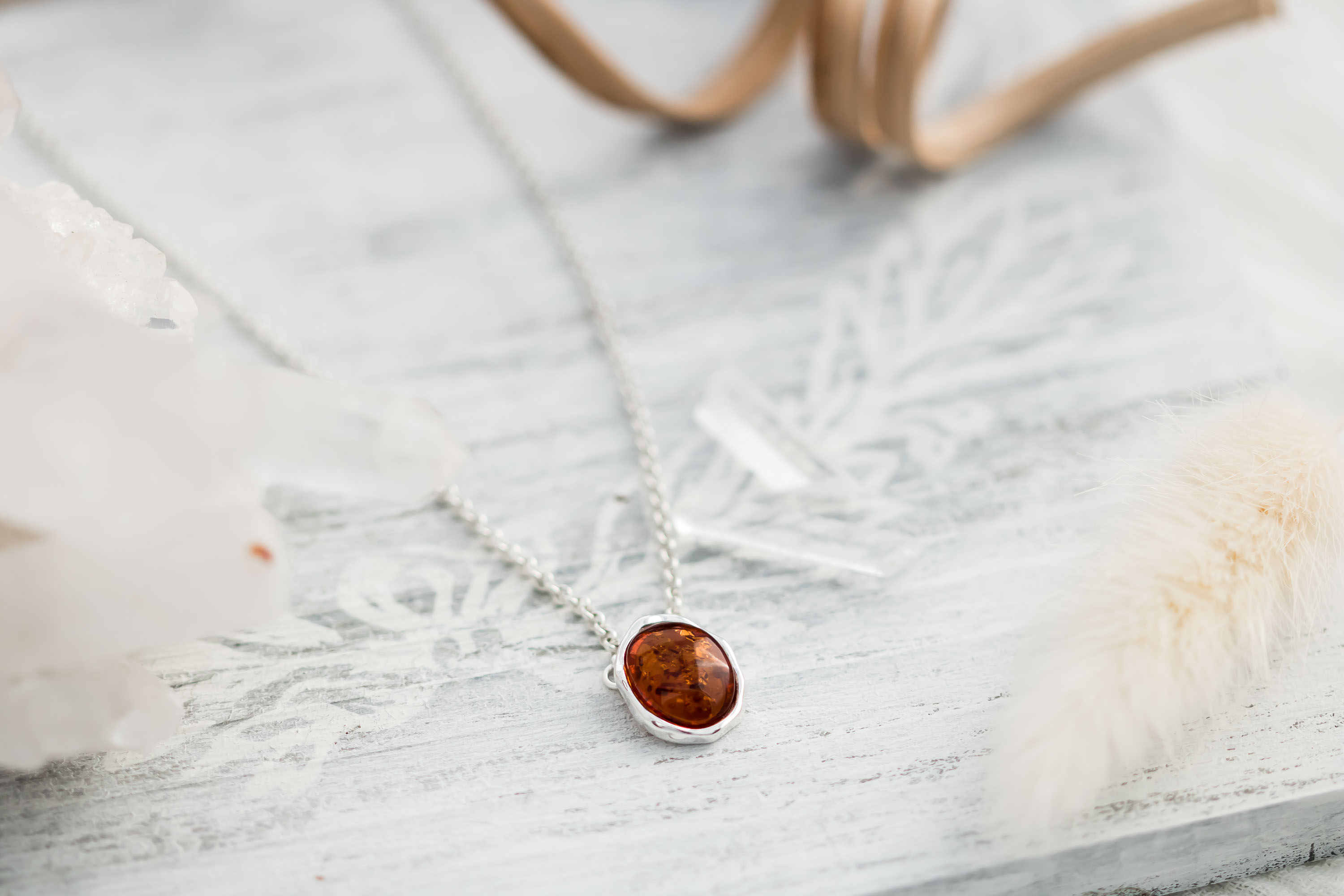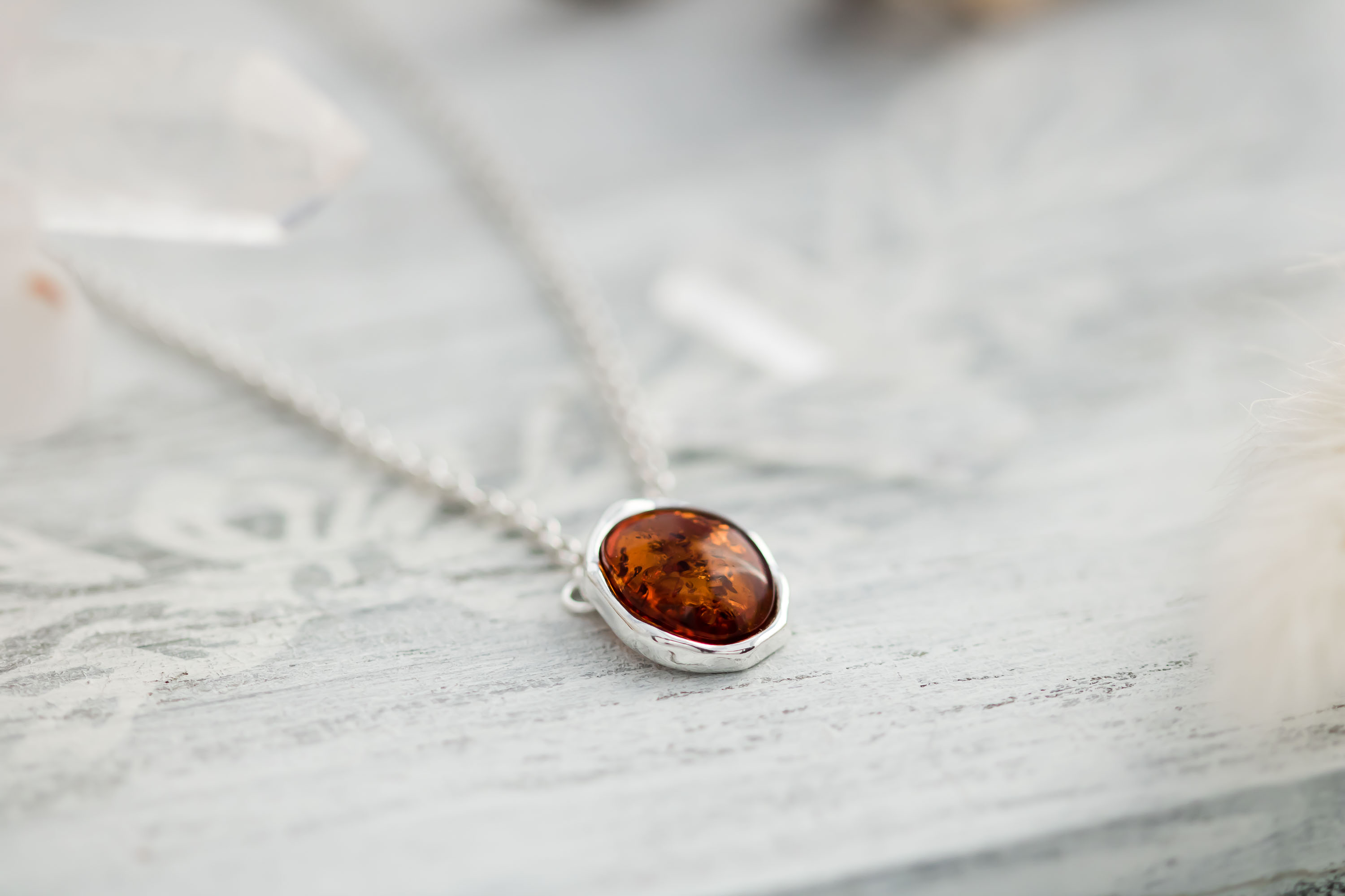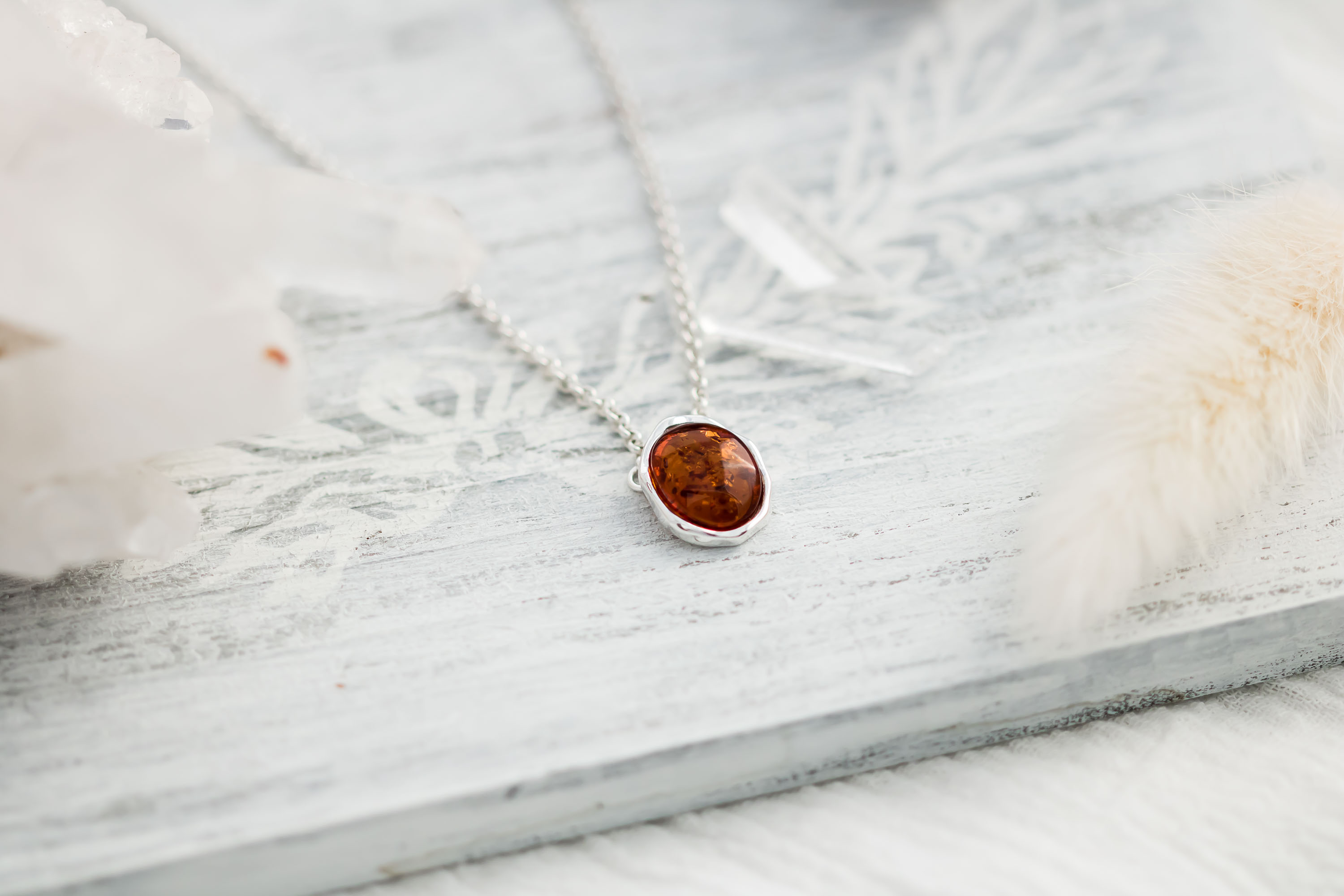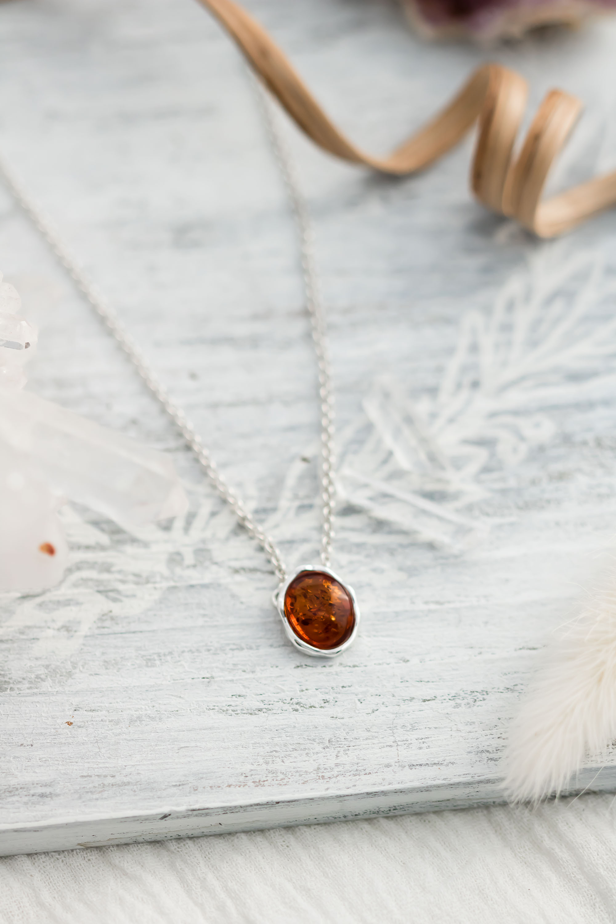 Showcases a dazzling 10mm x 8.5mm Baltic amber oval pendant with quirky, natural speckles