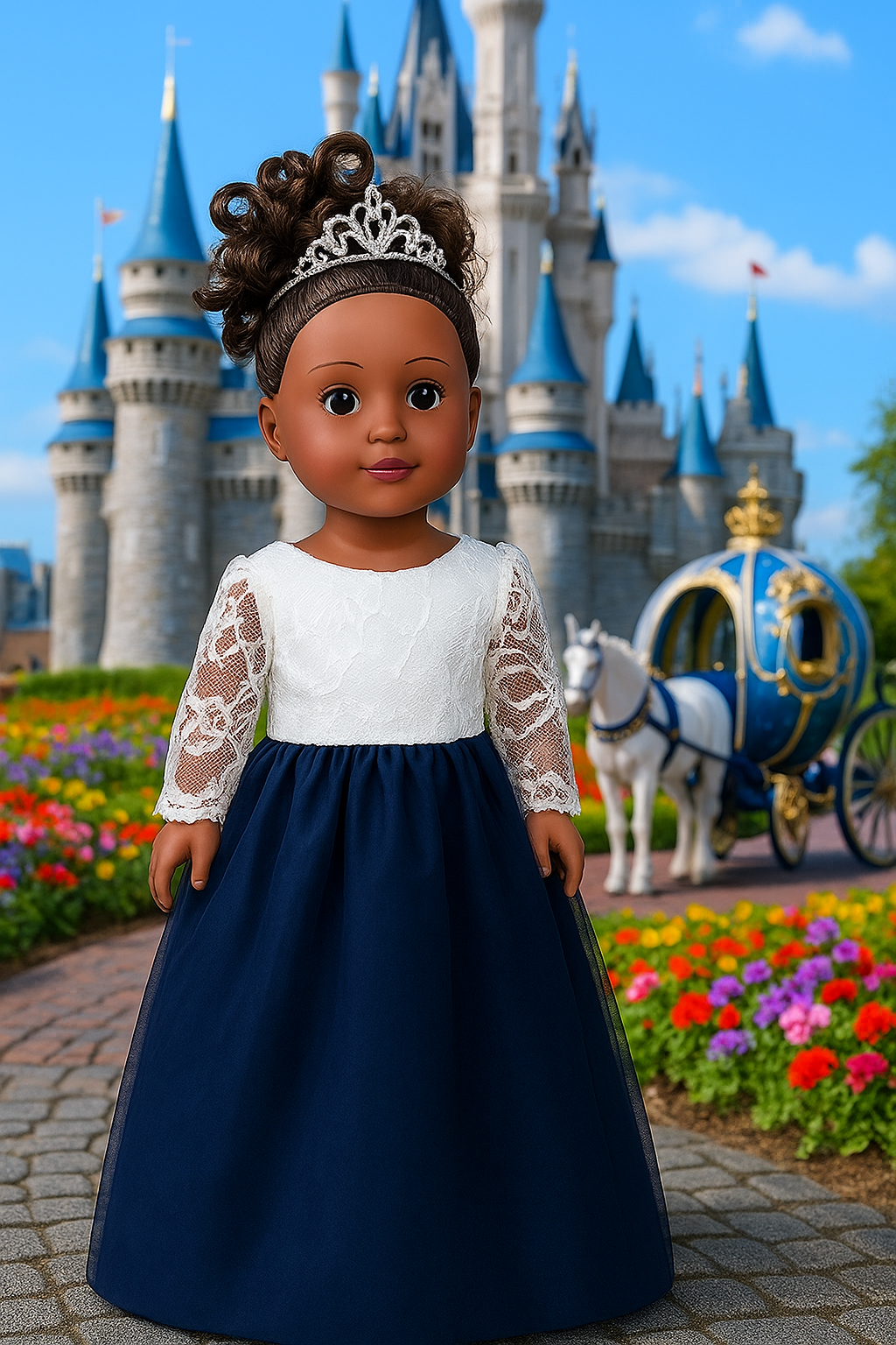 Ready to steal the spotlight, this dreamy lace flower girl doll dress is bursting with soft elegance and playful charm. Featuring a pastel mix of blue and off-white, this gown is trimmed in delicate lace and finished with a sparkling rhinestone buckle—because every doll deserves to dazzle!