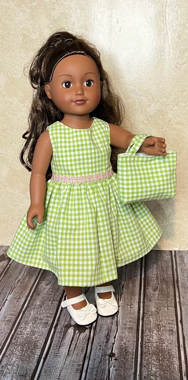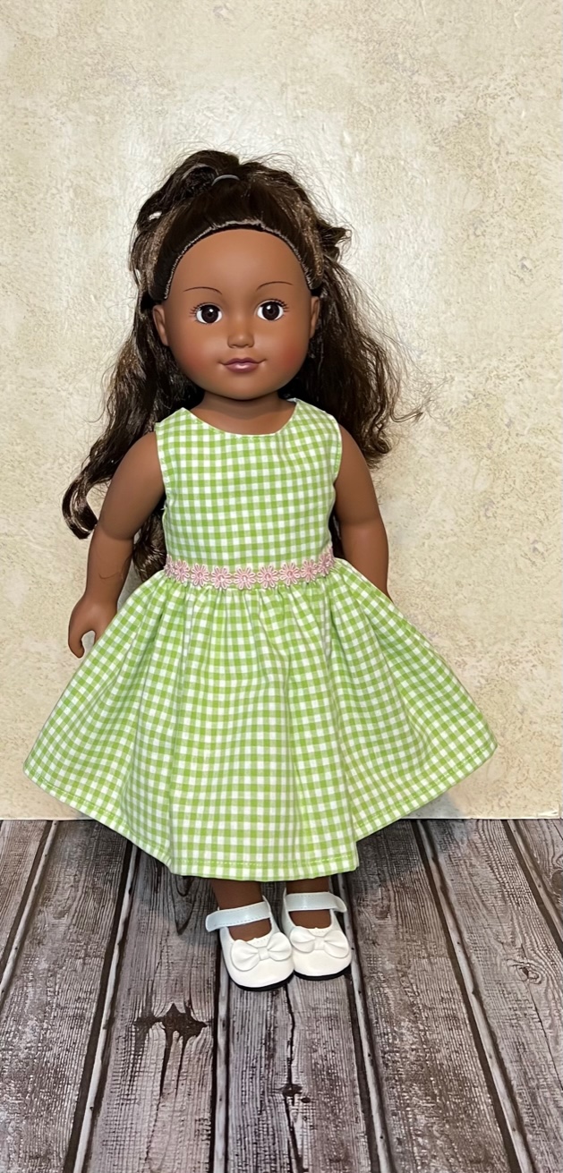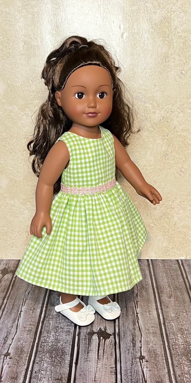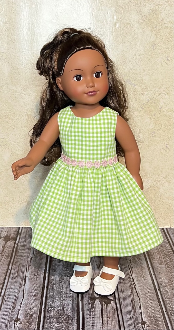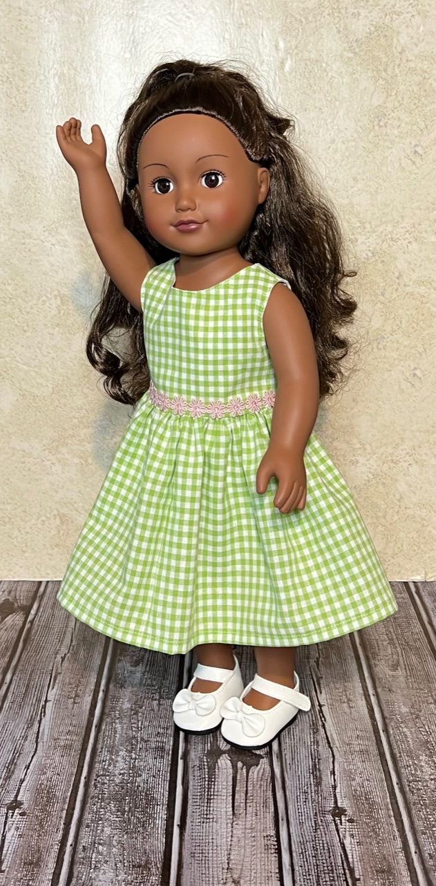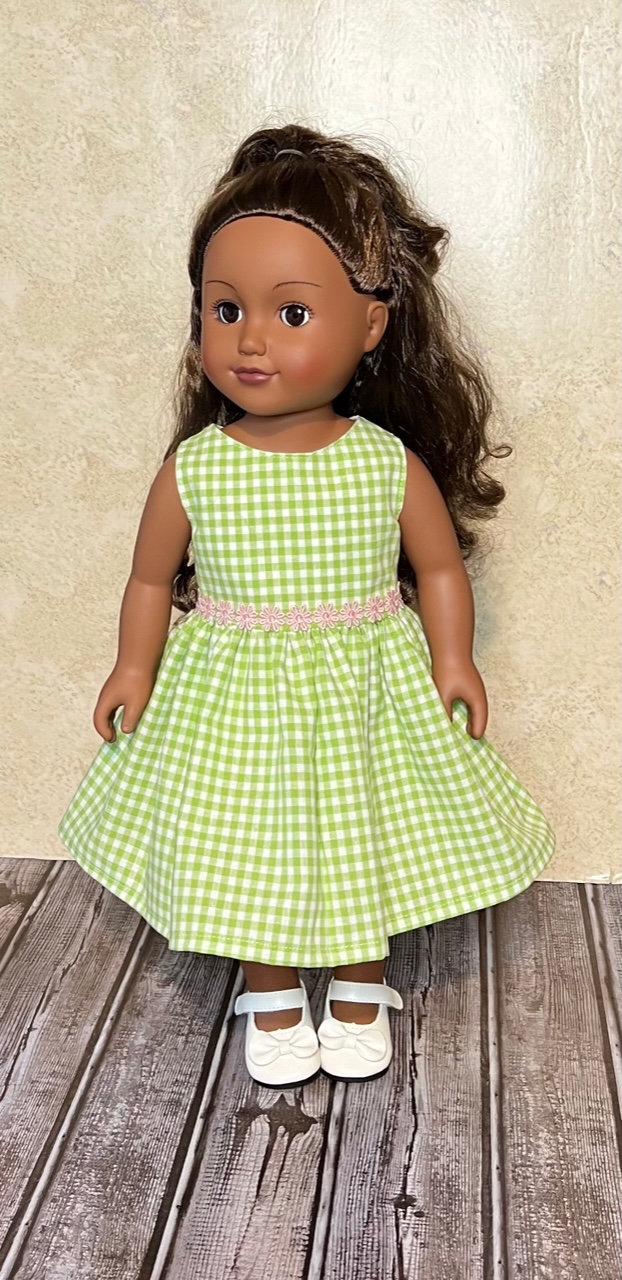 Fresh as a spring breeze and cute as a daisy, this green and white gingham doll dress is full of charm! With delicate pink daisy floral ribbon, this outfit is a cheerful nod to garden parties, Easter egg hunts, and sunny afternoons spent in imaginative play.