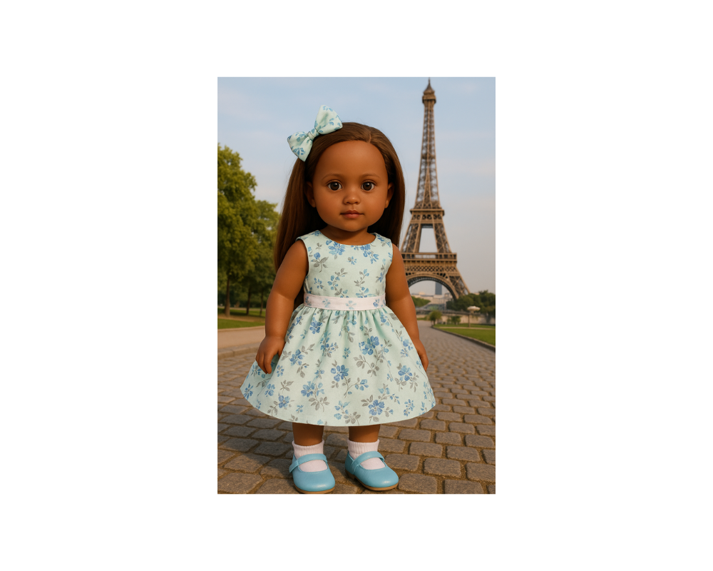 Let your doll soak up the sunshine in this cheerful summer dress, sprinkled with soft light-blue florals and trimmed in dainty white lace for just the right touch of charm. Each one is handmade with care from premium cotton—light, breathable, and perfect for warm-weather adventures, from backyard tea parties to garden strolls through the dollhouse.