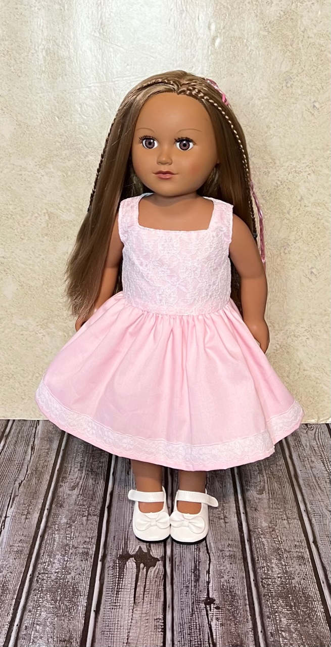 This beautiful pink doll dress, featuring white and a white underskirt, is 100% handcrafted from premium cotton fabric. It includes convenient hook-and-loop closure at the back for easy dressing. This dress is perfect for birthdays, Christmas, Hanukkah, Valentine’s Day, Easter, or just because! Ideal for any child or doll collector.