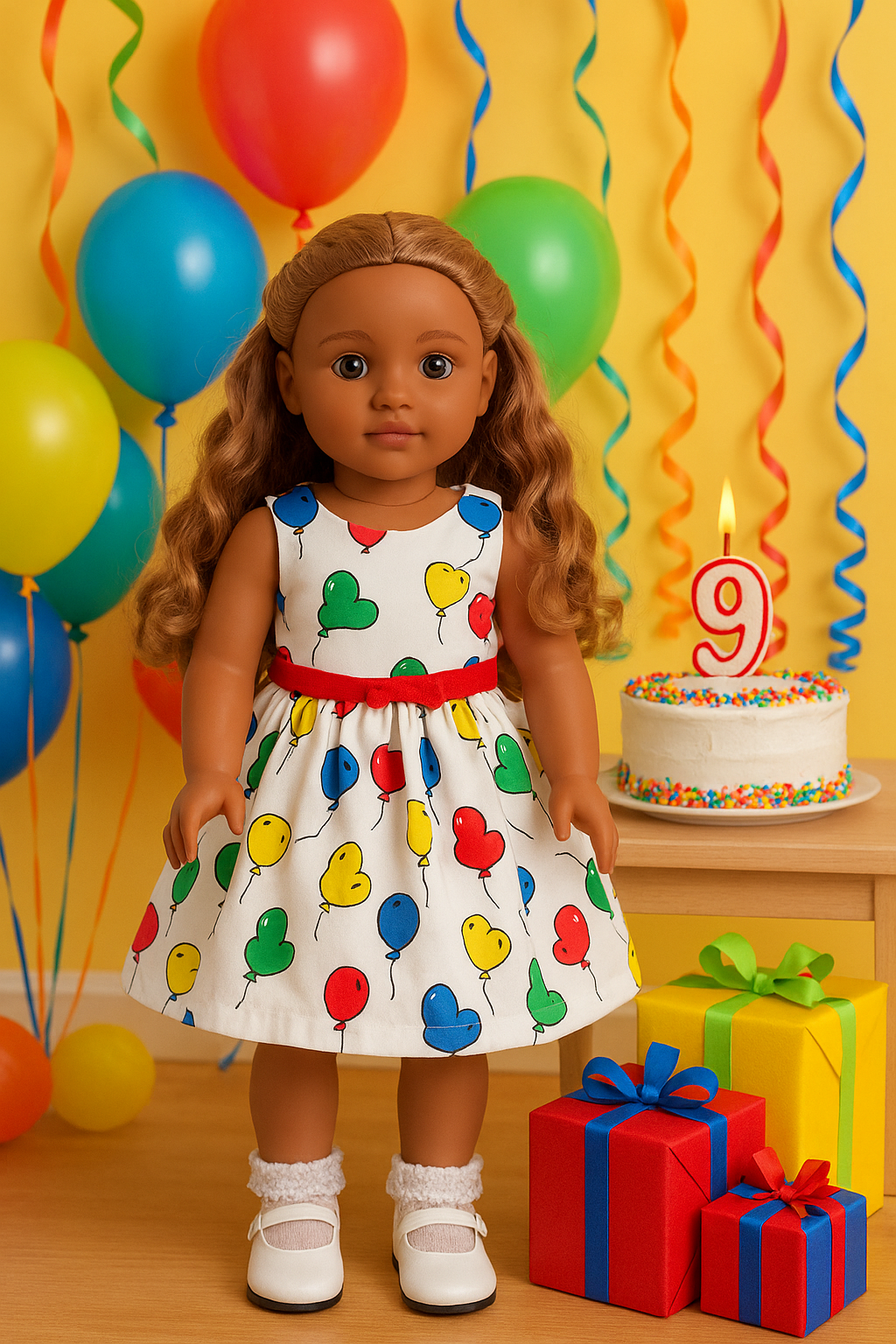 This delightful doll dress features vibrant Happy Birthday balloons, perfect for any special occasion. Here are the details:
