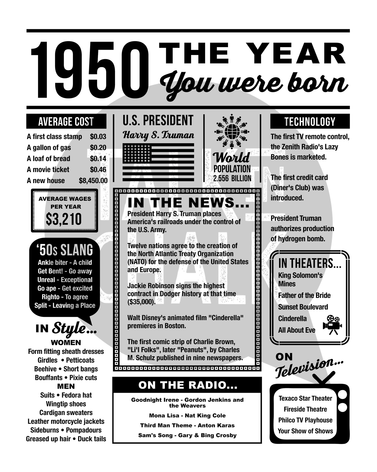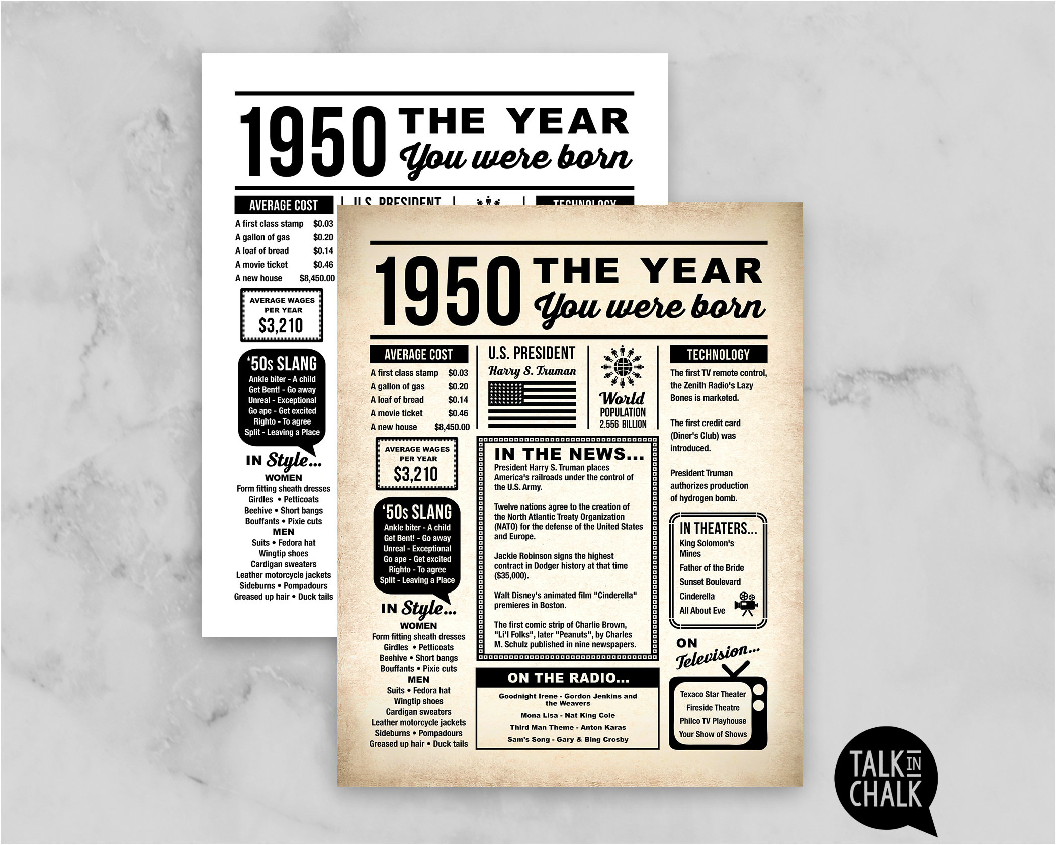 Take a trip down memory lane with this "1950 Year You Were Born" printable newspaper poster! Packed with fun facts, pop culture highlights, and key historical moments, this retro-inspired design makes the perfect conversation starter for any celebration. Includes two versions, a newspaper background and a black and white version.