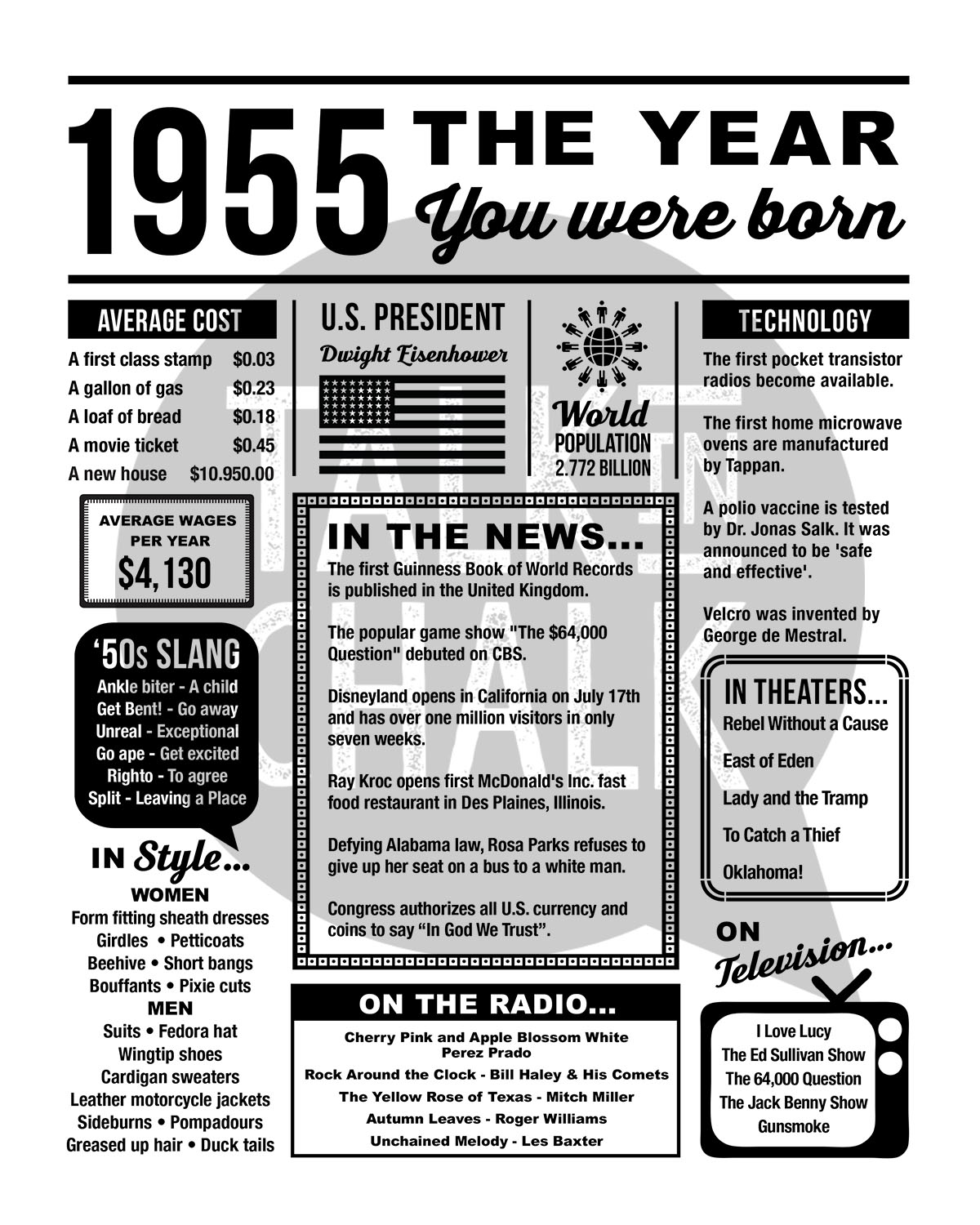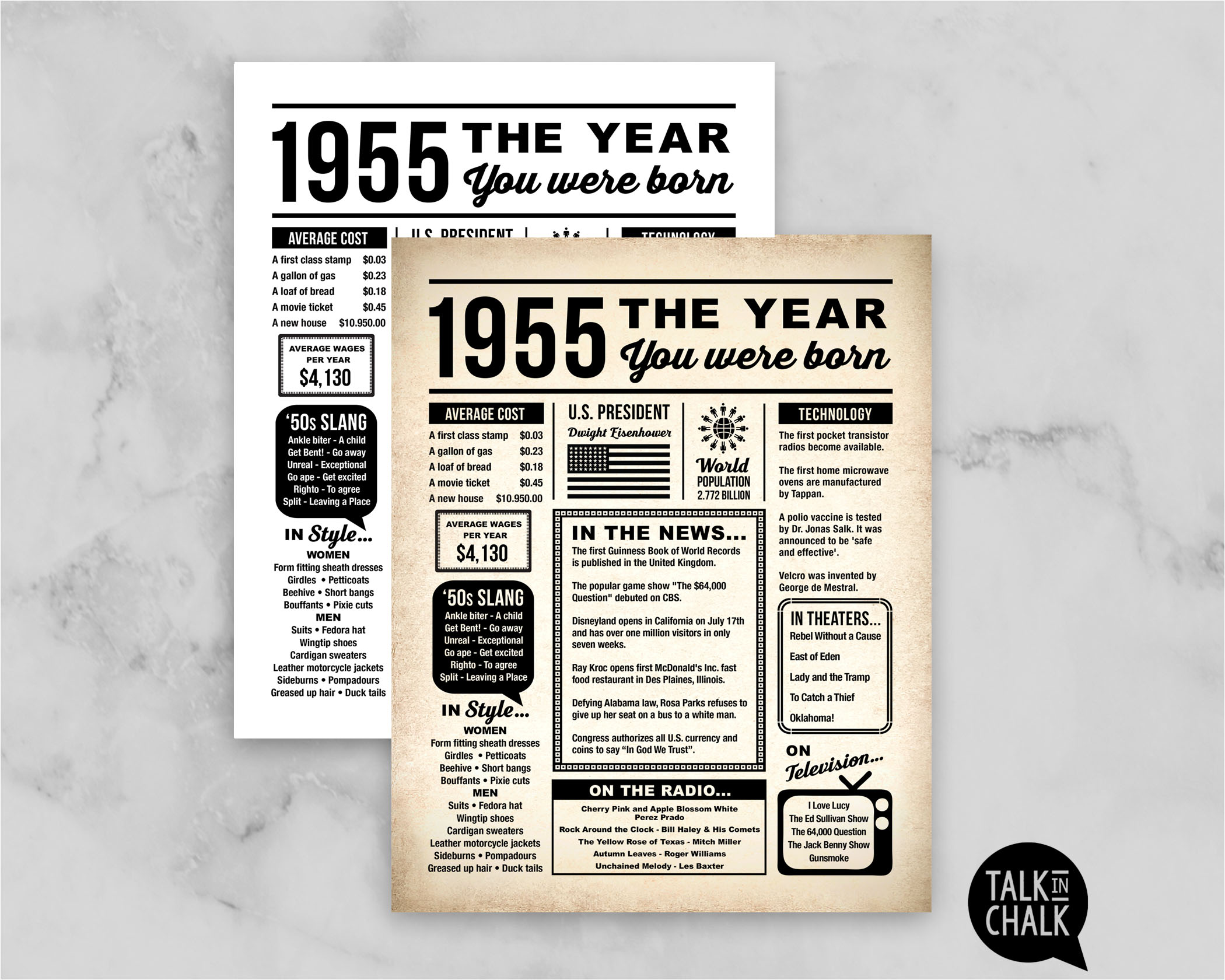 Take a trip down memory lane with this "1955 Year You Were Born" printable newspaper poster! Packed with fun facts, pop culture highlights, and key historical moments, this retro-inspired design makes the perfect conversation starter for any celebration. Includes two versions, a newspaper background and a black and white version.