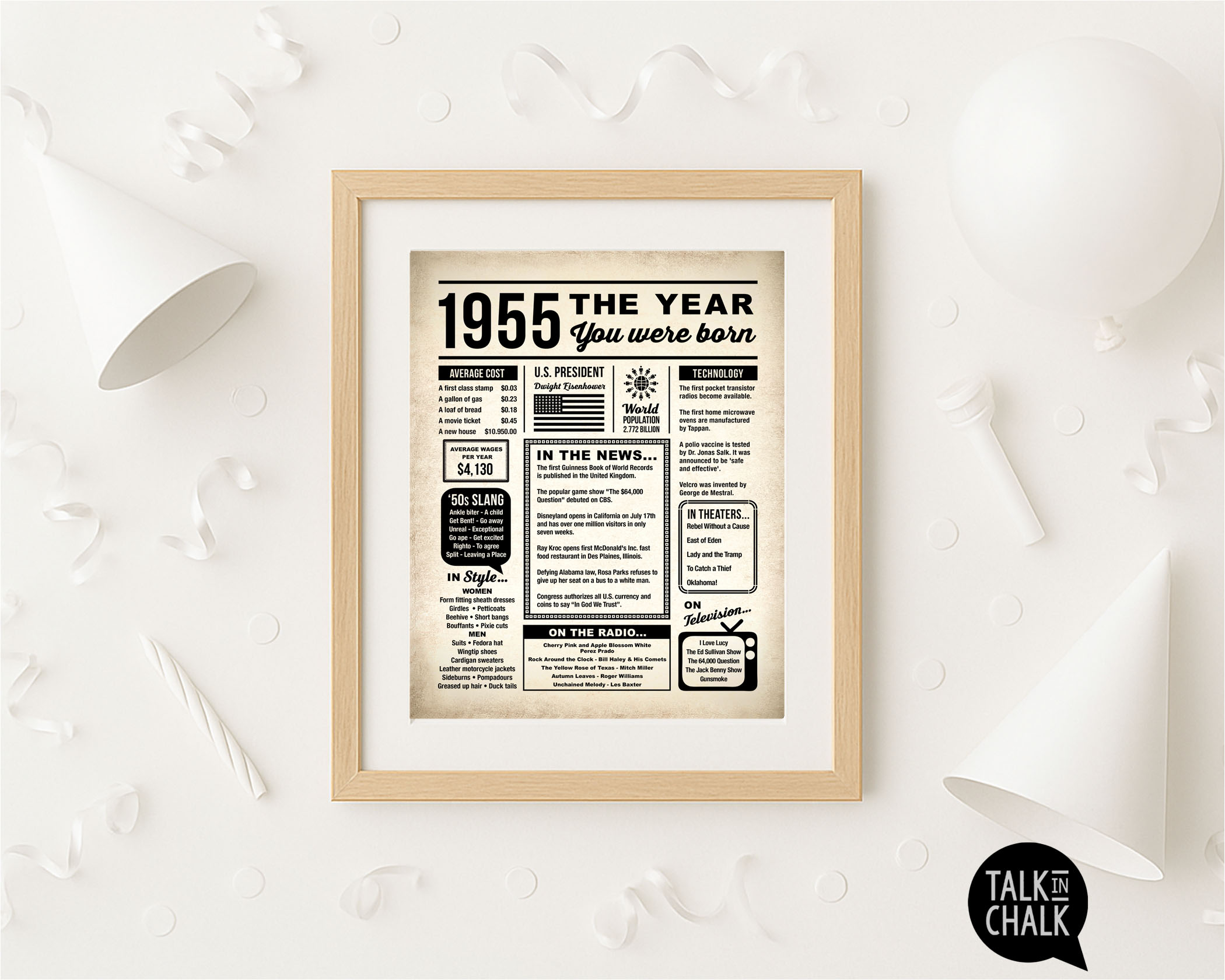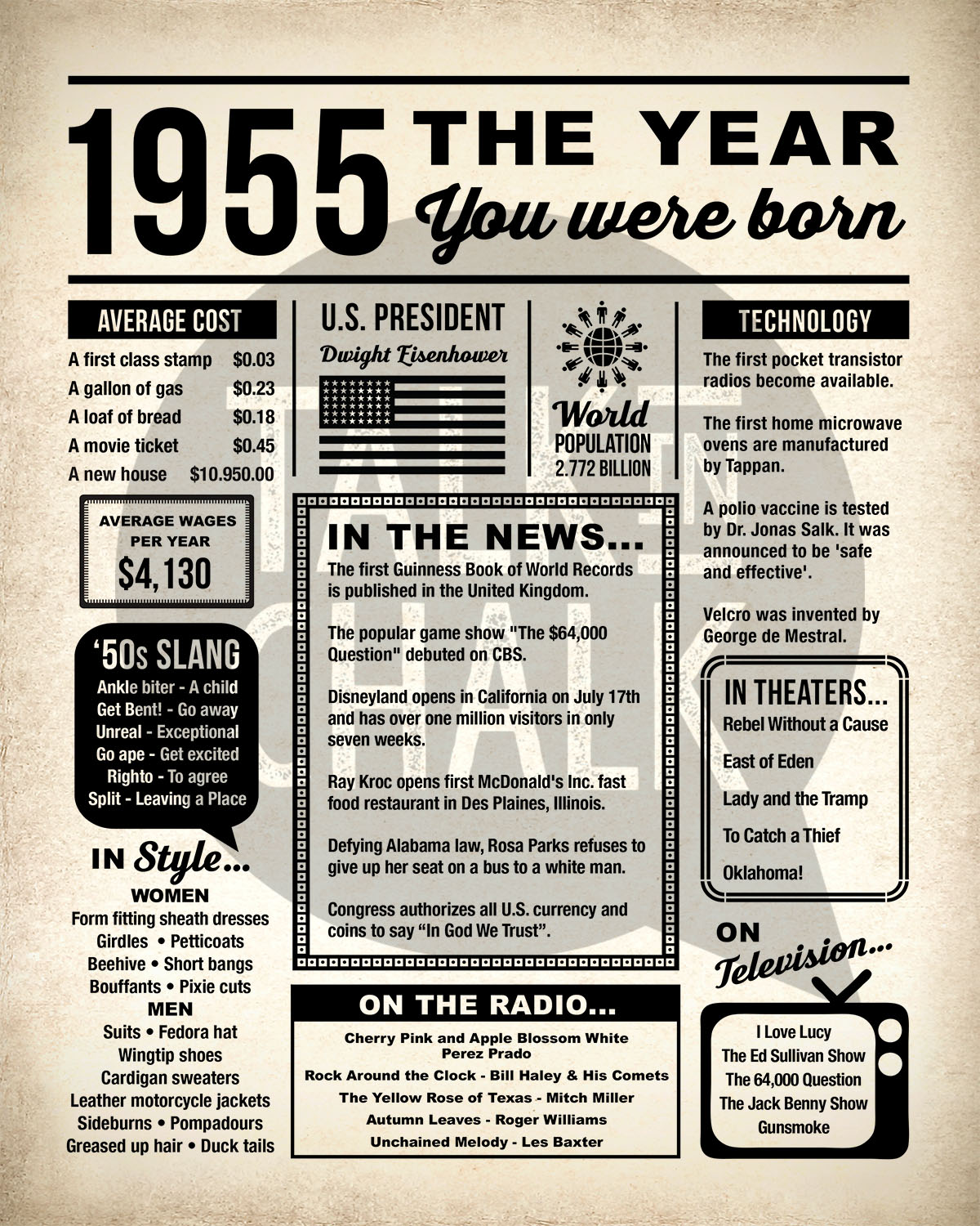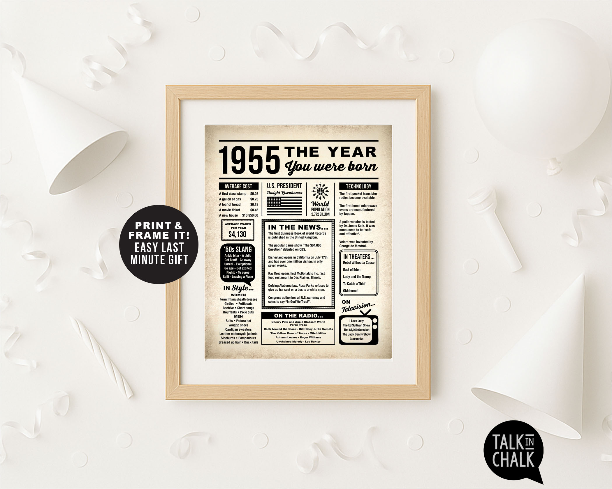1955 The Year You Were Born Printable Newspaper Poster for 70th Birthday - Last Minute Gift