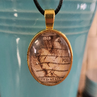 The pendant is made from a real, canceled stamp encased in glass with a shiny silver finish. It is a little over an inch in diameter. Each necklace comes with a 18 inch black , woven cord.