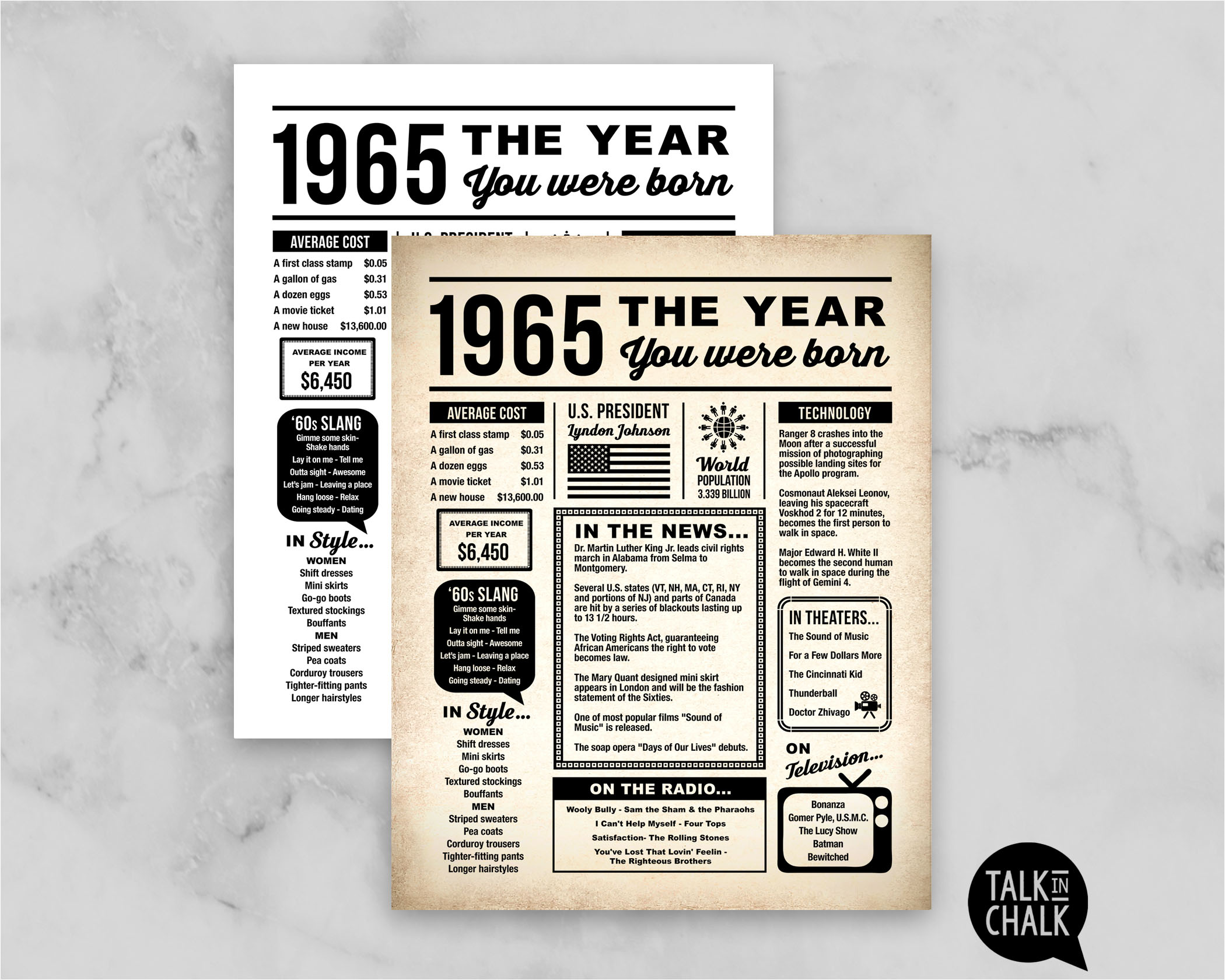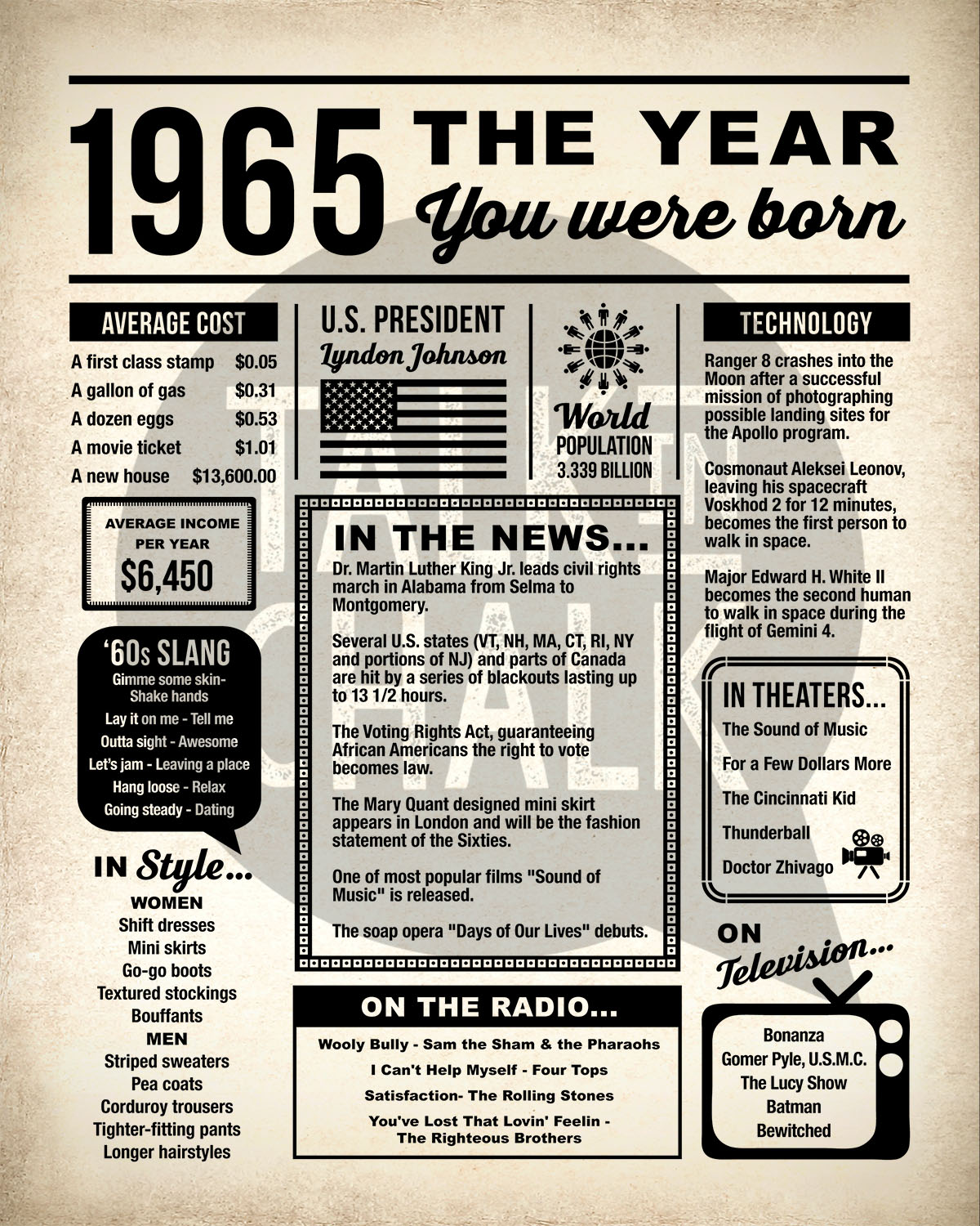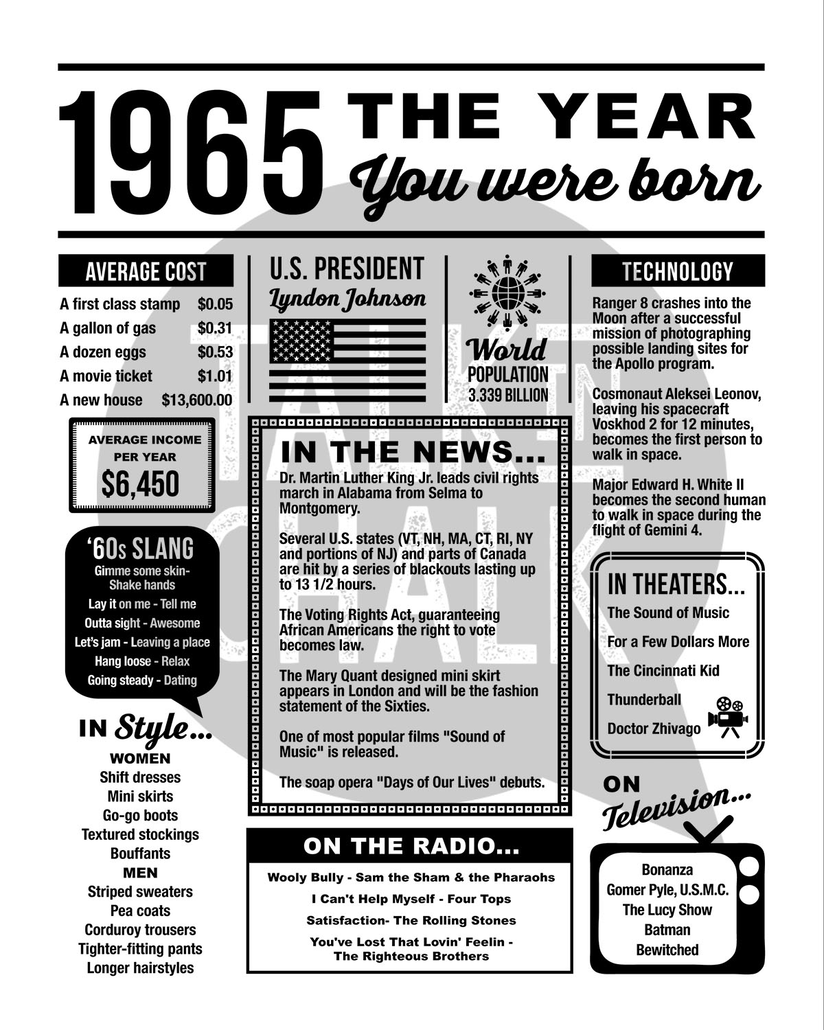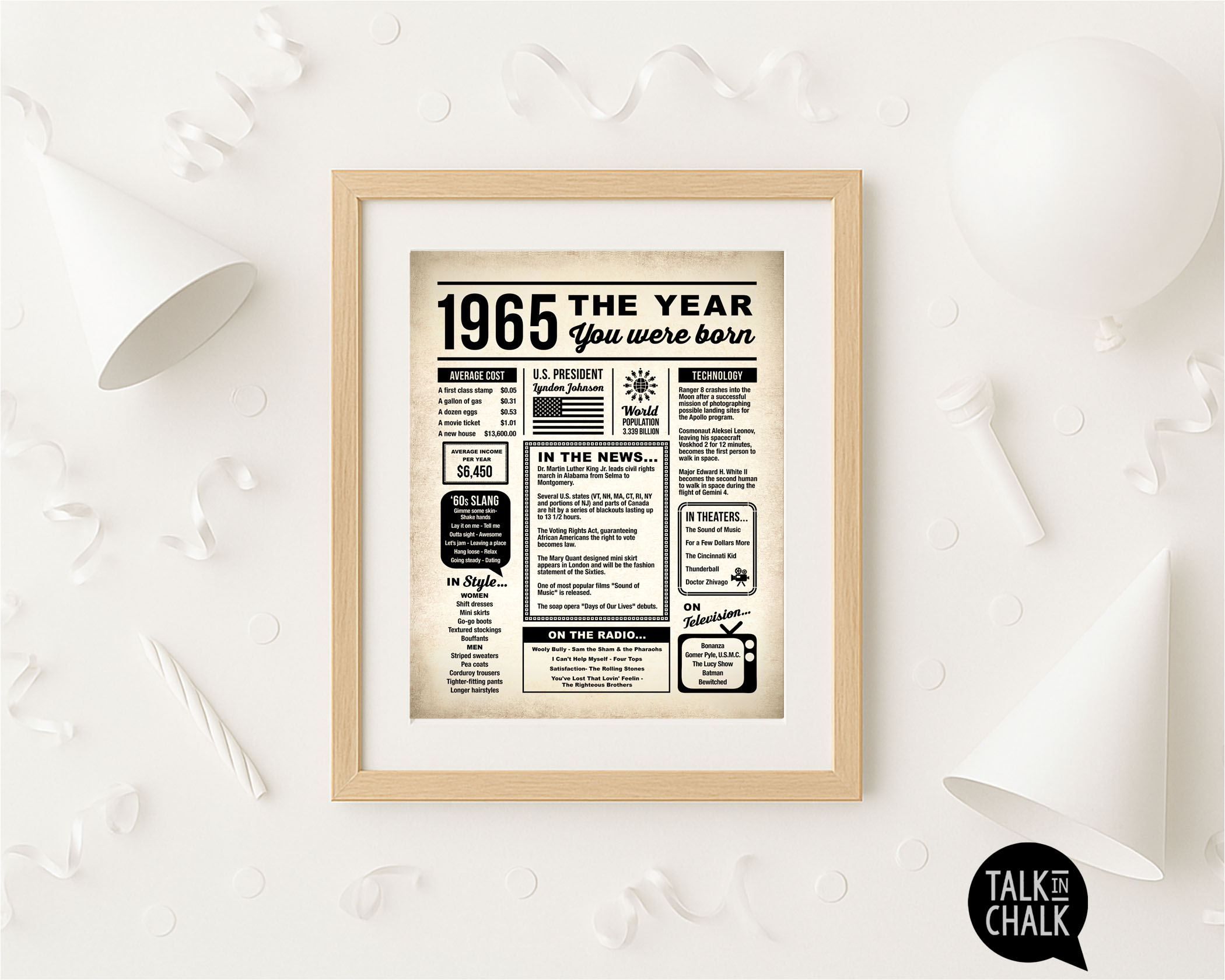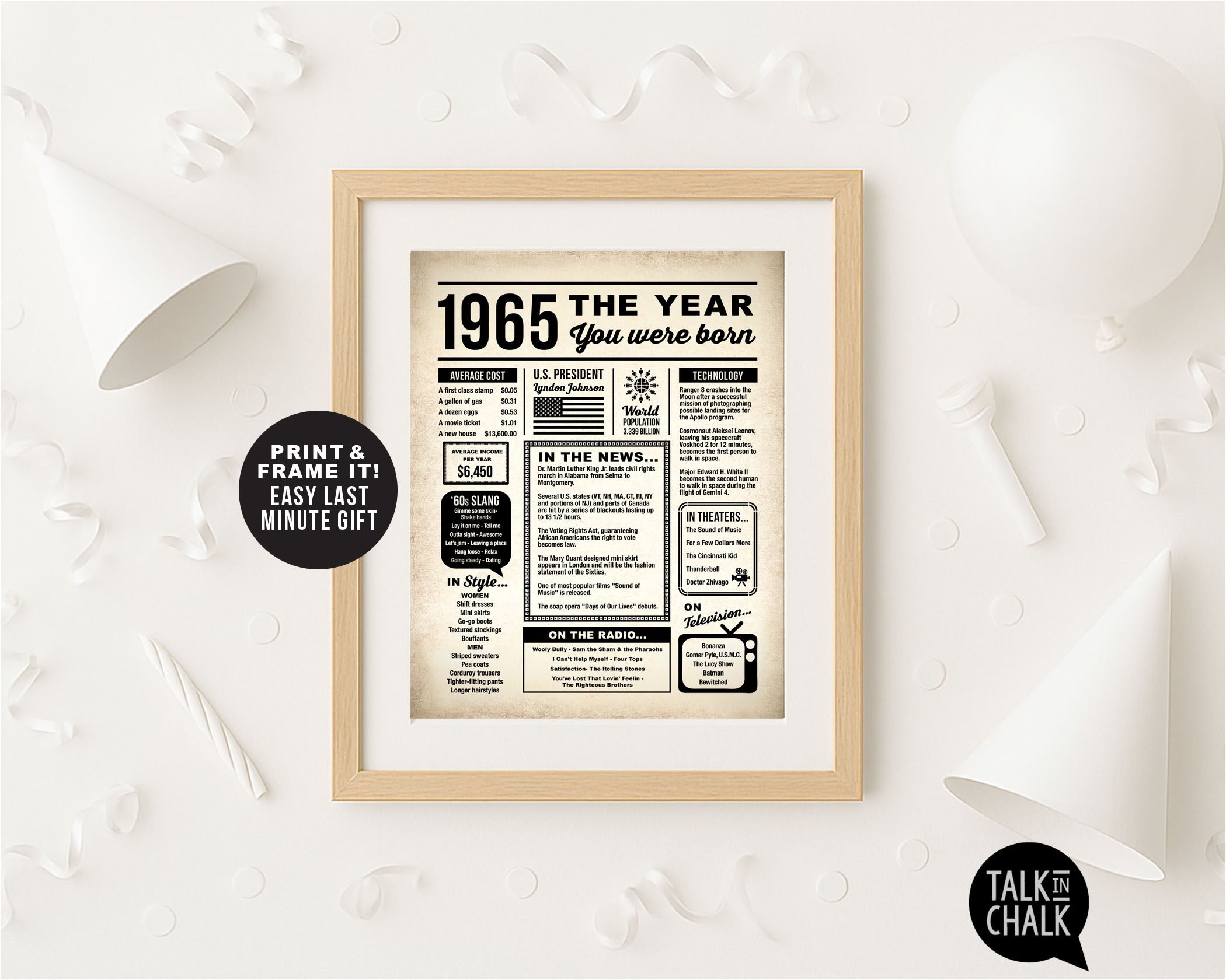 1965 The Year You Were Born Printable Newspaper Poster for 60th Birthday - Last Minute Gift