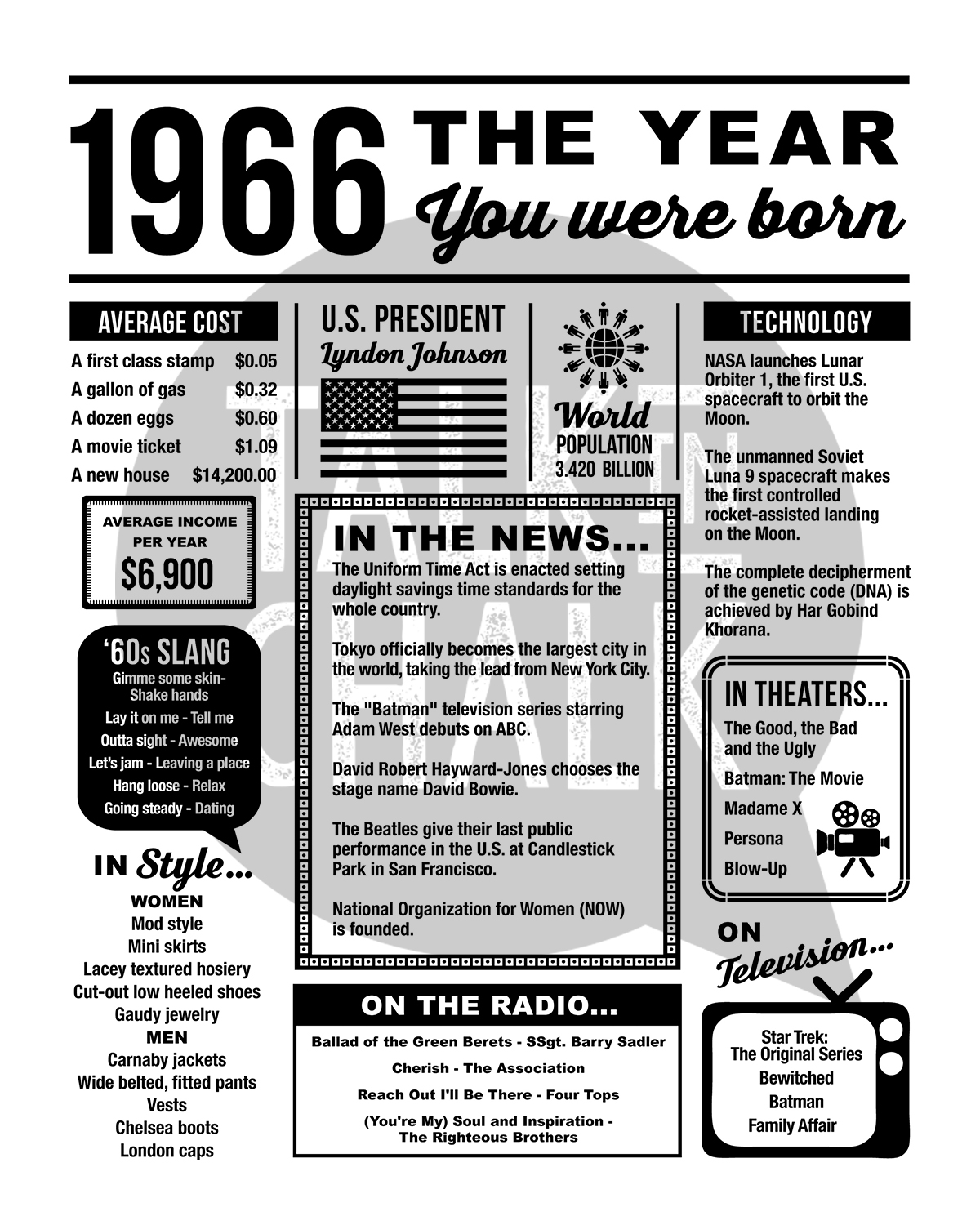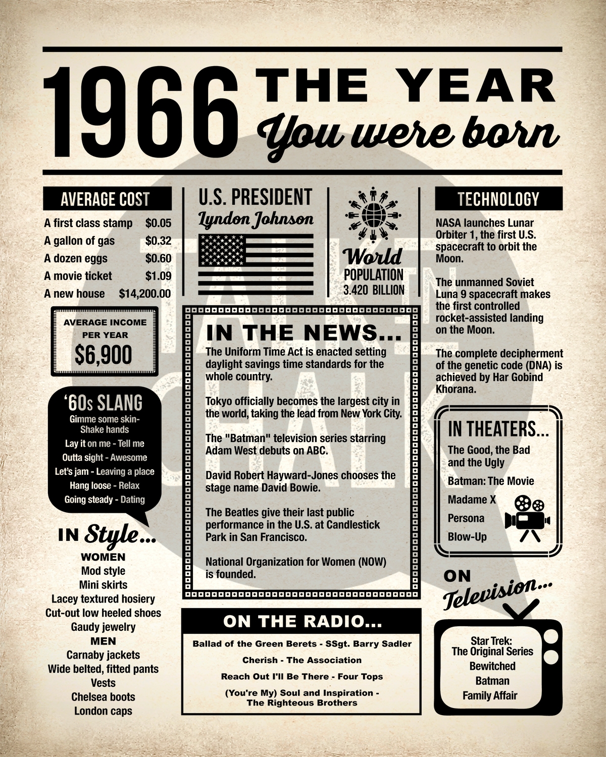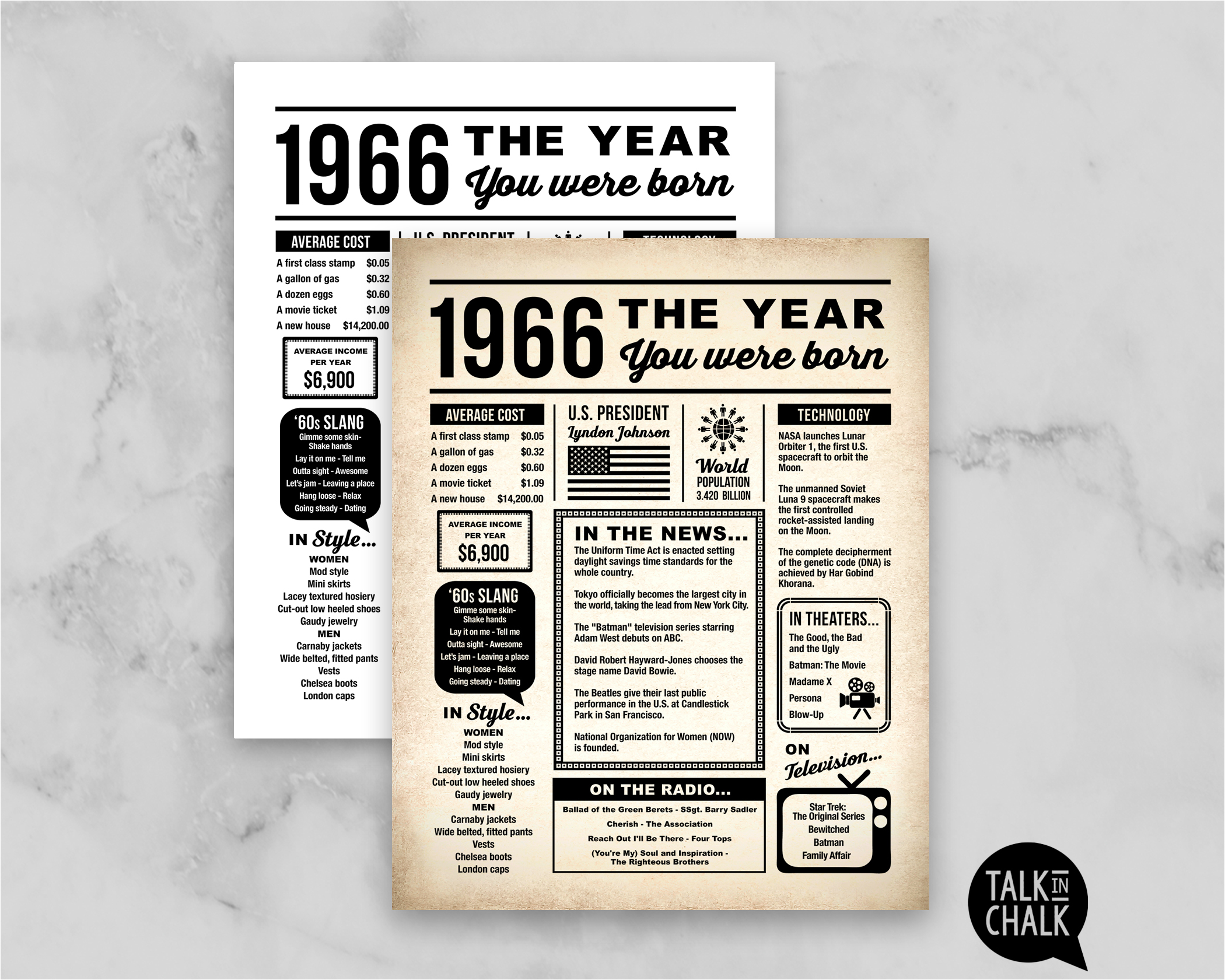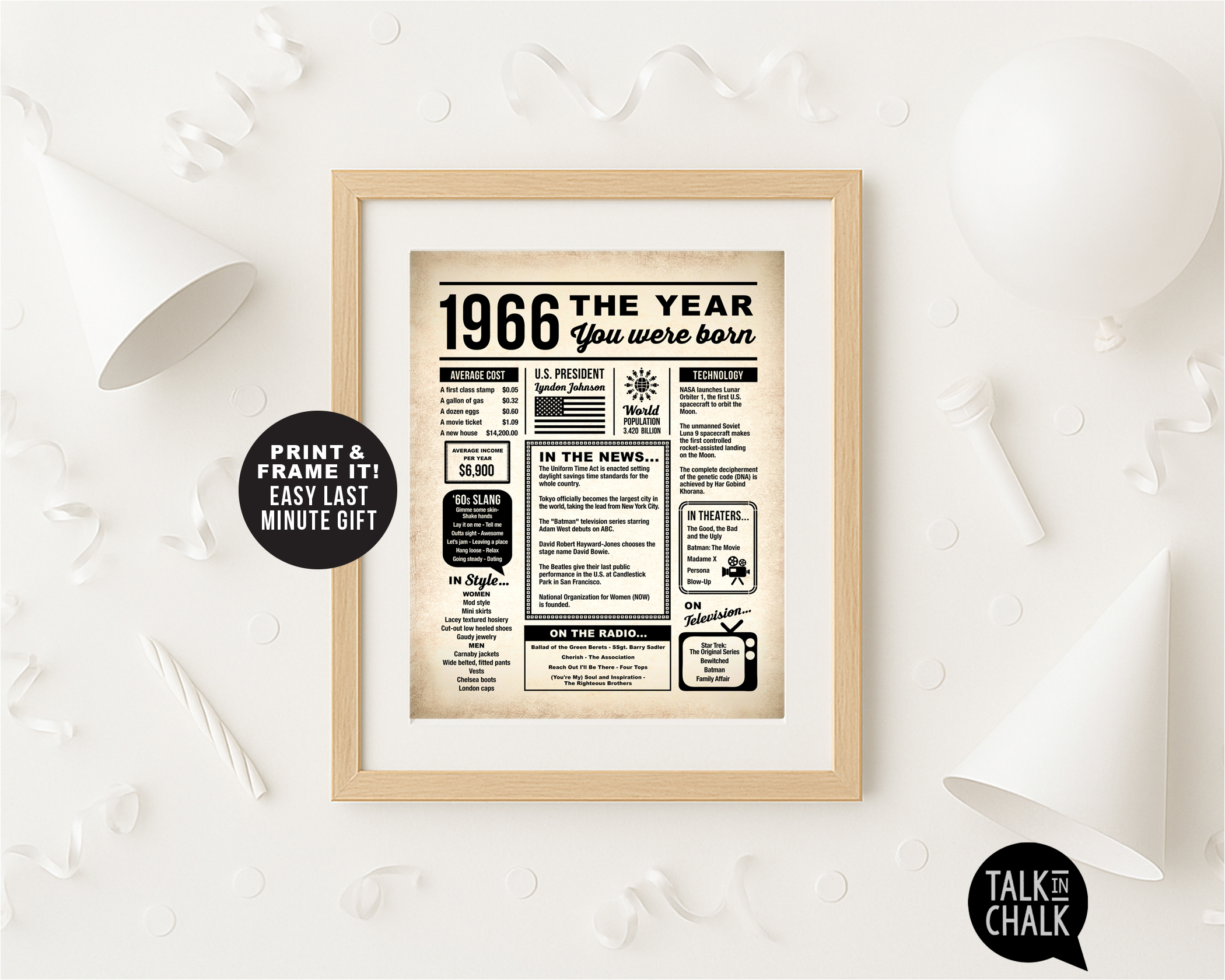1966 The Year You Were Born Printable Newspaper Poster for 50th Birthday - Last Minute Gift