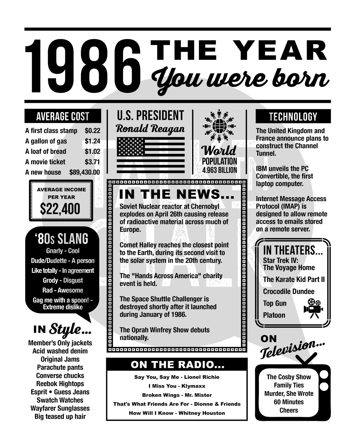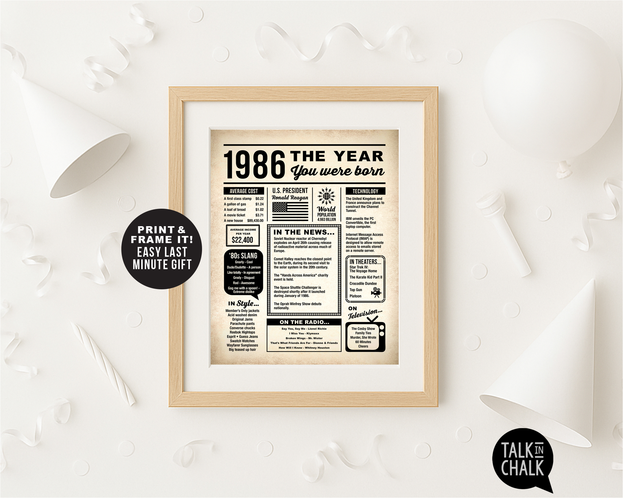 1986 The Year You Were Born Printable Newspaper Poster for 40th Birthday - Last Minute Gift