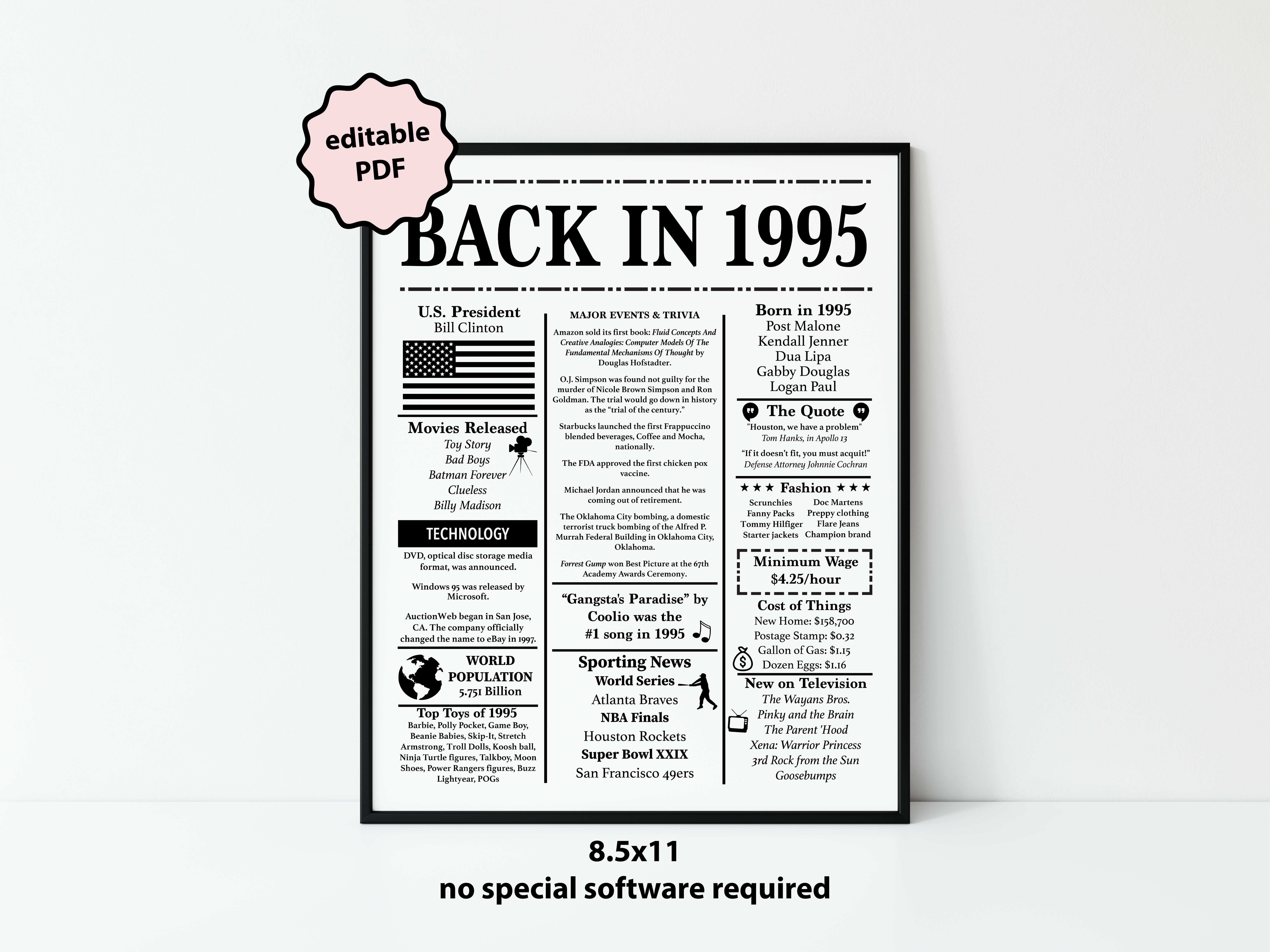 Dive into nostalgia with this 1995 Instant Download! Perfect for birthdays, anniversaries, reunions, or creating a time capsule filled with memories! This print is packed with fun and fascinating facts from 1995 that will spark conversations and give everyone a blast from the past!