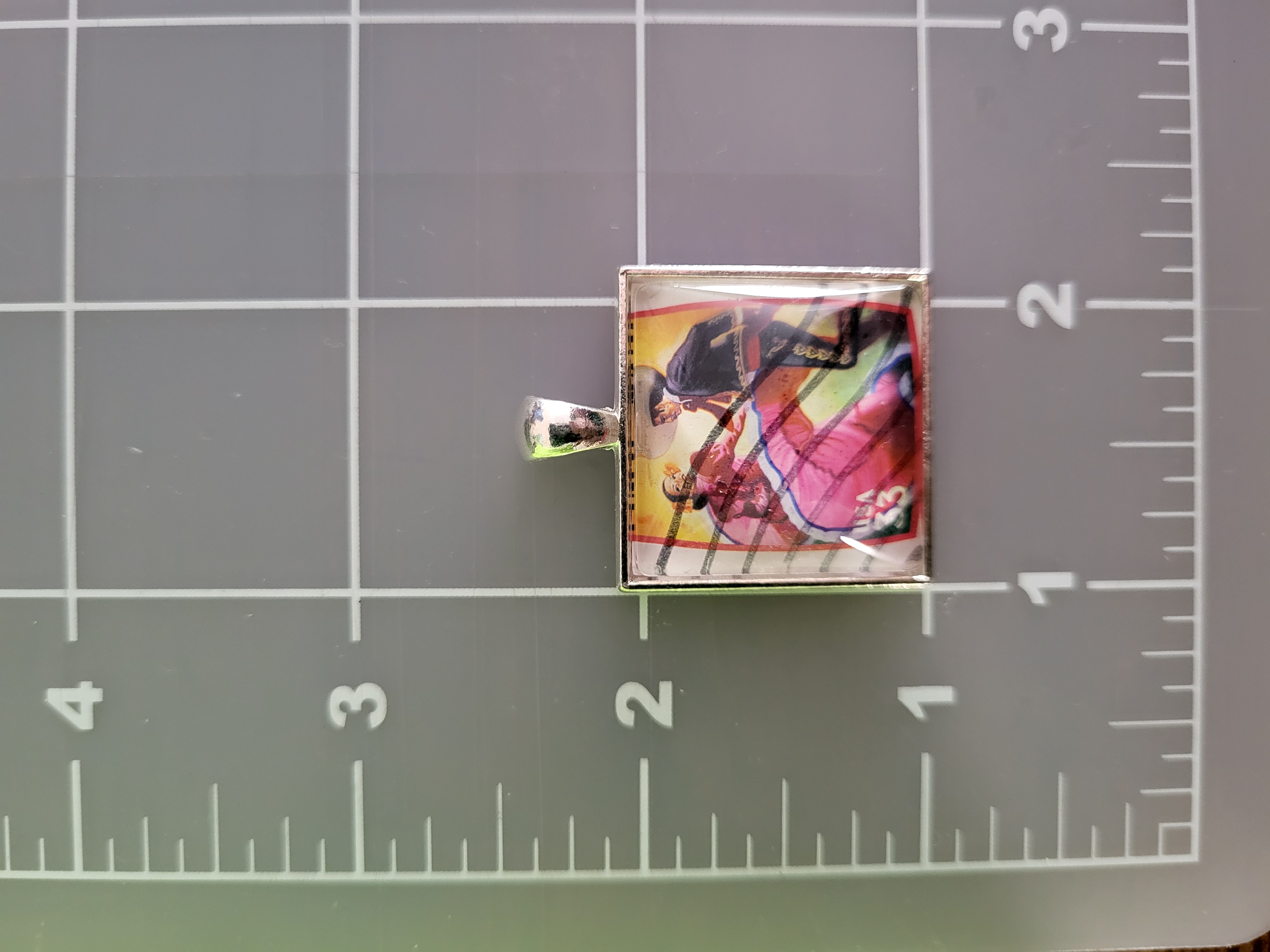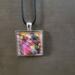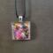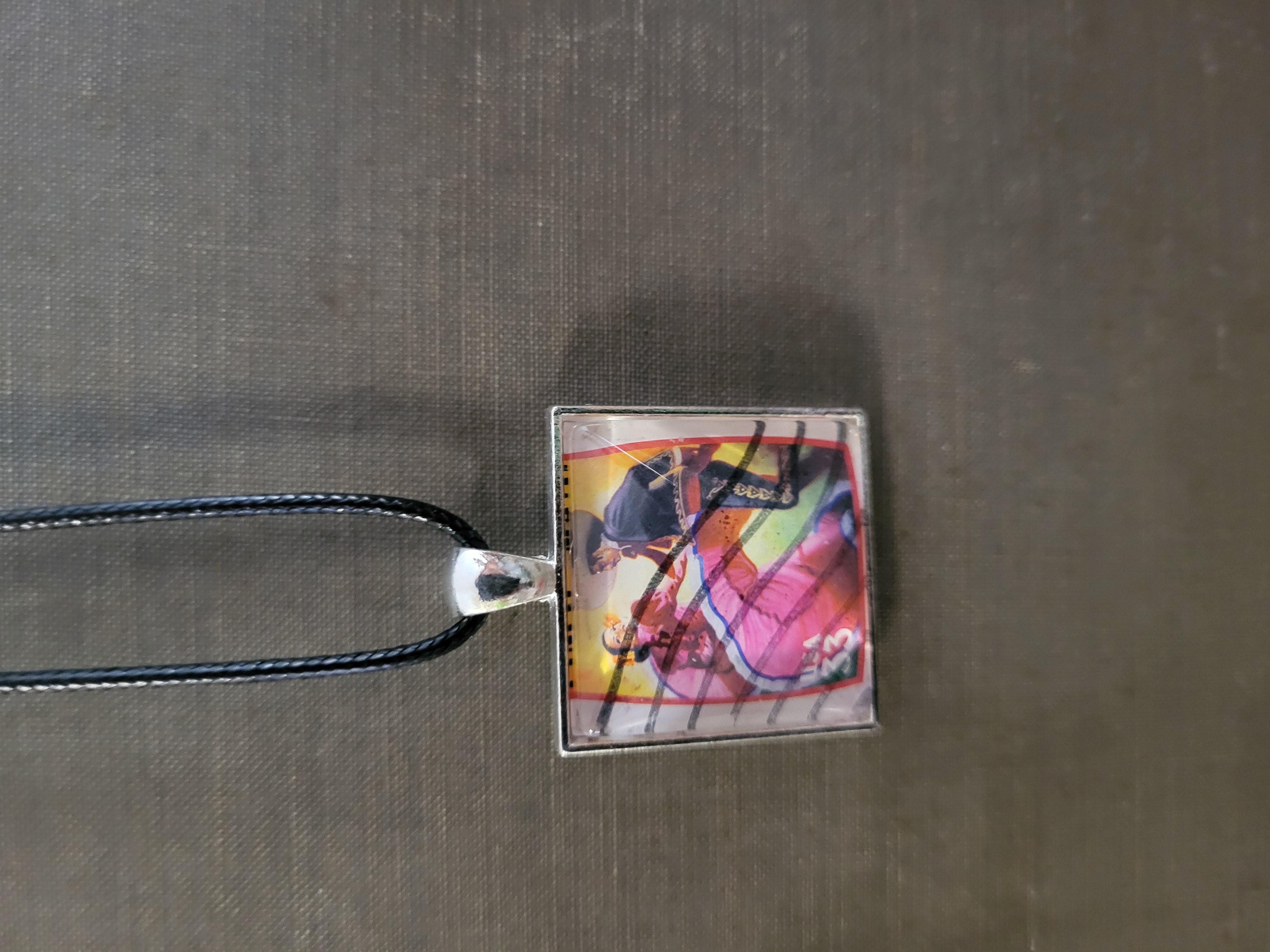 The pendant is made from a real, canceled stamp encased in glass with a shiny silver finish. It is a little over an inch across. Each necklace comes with a 18 inch black, woven cord.