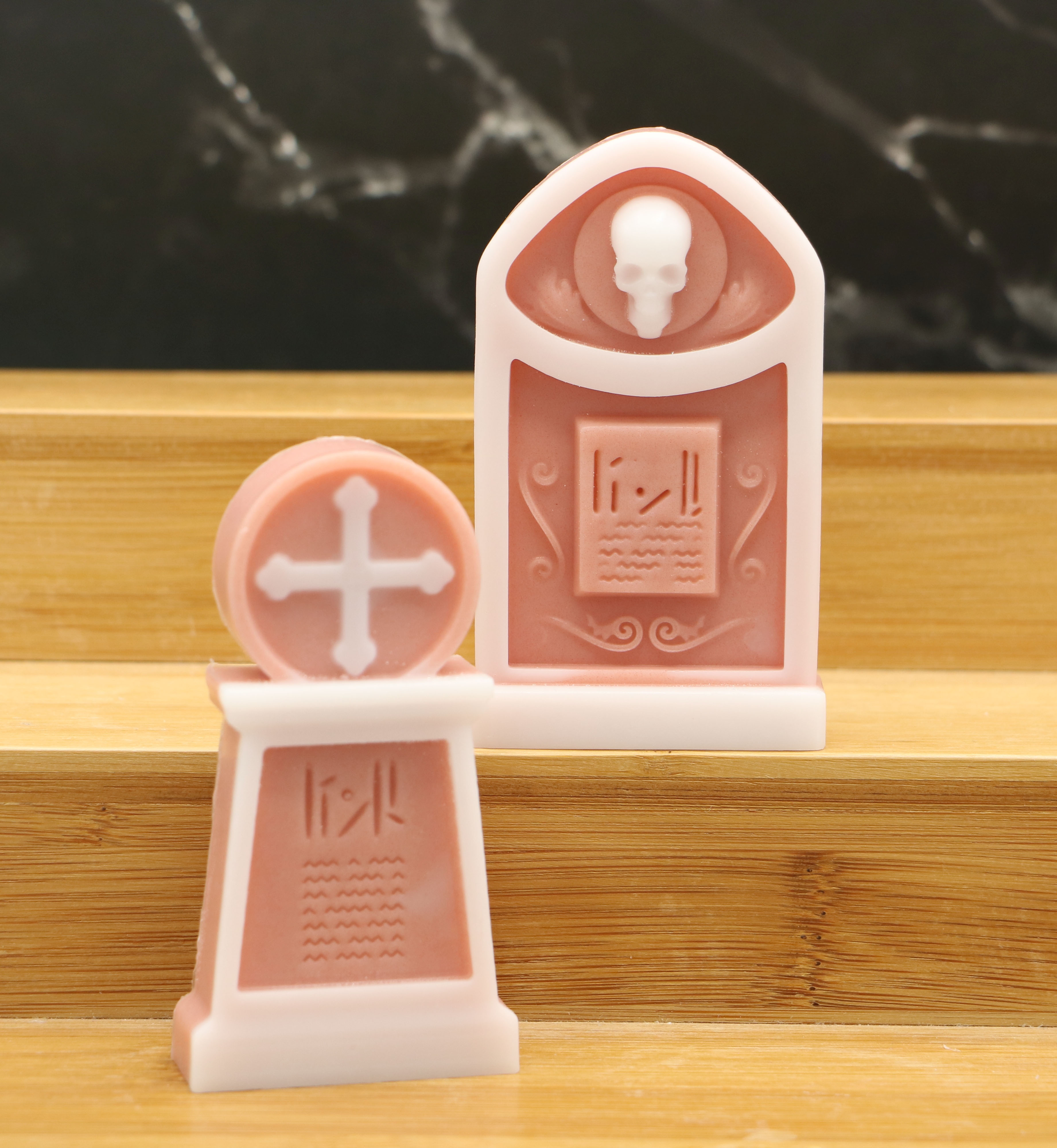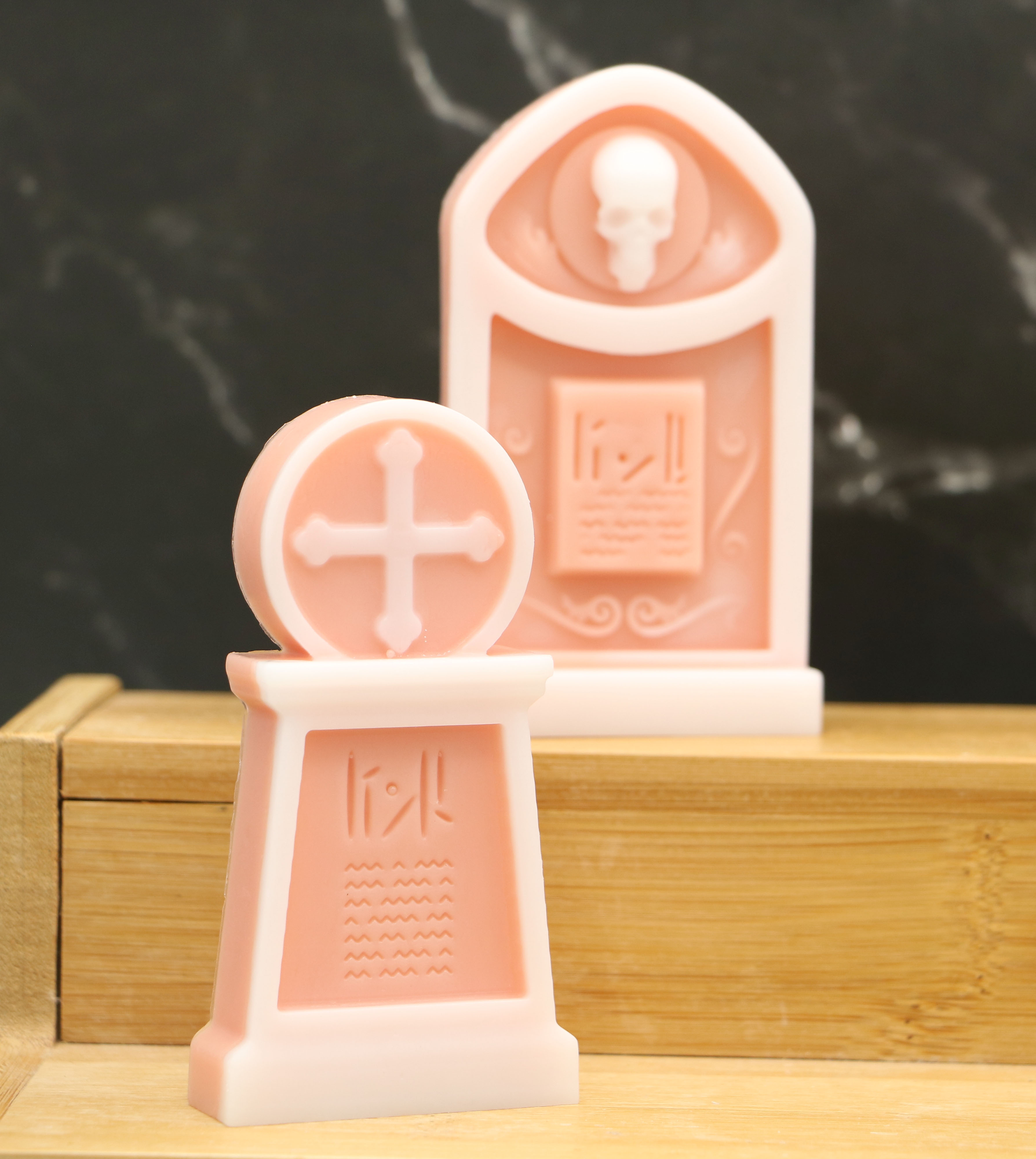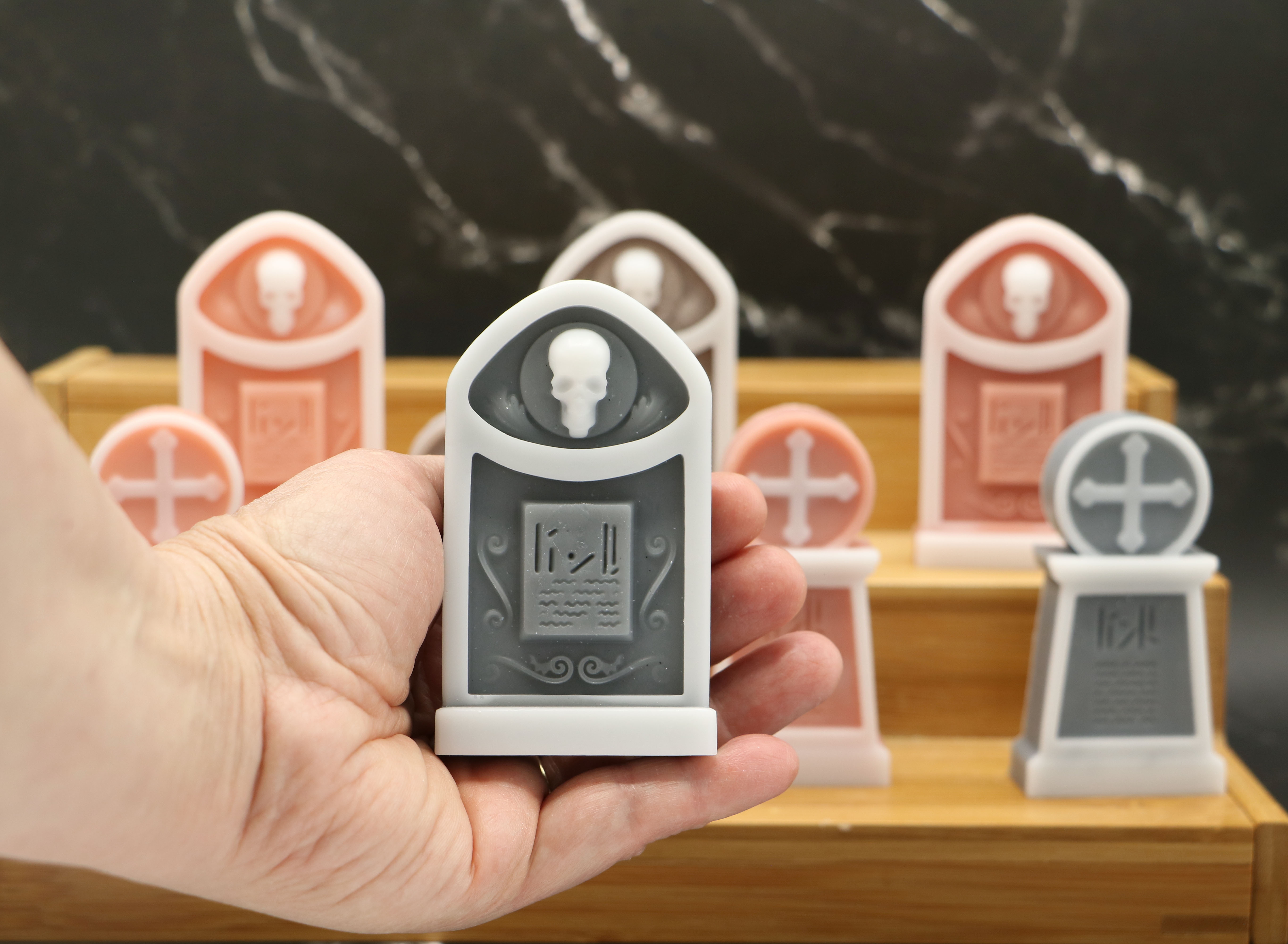 Set of 2 Tombstone Soaps for Halloween Gifts or Party Favors. Tombstone Soaps with details enhanced in White Soap. Choose your soap color, scent & packaging option. Add a complimentary Gift Tag with your personal message if desired!
