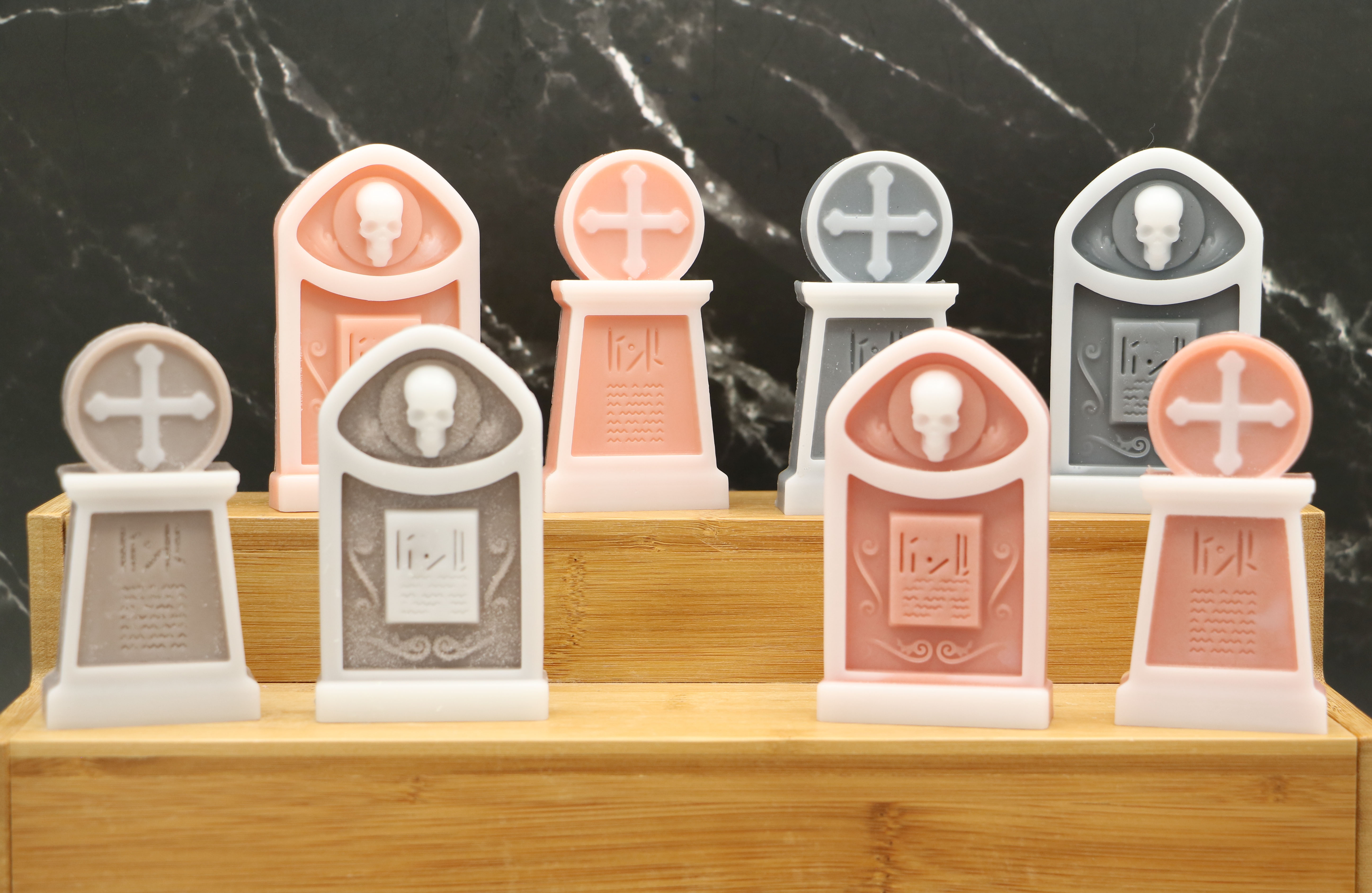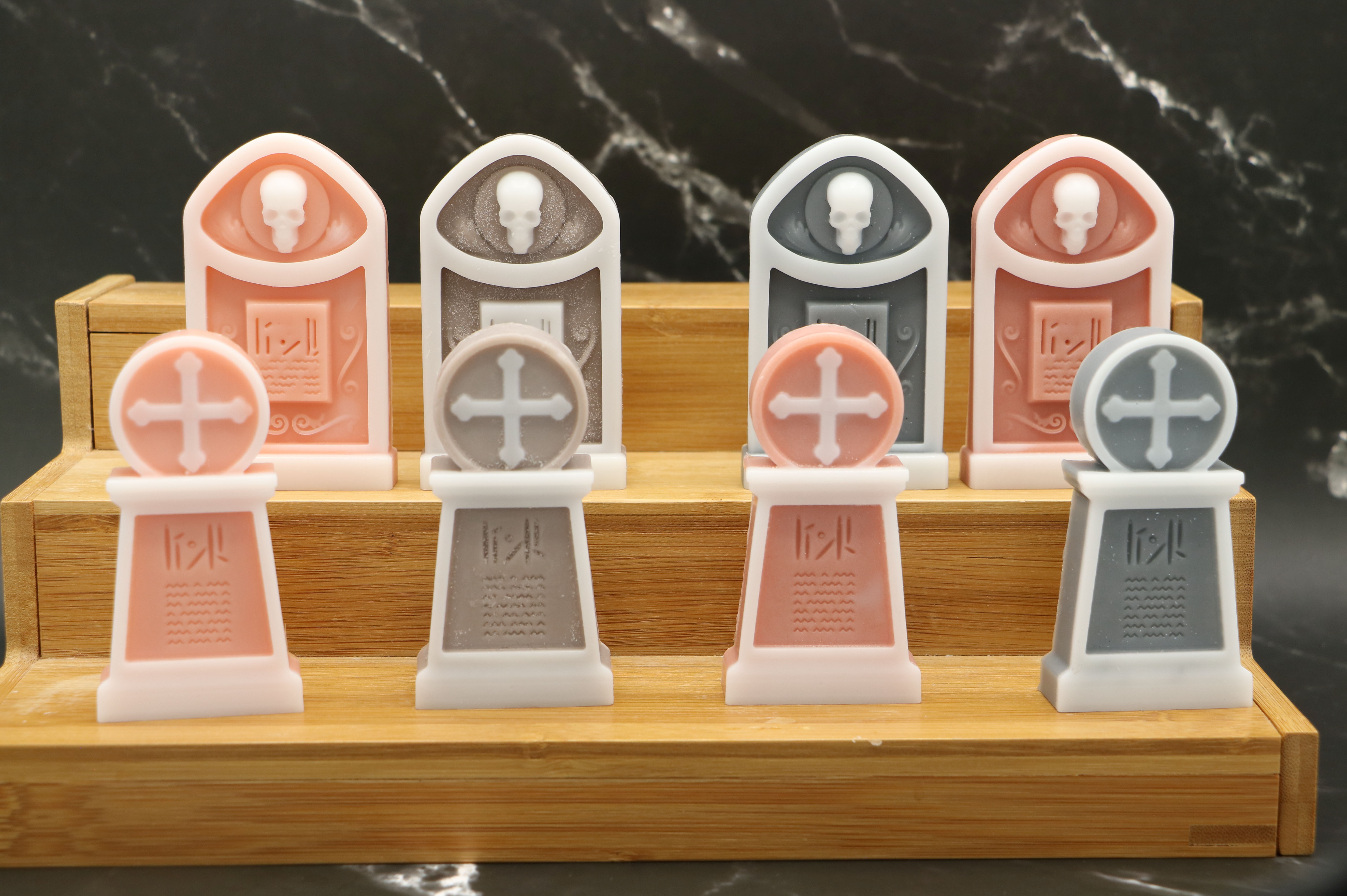 #3-Each soap packaged in clear bags, then your Set of 2 Tombstone Soaps will be placed in one 4" Gift Box. Color choices: Black or White.
