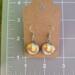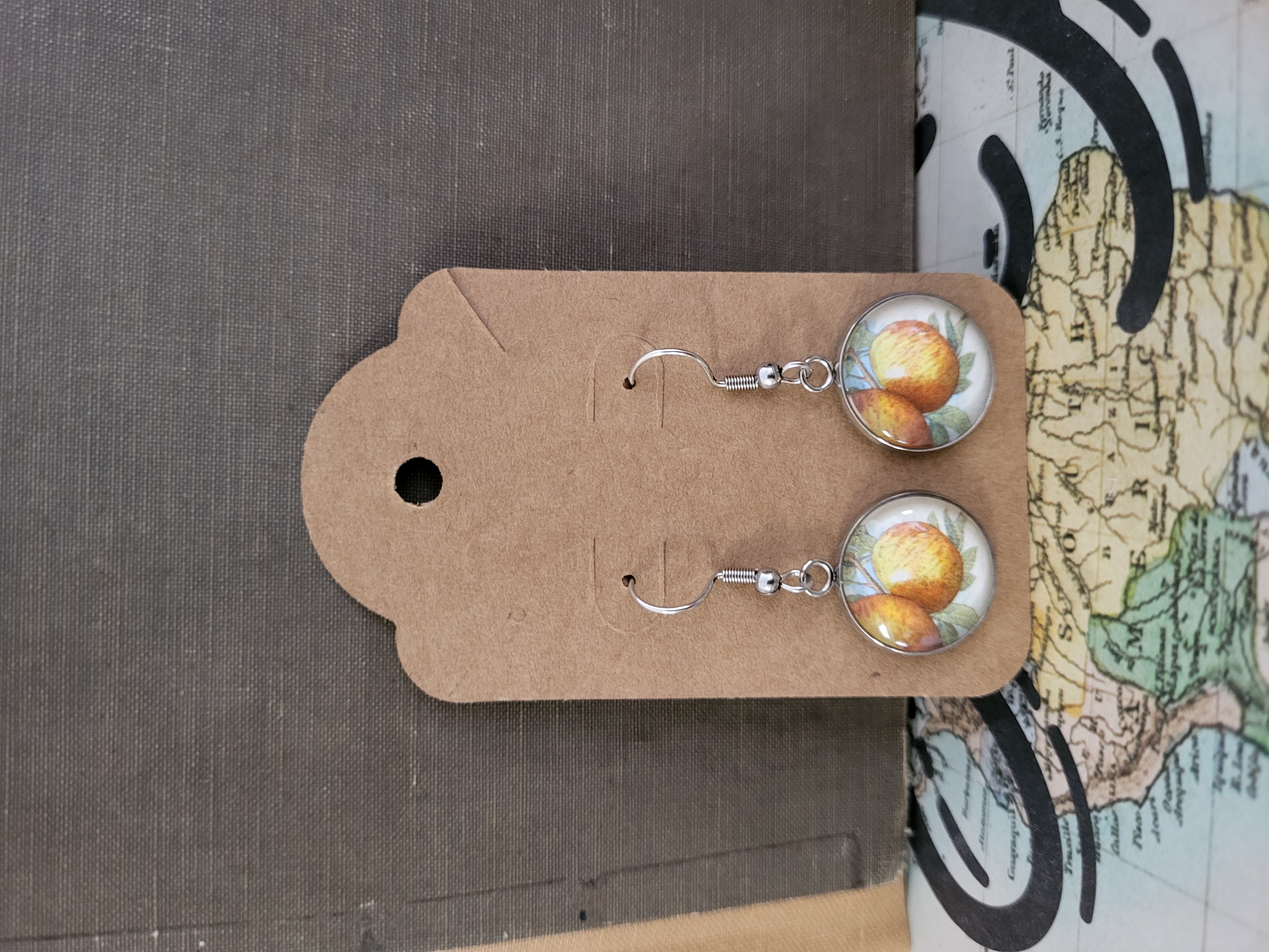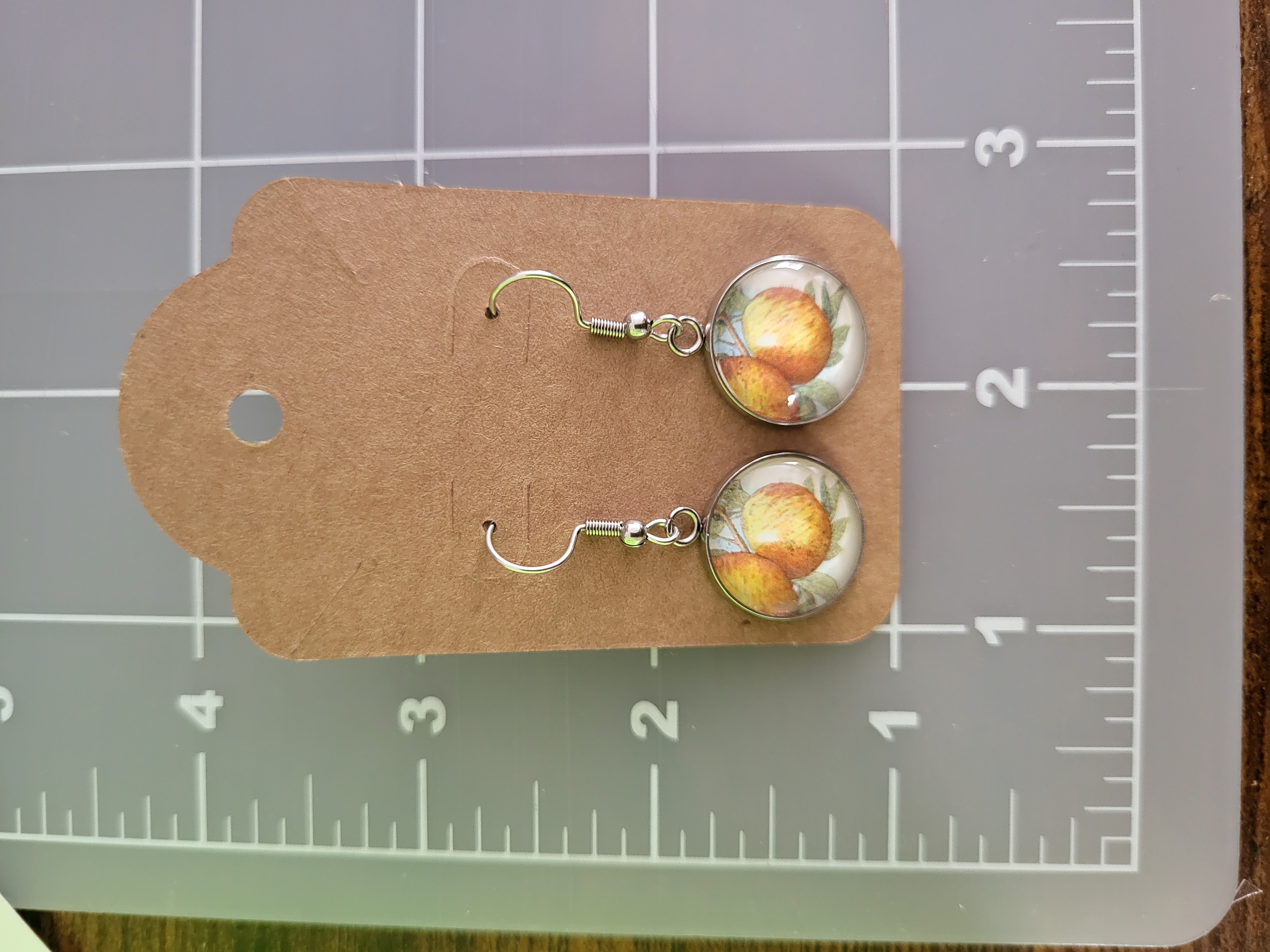 Each earring is made from a real, canceled stamp encased in glass with a shiny silver finish. They are made of stainless steel and each earring is just over a half an inch across in diameter.
