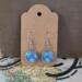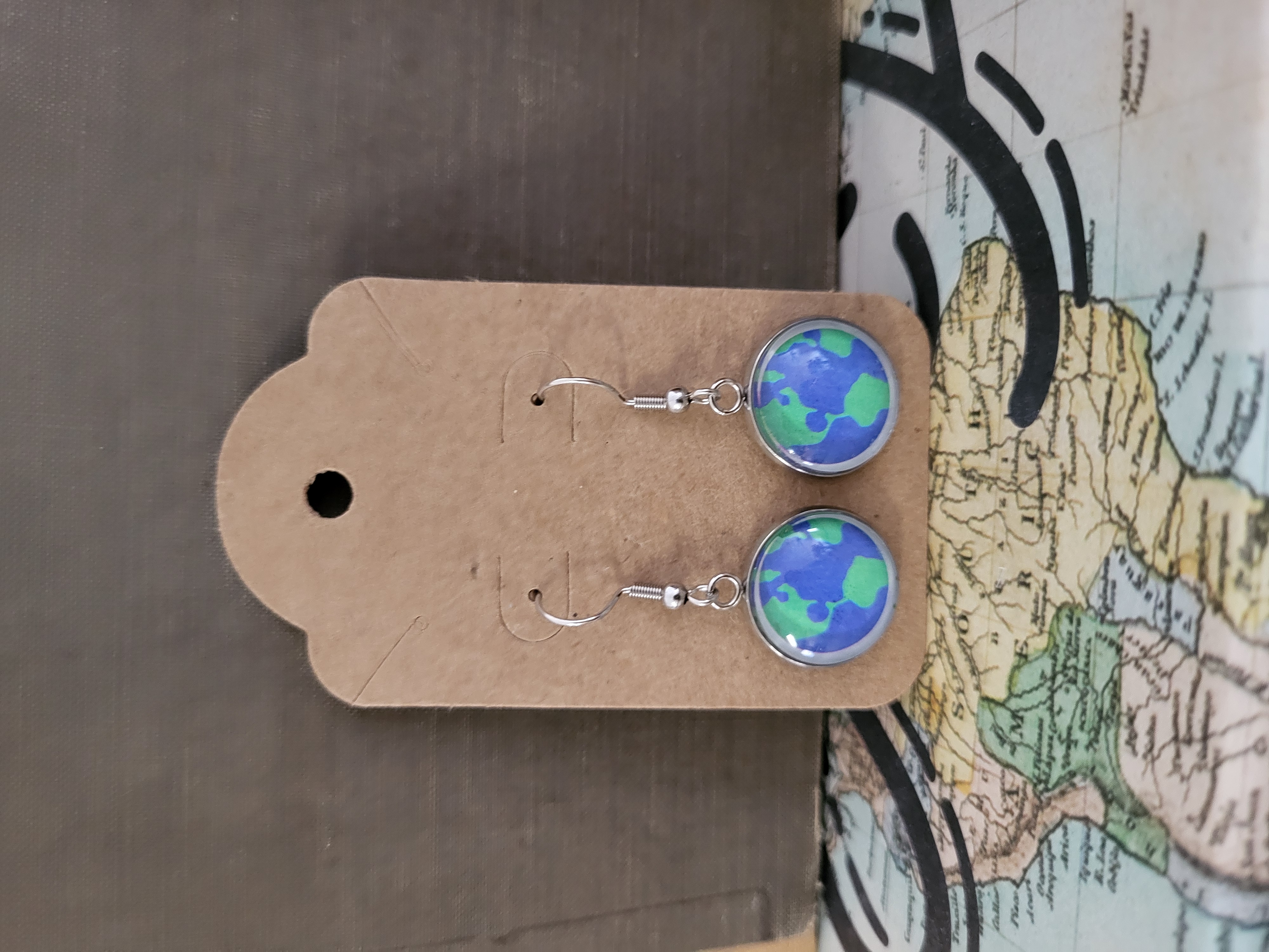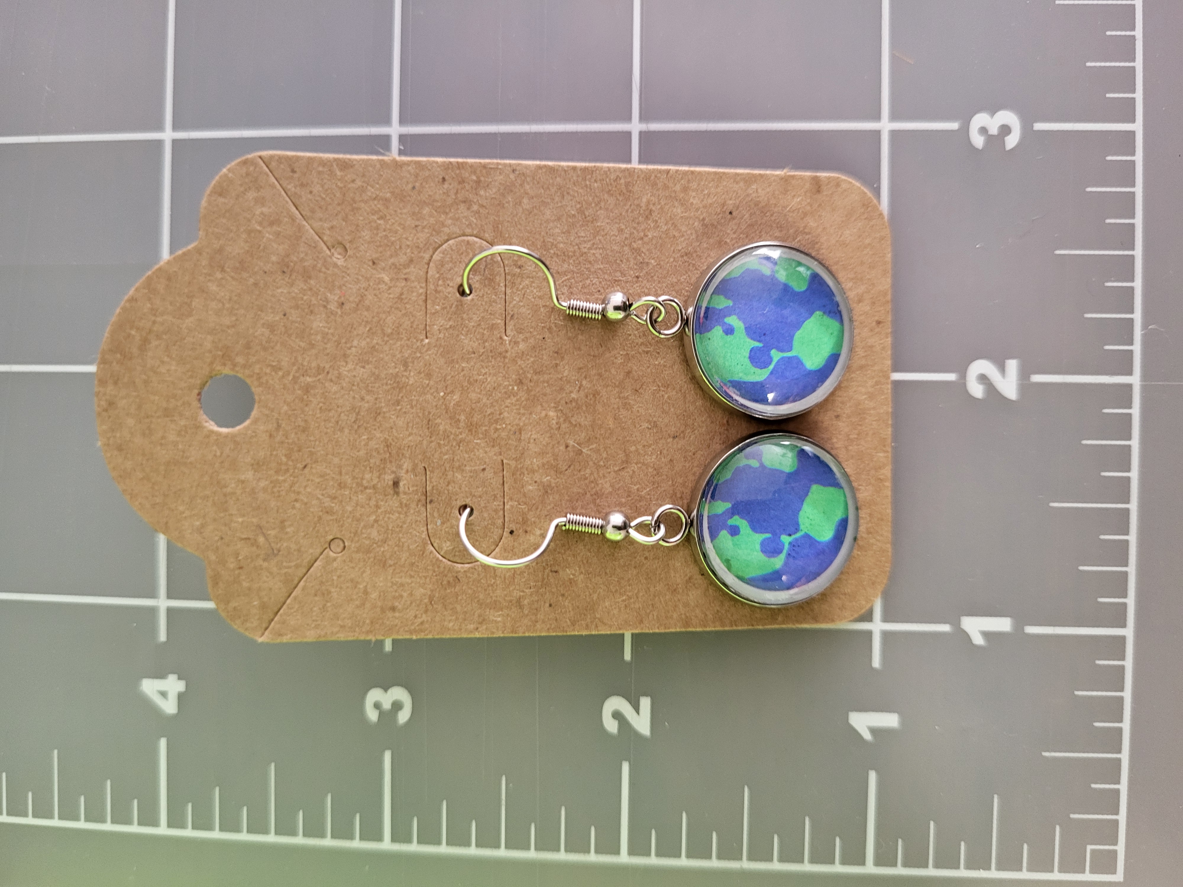 Each earring is made from a real, canceled stamp encased in glass with a shiny silver finish. They are made of stainless steel and each earring is just over a half an inch across in diameter.