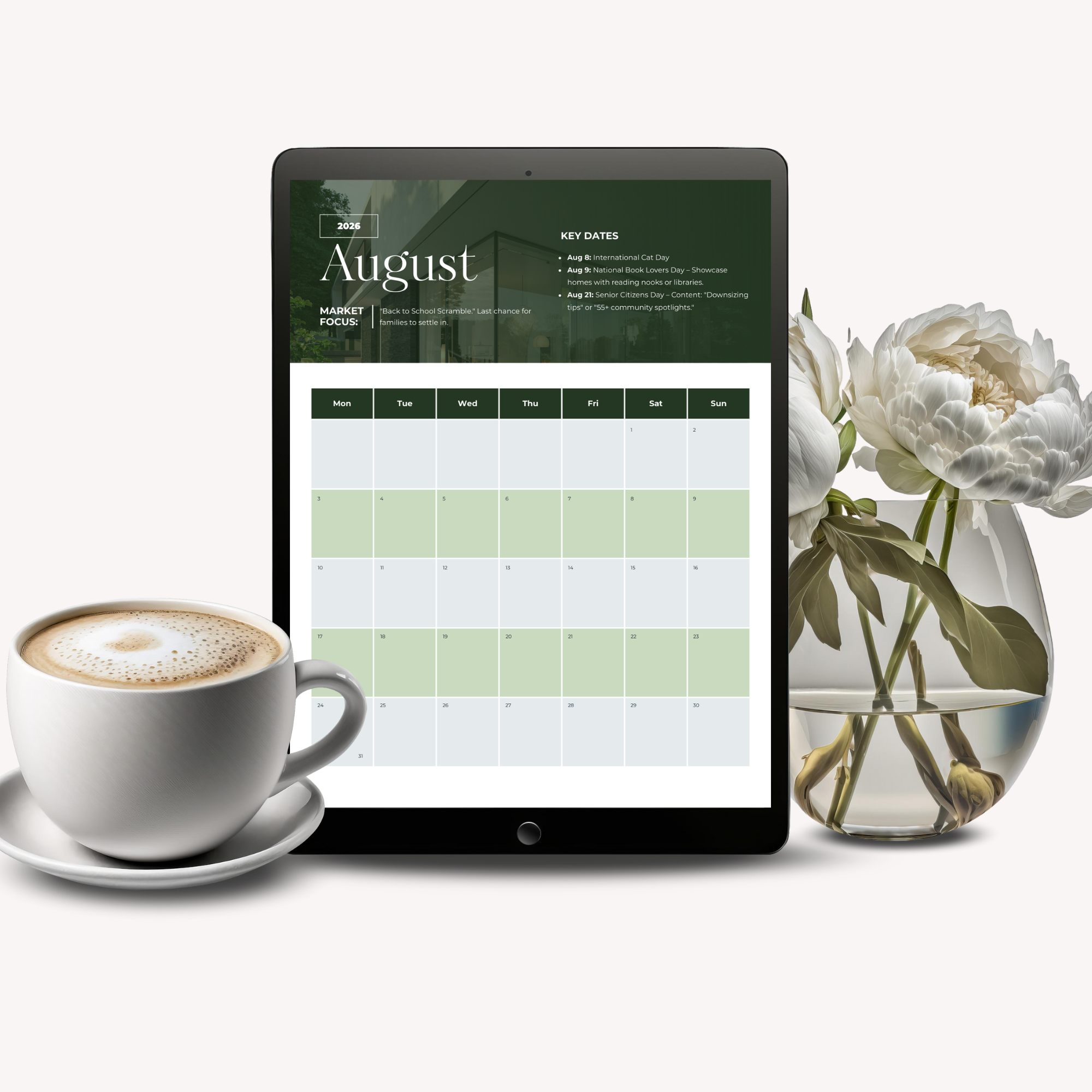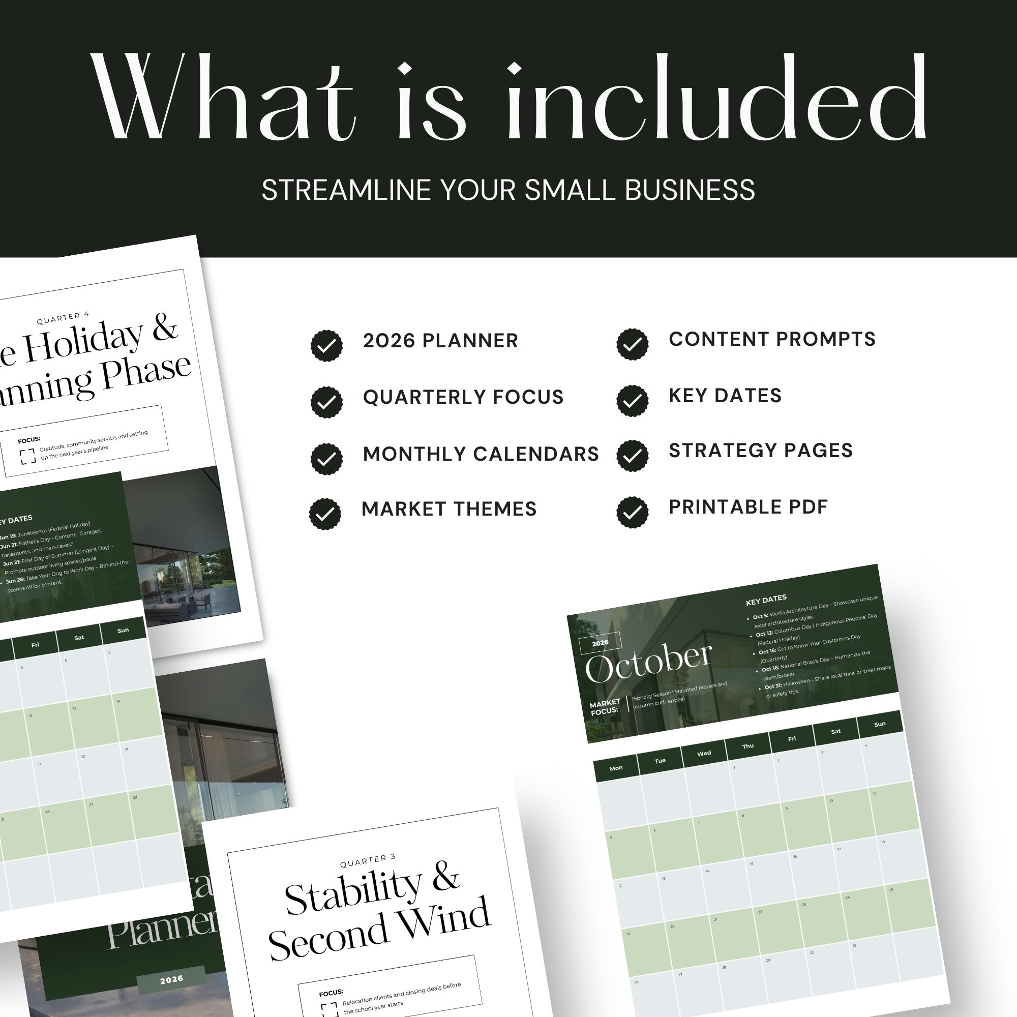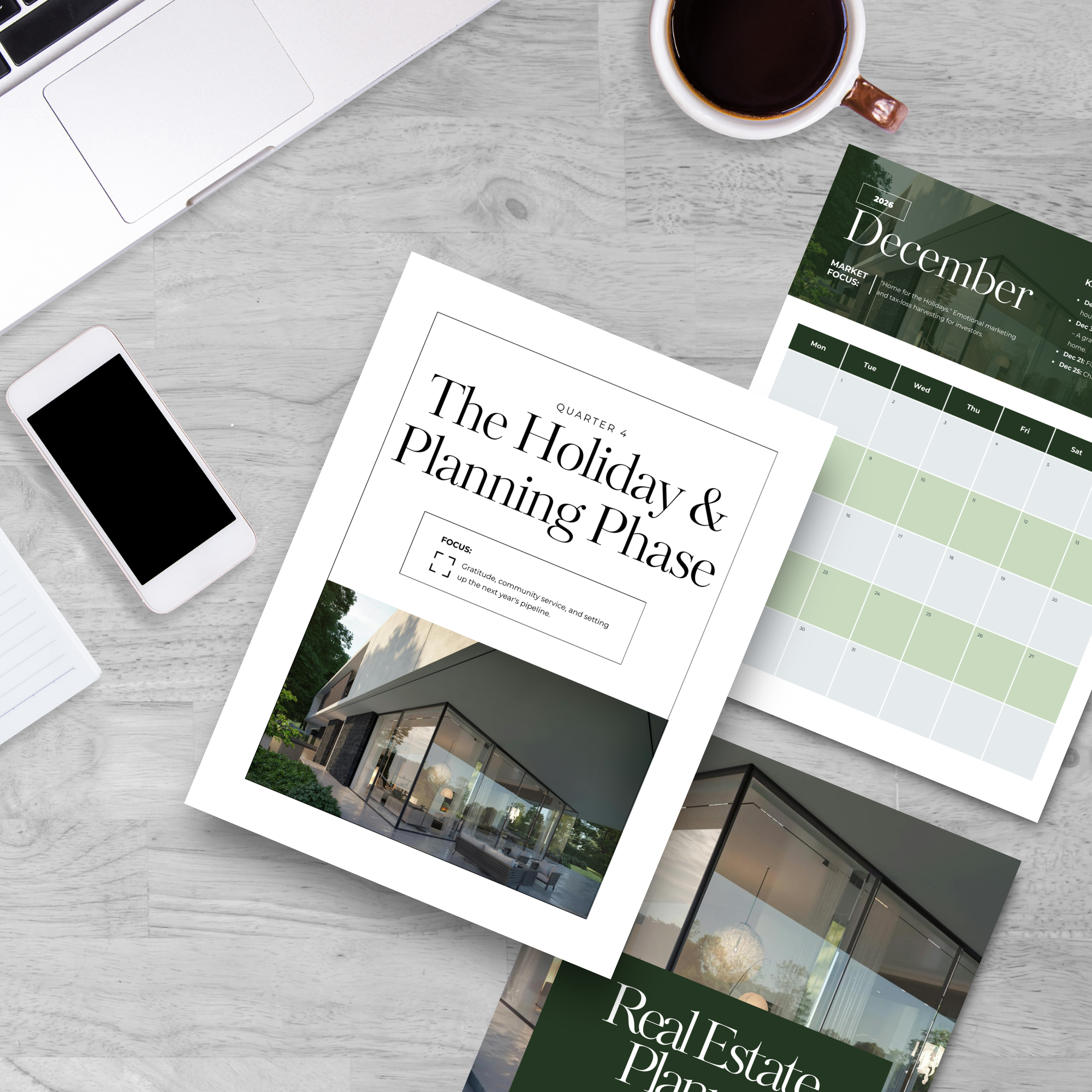 Each quarter is structured around how real estate actually works — from preparing for the spring rush, to managing peak selling season, to nurturing relationships and planning ahead during the holidays. You’ll know what to focus on, what to promote, and where to spend your energy each month.