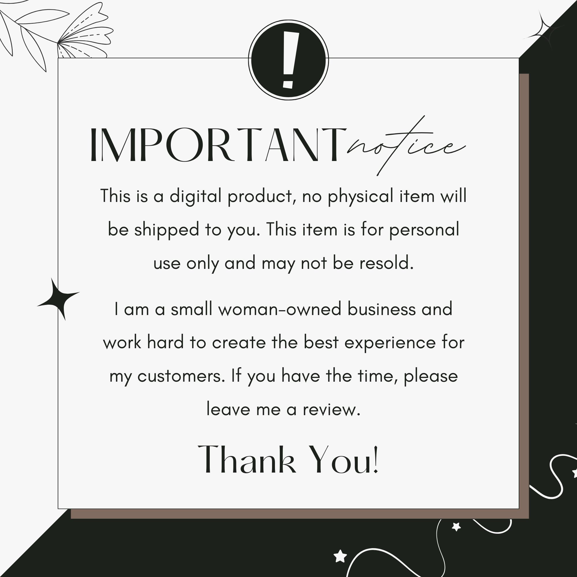 Navigating the realm of digital and printable products can undoubtedly feel overwhelming. That's why I'm not just a seller—I'm your partner in simplifying this process. If you're unsure about which product suits your requirements or if you have specific requests in mind, don't hesitate to reach out. I'm here to provide guidance and support every step of the way.