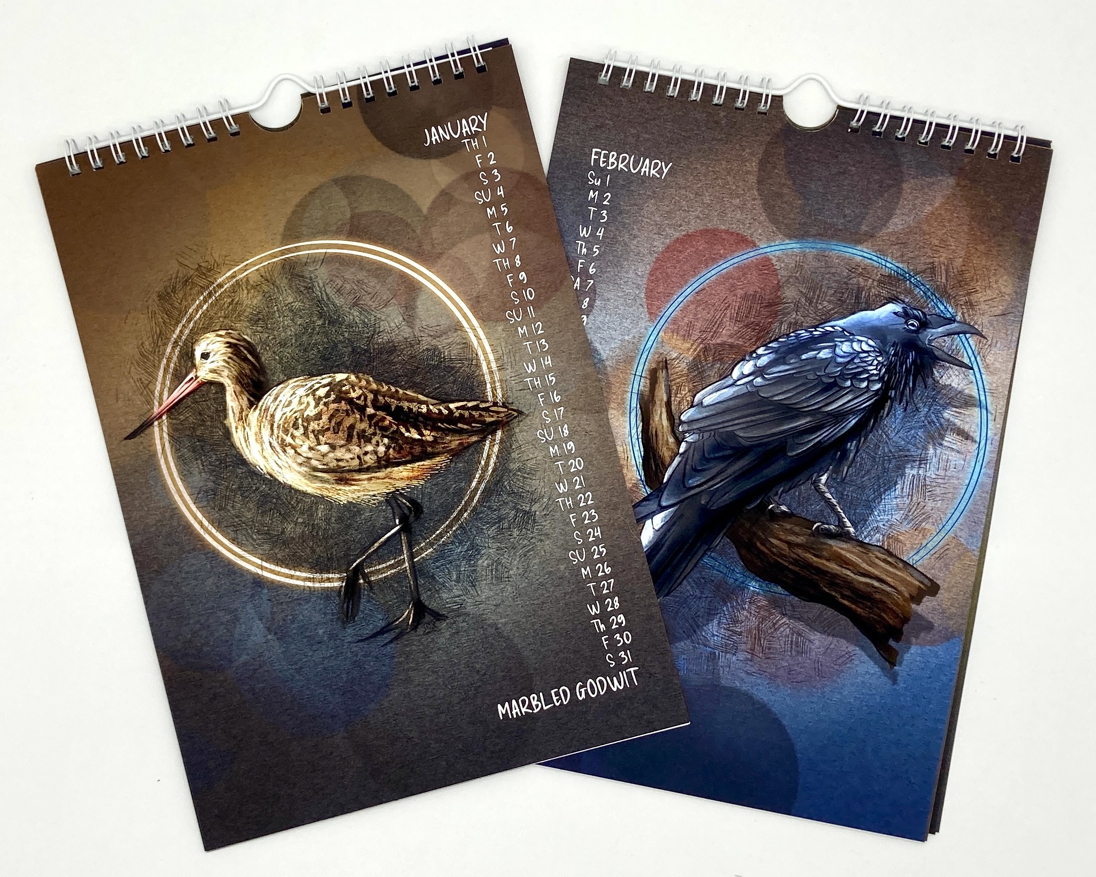 This compact, one-of-a-kind calendar features a dozen birds found along the Redwood Coast of the Pacific Northwest of the US. The majority of the birds were suggestions made by visitors to the Coreyartus Imagery art vending booth various fairs and festivals in Humboldt County. Many people proffered suggestions for local birds that thought might look nice as an illustrated greeting card or print. So many new friends had bird stories of their own, or special connections to specific birds they held near and dear to their hearts.