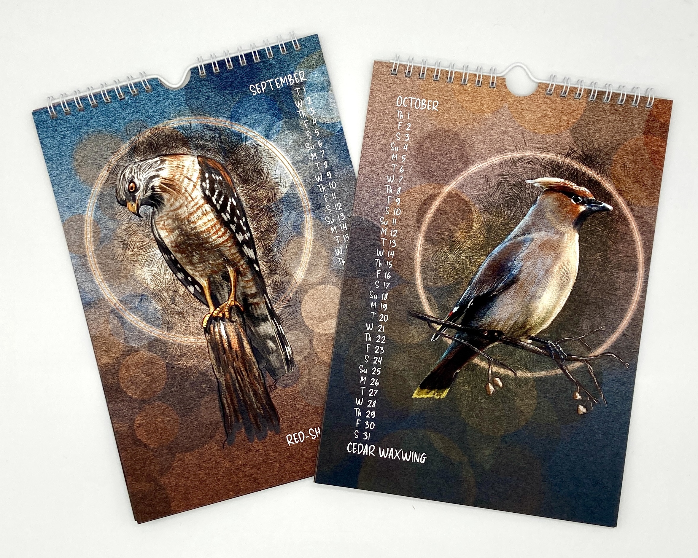 Done by hand without the assistance of AI-image generators, each page was drawn and painted stroke by stroke in Procreate on an Apple iPad. No tracing and no photo filters. Just a lot of heart. Intended to focus on the artwork, these calendars are essentially a collection of small prints to hang in your office, cubicle, kitchen, or wherever you need the presence of a friendly avian! The birds include: a yellow-rumped warbler on the cover, a Marbled Godwit, a Raven, an Osprey, a Northern Spotted Owl, a California Brown Pelican, a Steller's Jay, a California Quail, a Heron, a Black Phoebe, a Red-Shouldered Hawk, a Cedar Waxwing, and a Fox Sparrow.