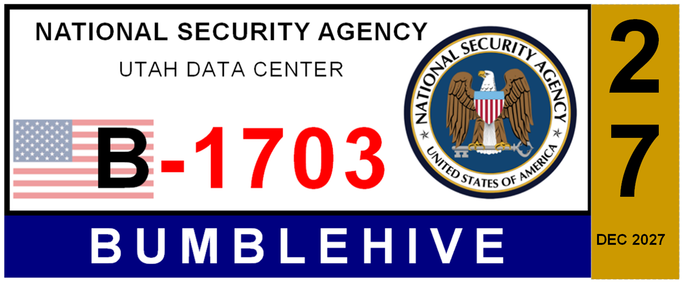 Many conspiracy theorists know the NSA data center in Utah, code named Bumblehive. This fantasy decal measures 5-1/2" x 2-1/4" and is vinyl.