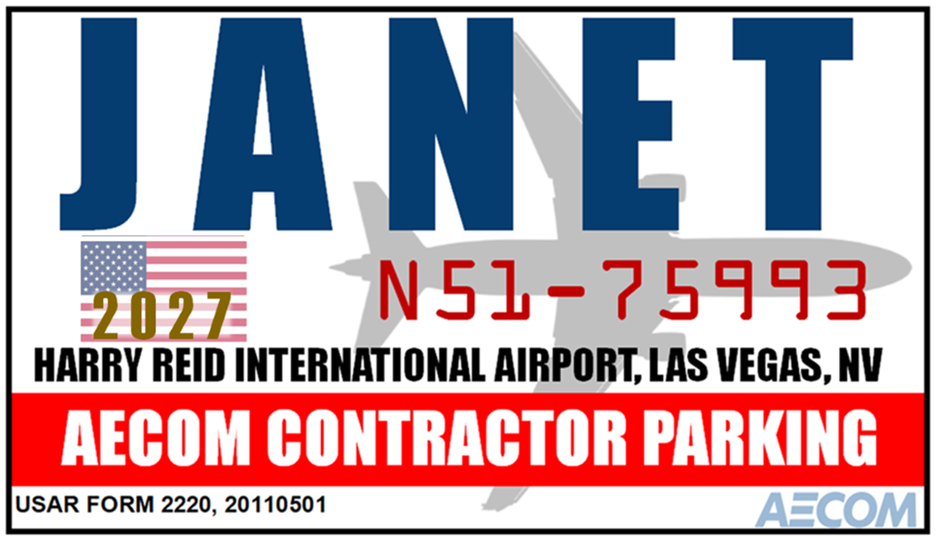 JANET is a government-run airline operating out of Harry Reid Airport in Las Vegas and takes contractors to all the fun places that the government does not want you to know about, like Area 51, Tonopah, Yucca Flats. This is a fantasy sticker, don't try to park in the AECOM lot using it.