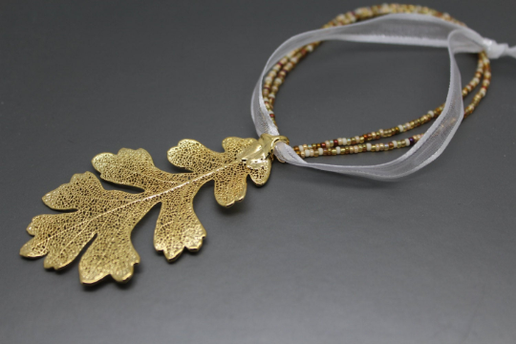 This extra-large lacey oak leaf would be a beautiful addition to your tree, or your fall decorations. The real lacey oak leaf has two strands of seed beads, and ribbon for hanging. The seed beads are a mix of gold-toned, copper, cream and white beads. The sheer ribbon has a white border with a touch of silver along the edge. The leaf is hand painted with a copper-based paint and then electroplated with 24 kt gold.