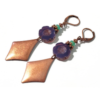 This pretty classic necklace is made with various sizes and shapes (including hearts, ovals, diamonds, trapezoid, round, etc) of turquoise dyed magnesite gemstones with tibetan silver bead caps, a resin flower and stainless steel jump rings.