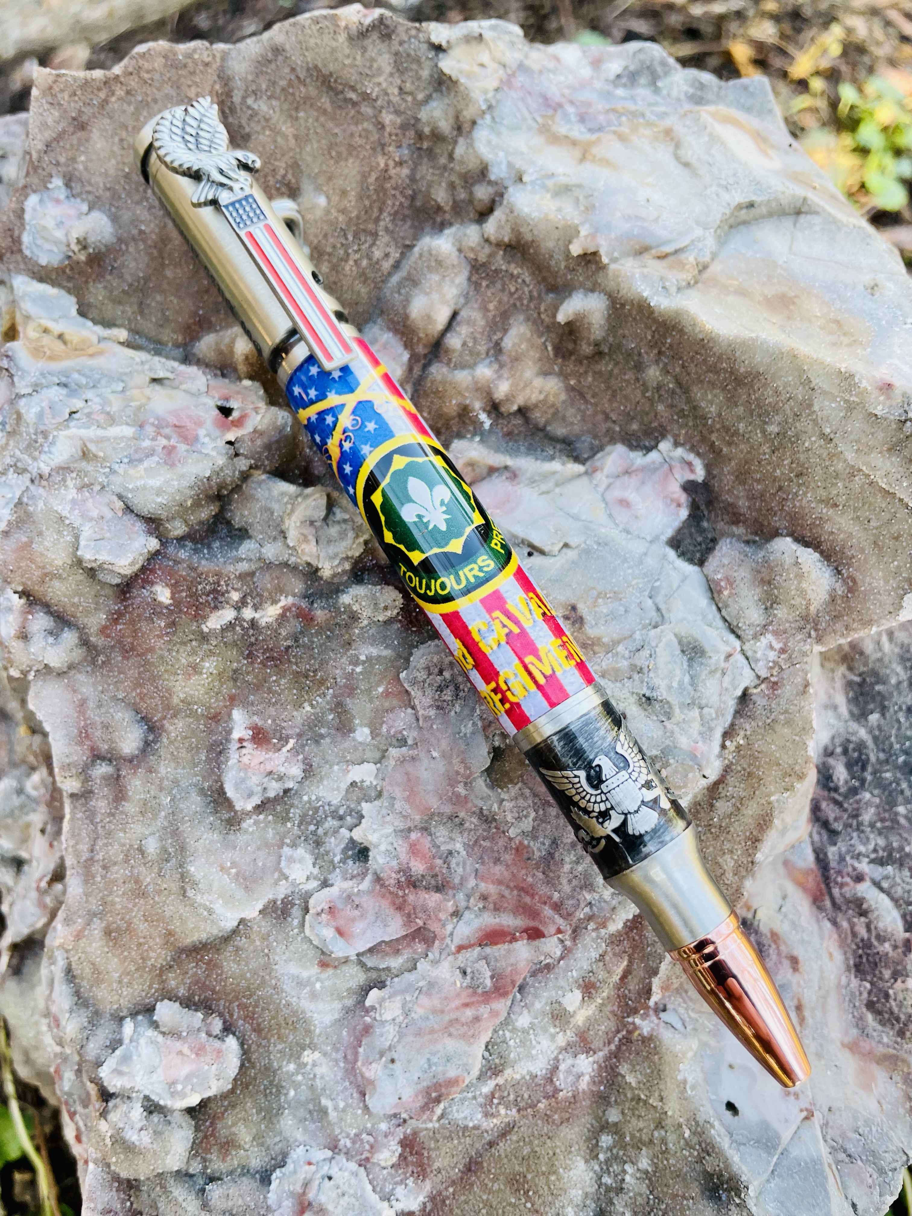This bolt-action pewter finish pen is hand-turned and polished with a custom designed resin cast center barrel. Great for PCS, ETS, Impact Award, or Retirement Memento.