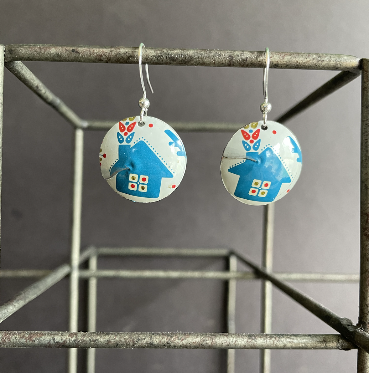 Tins are very light making them ideal for earrings as they don't weigh down your ears as the day goes on. Did you know the proper term for working with tin is "tinkering"? That made me really happy. I literally tinker in my art studio! I use old cookie tins, tea tins, and the like, break them down, and hand cut them into shapes and hand-hammer them into the 3-D shape I want them to be, finish and polish them, before putting them together like any other jewelry.