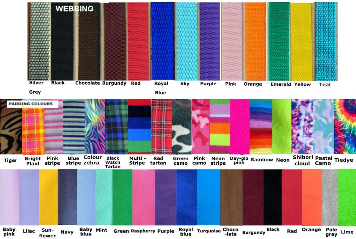 Choose webbing and fleece padding colours from the drop-down menus when buying, see the 2nd photo for colours. If you want a shorter or longer leash, no problem - message me for a cost first.