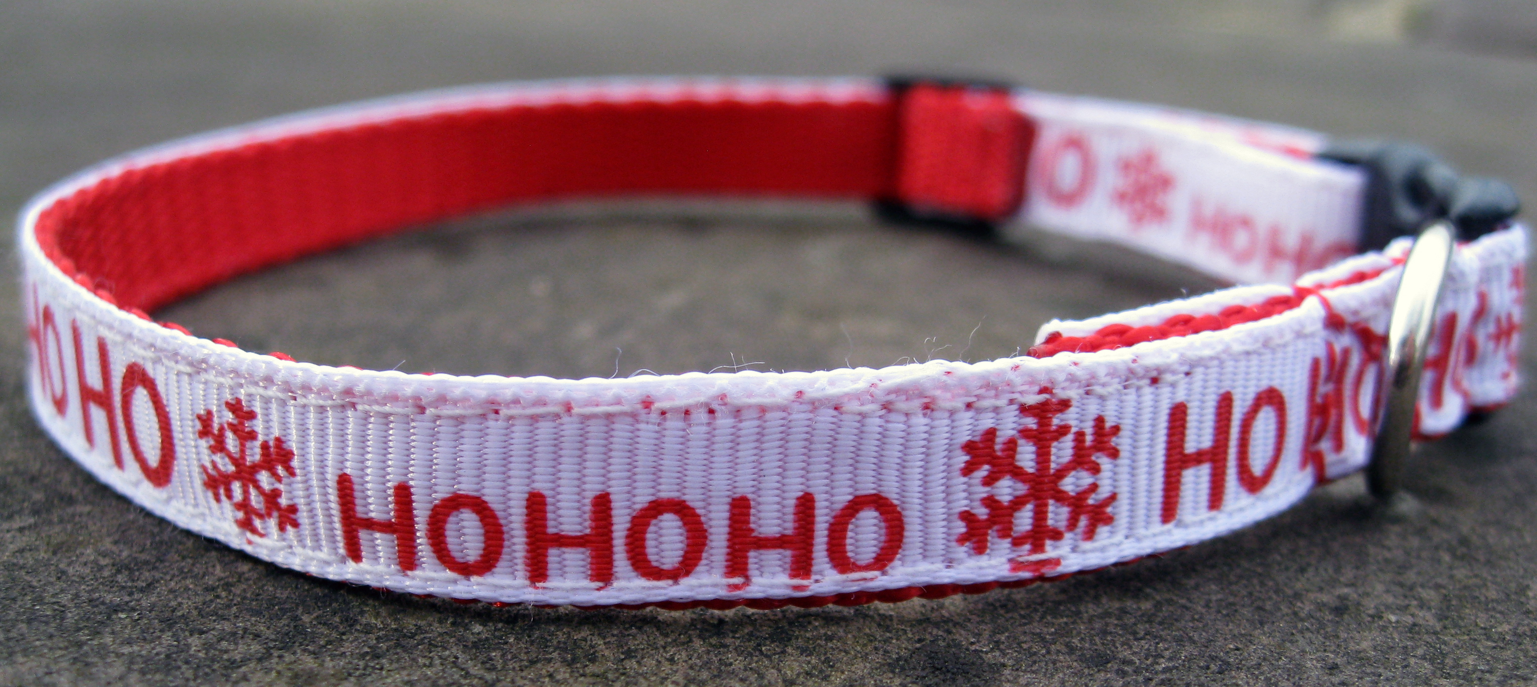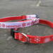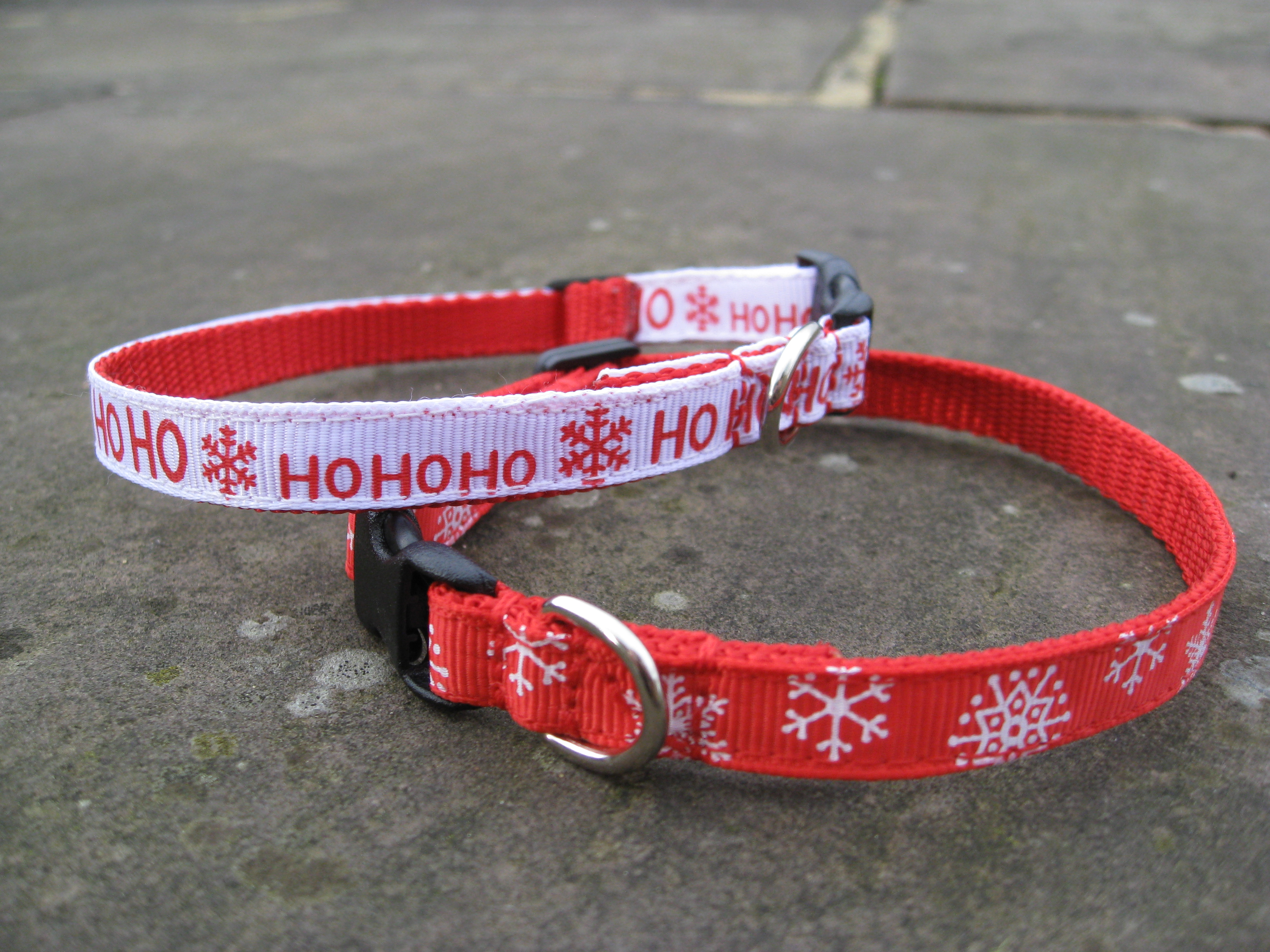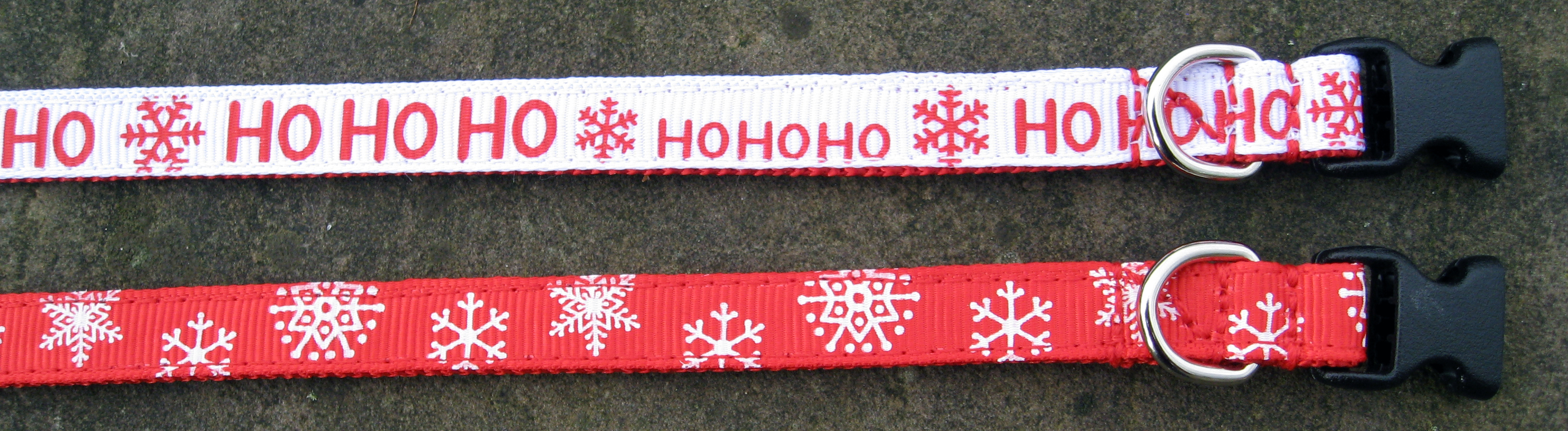 A choice of festive winter / christmas patterns on a webbing dog collar, 3/8" (10mm) in width, suitable for the smallest dogs / chihuahuas / teacup & toy dogs / puppies etc. The grosgrain pattern runs along the length of the collar; with small quick release buckles and a welded D ring.