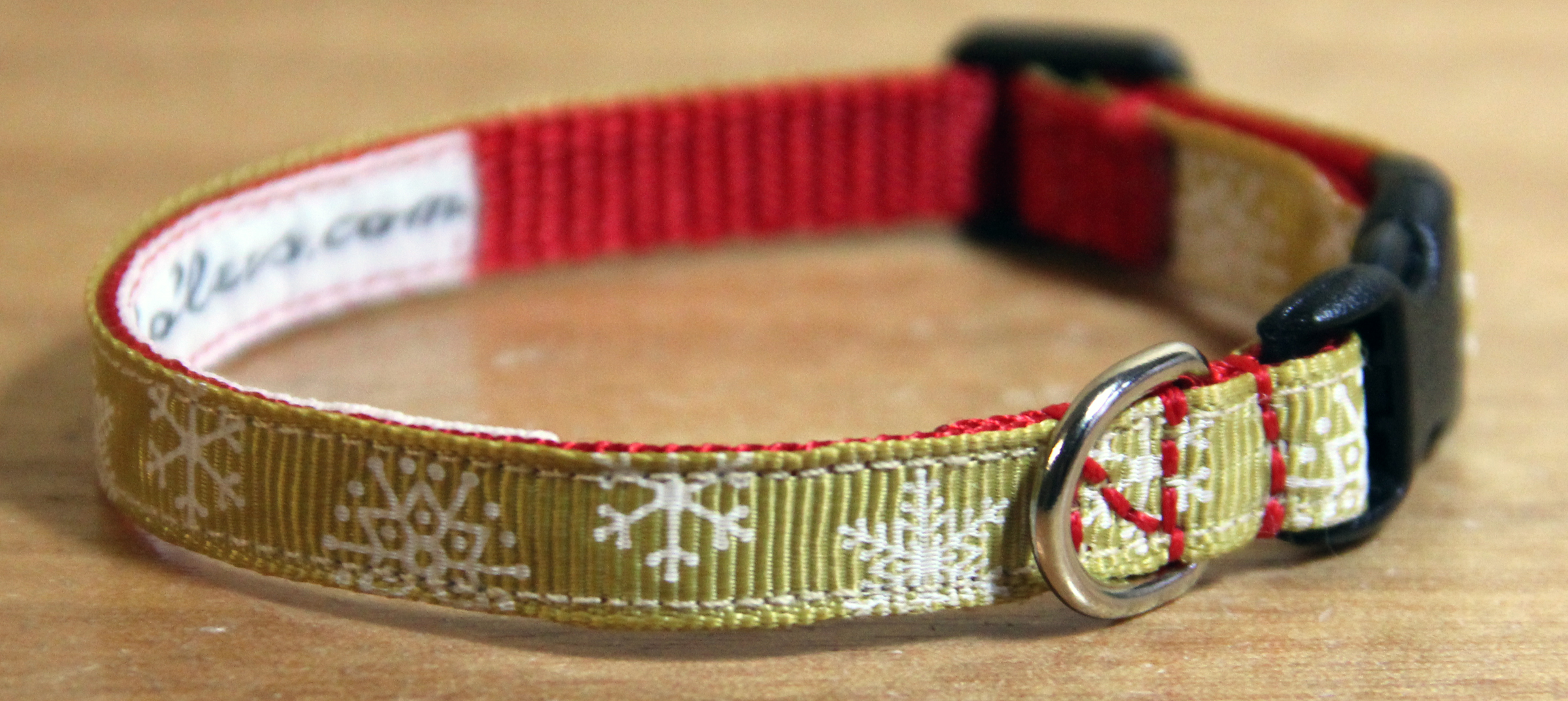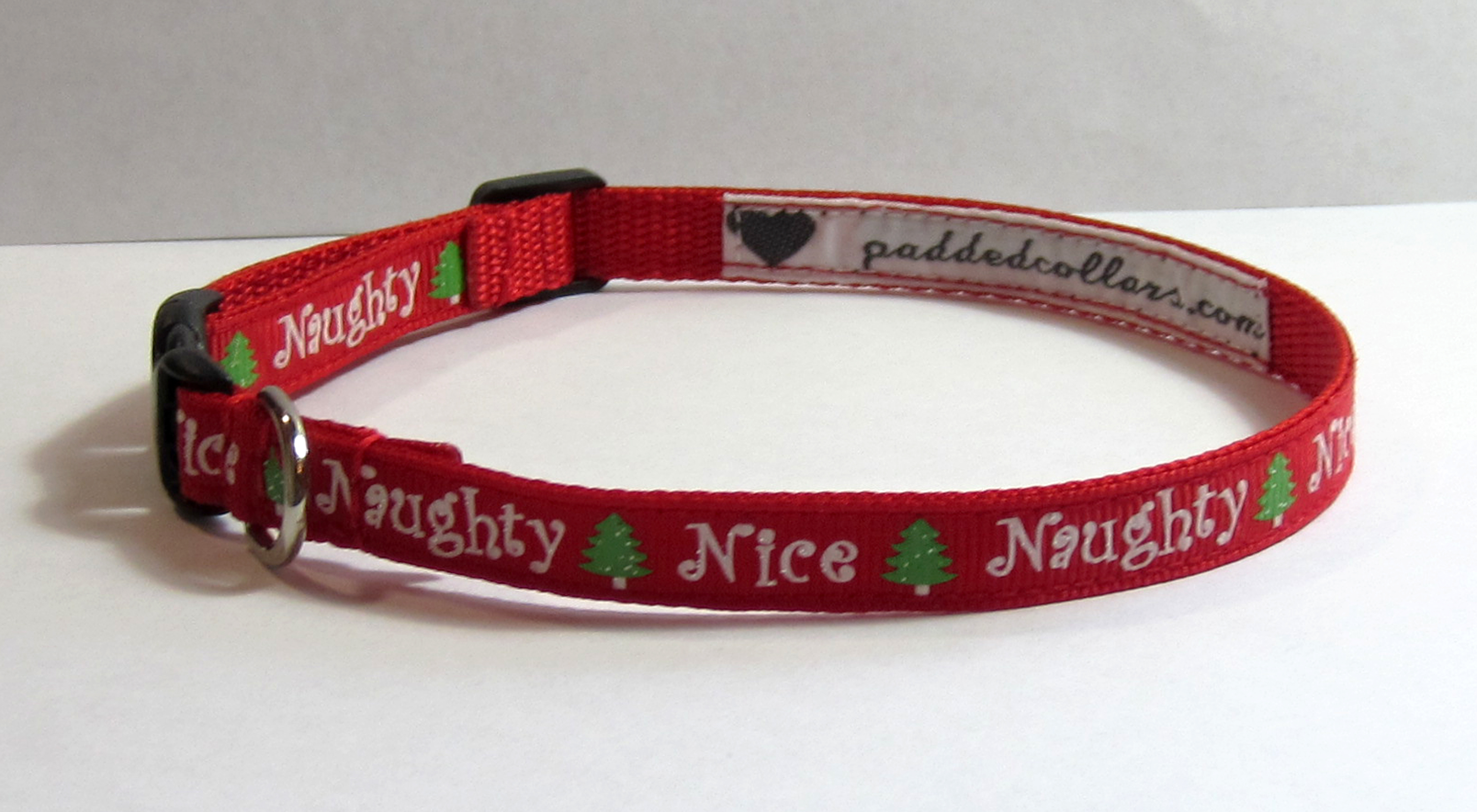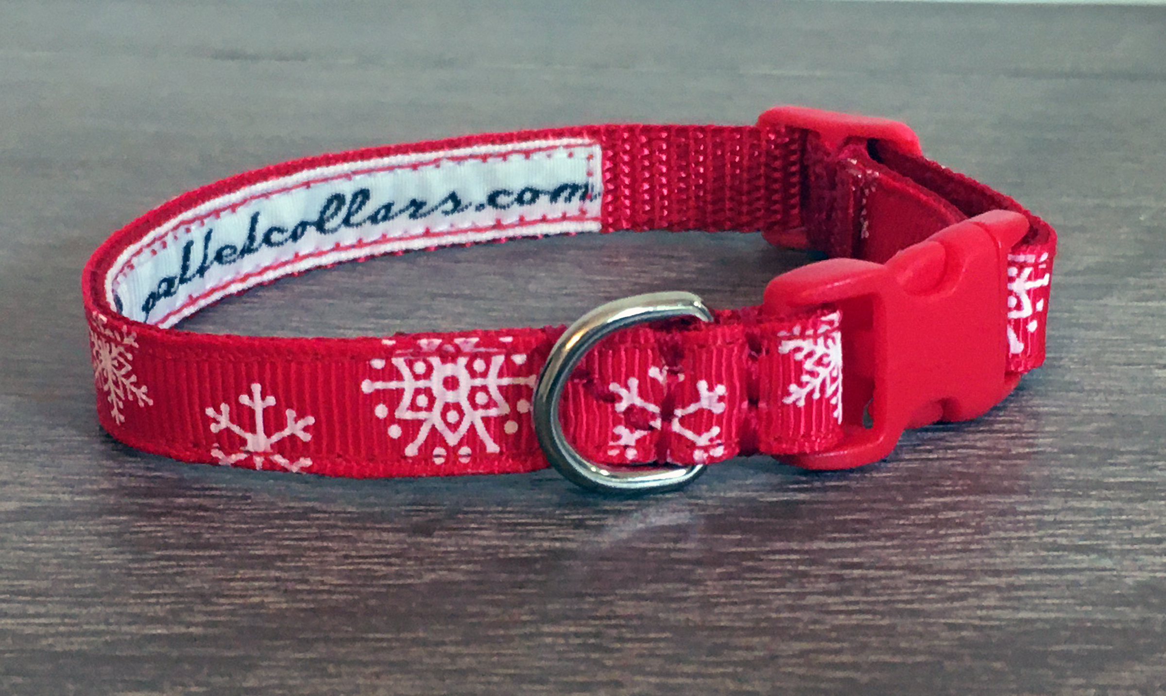 A choice of festive winter / christmas patterns on a webbing dog collar, 3/8" (10mm) in width, suitable for the smallest dogs / chihuahuas / teacup & toy dogs / puppies etc. The grosgrain pattern runs along the length of the collar; with small quick release buckles and a welded D ring.
