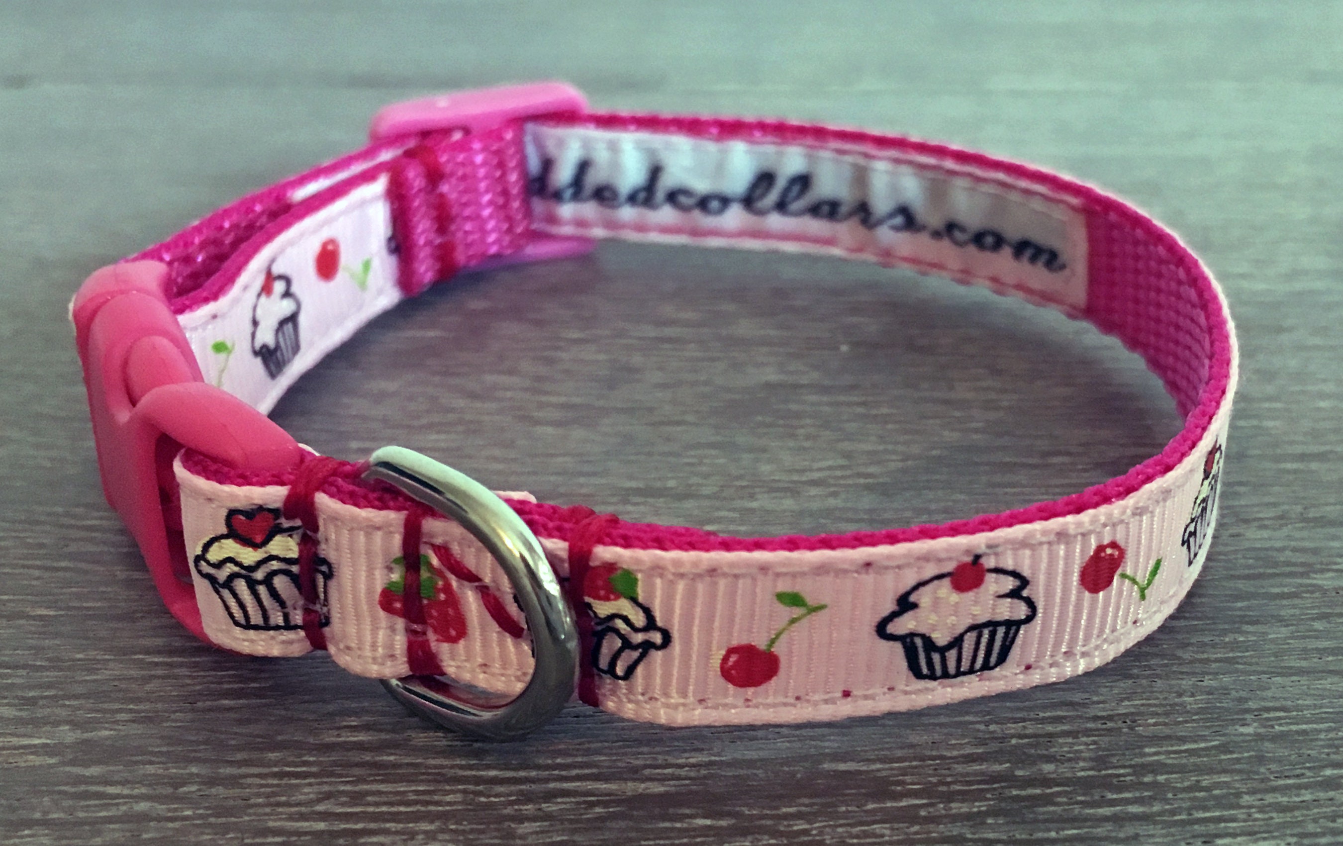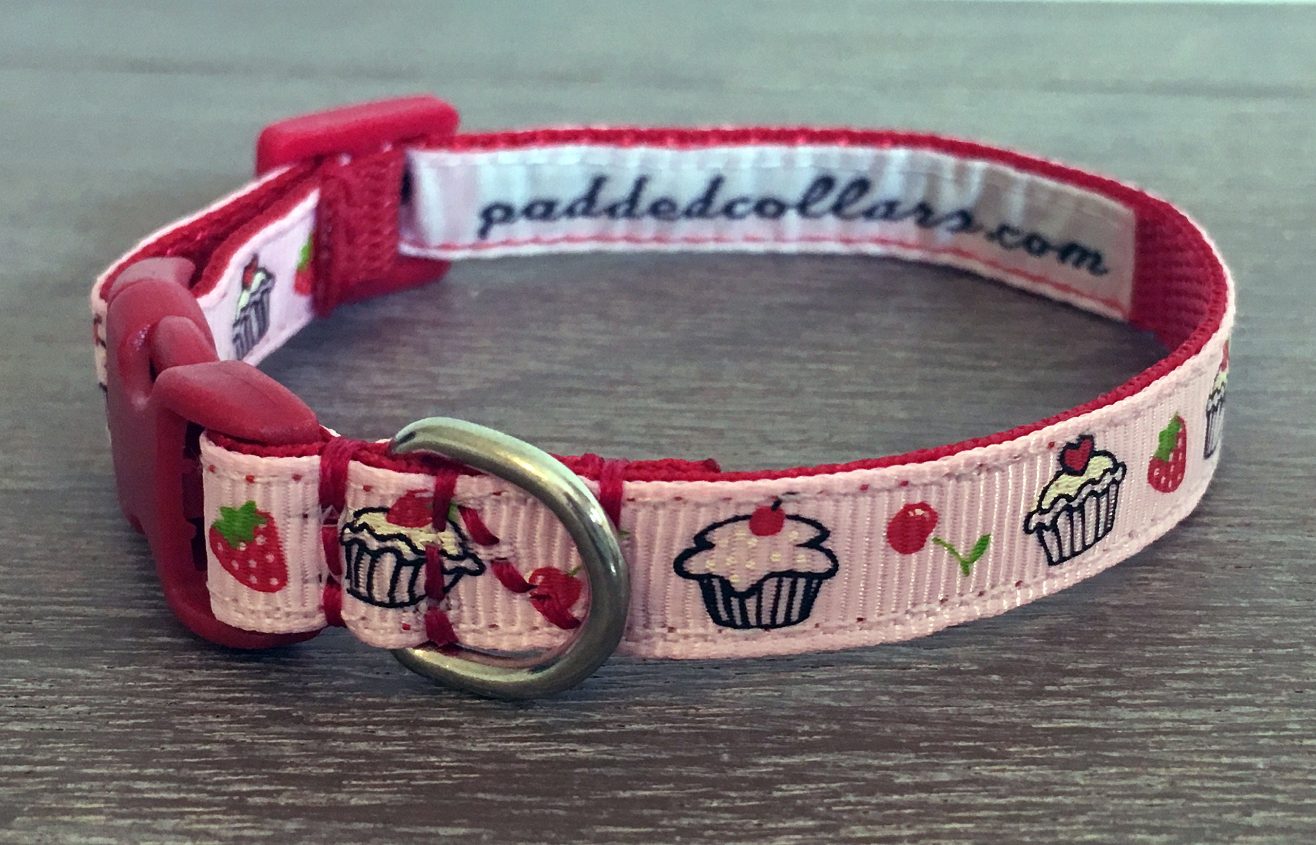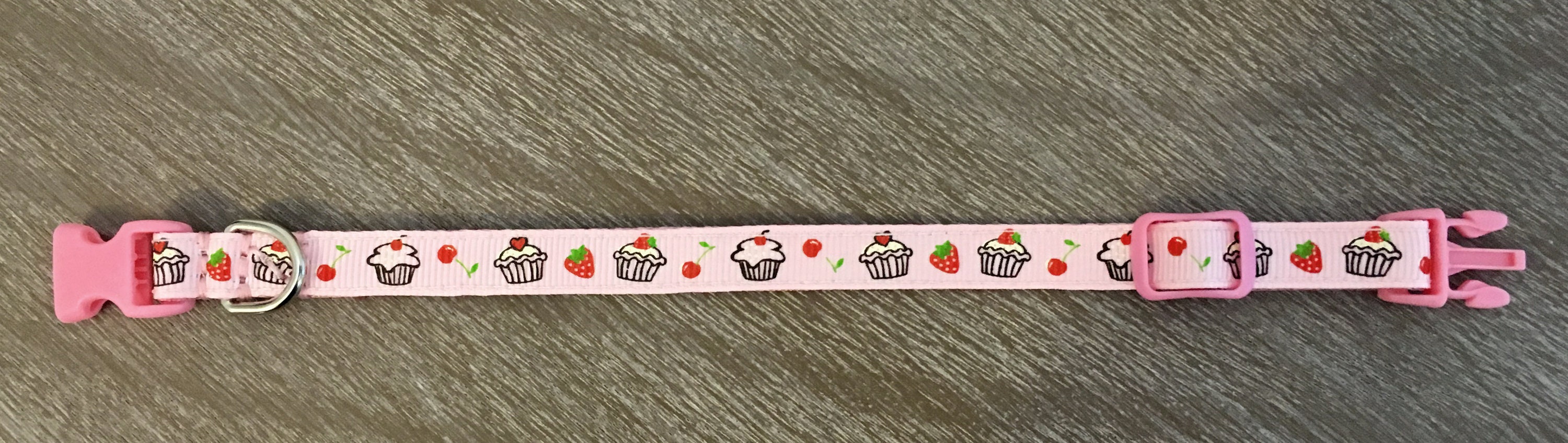 A cute webbing dog collar, 3/8" (10mm) in width, suitable for the smallest dogs / chihuahuas / teacup & toy dogs / puppies etc. A pink cupcakes grosgrain pattern runs along the length of the collar; with small, quick release buckles and a welded D ring.