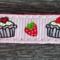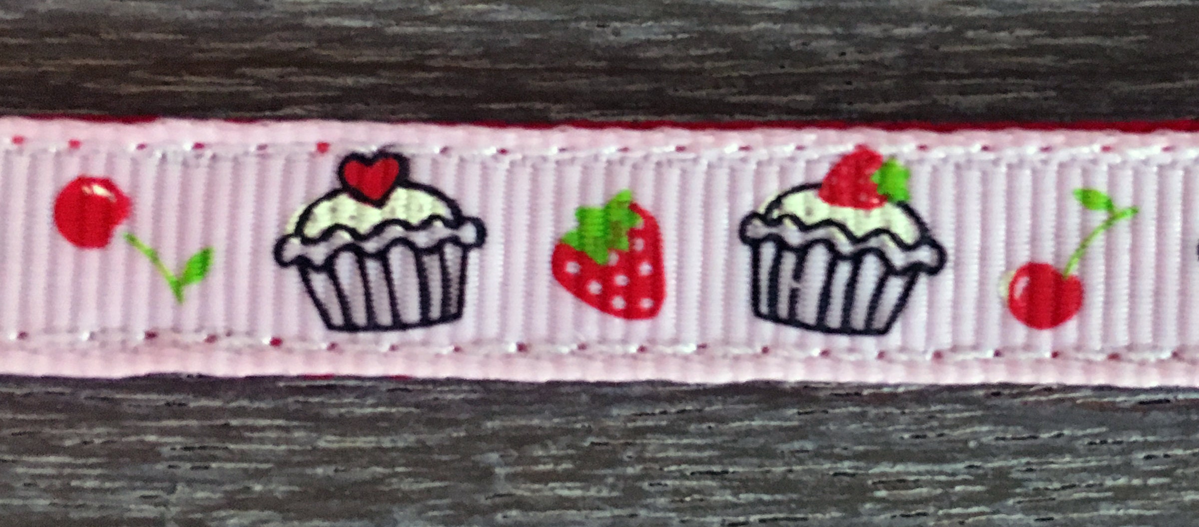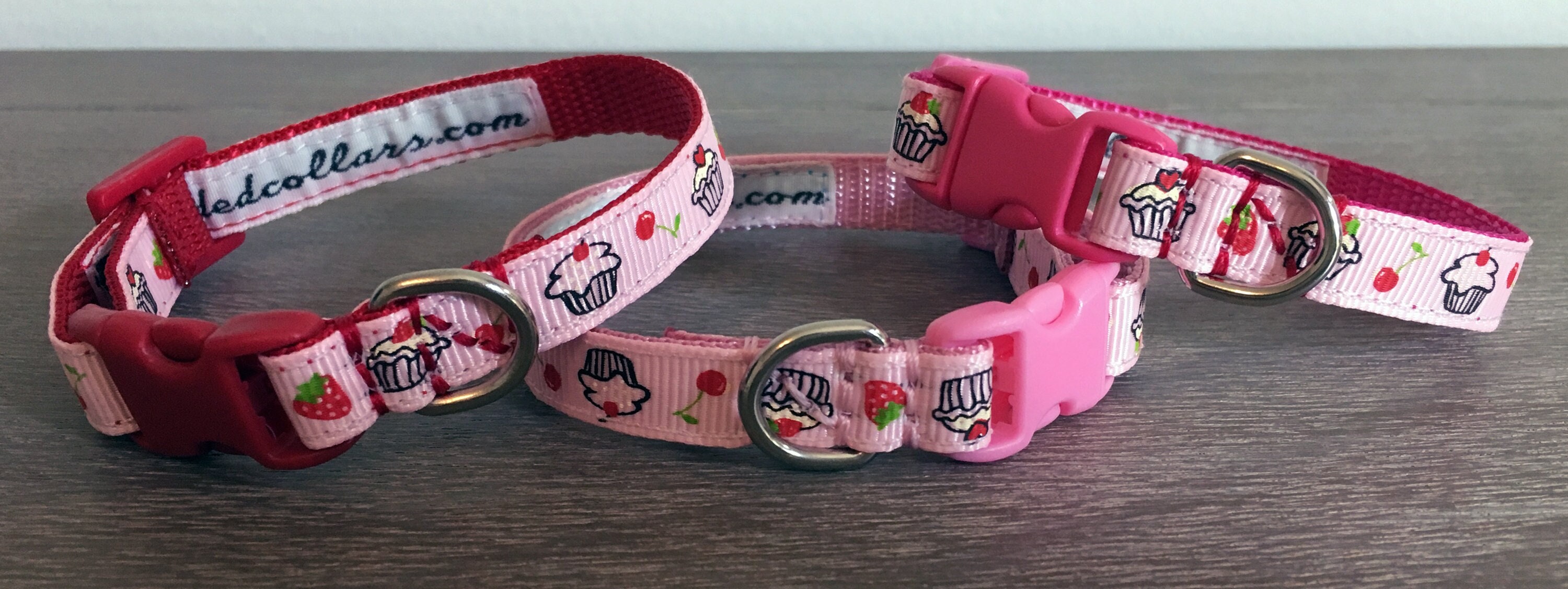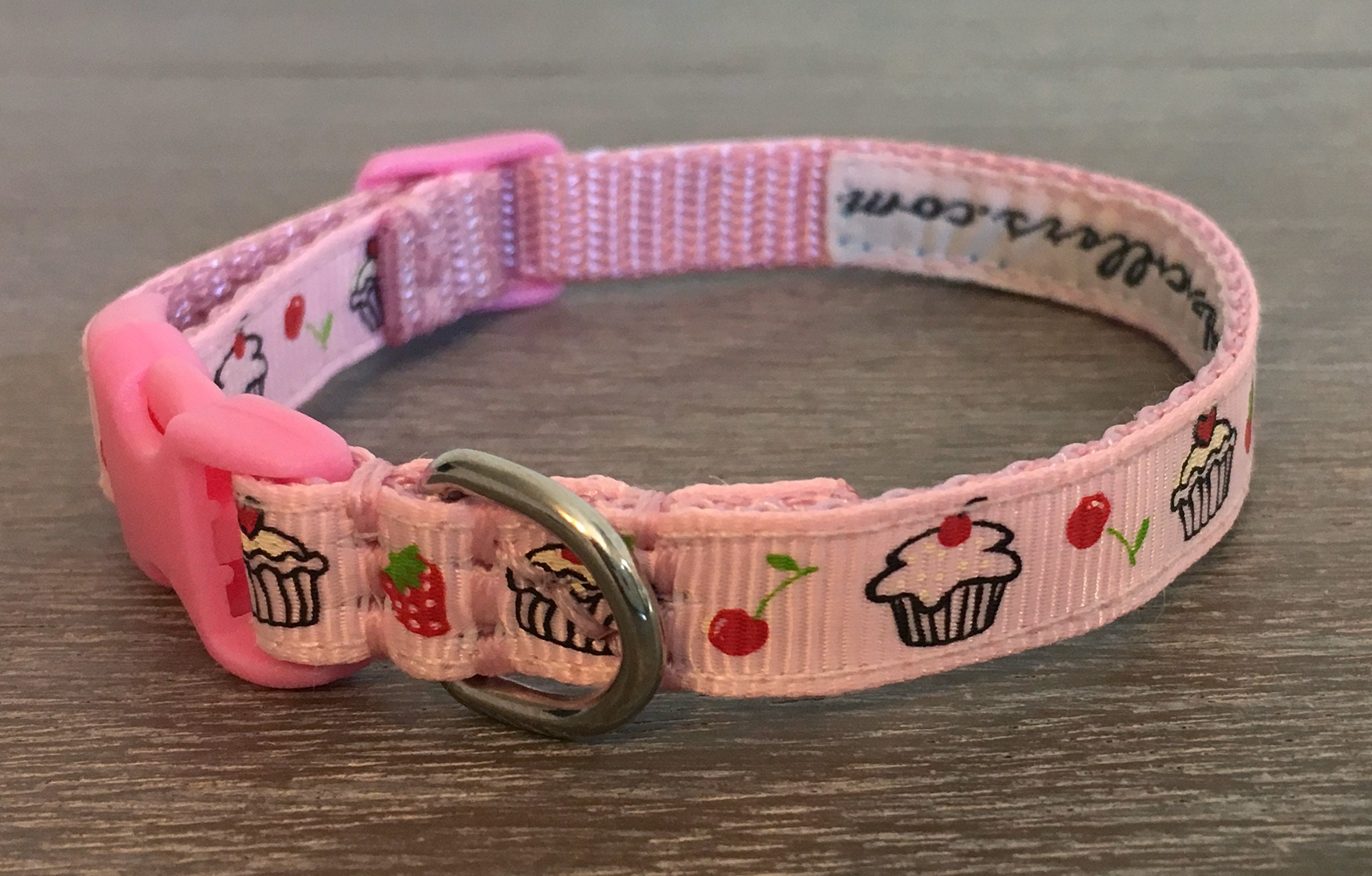 A cute webbing dog collar, 3/8" (10mm) in width, suitable for the smallest dogs / chihuahuas / teacup & toy dogs / puppies etc. A pink cupcakes grosgrain pattern runs along the length of the collar; with small, quick release buckles and a welded D ring.