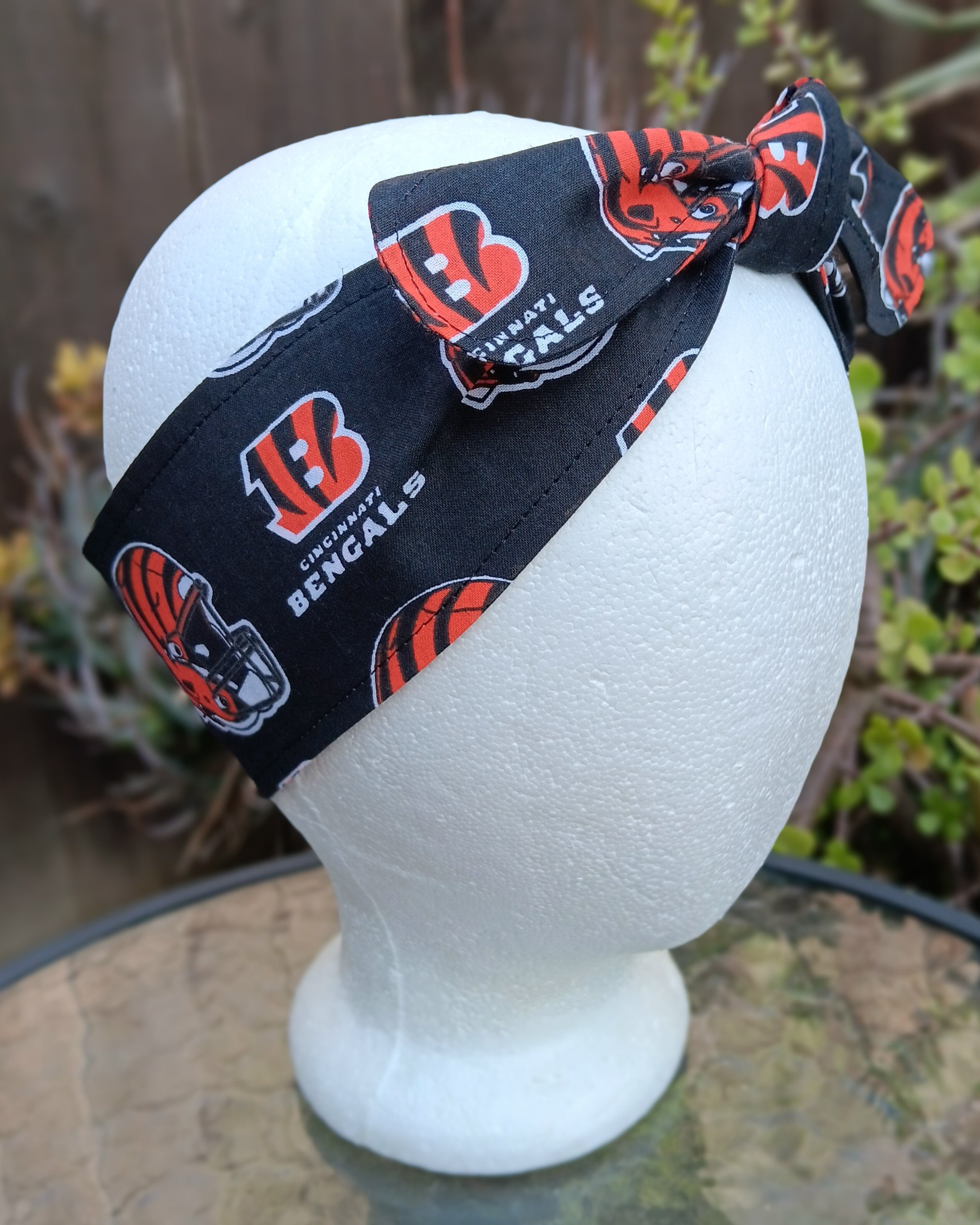 A Cincinnati Bengals self tie headband is a fun way to show off your team pride! Wear on your head, neck, wrist, straw hat, belt loop, boot, purse or wherever you want a pop of your favorite football team’s colors. Handmade from licensed fabric.
