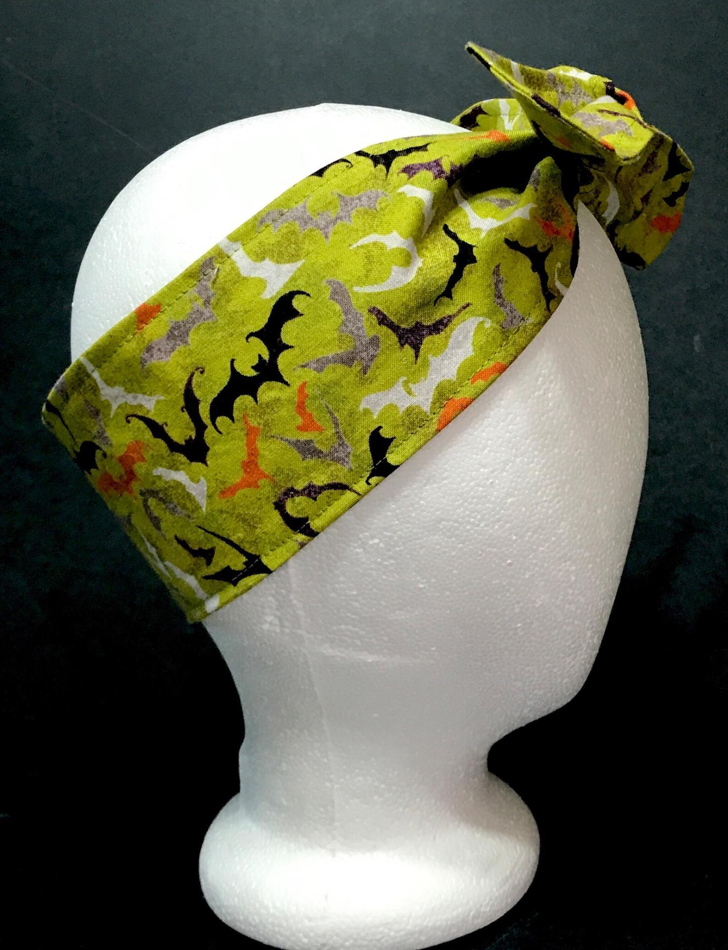 3" wide headband, or hair tie, can be worn on your head, neck, wrist, straw hat, purse, etc. Green background with bats of black, purple, white and orange. Wear it for Halloween or for any goth or spooky occasion!
