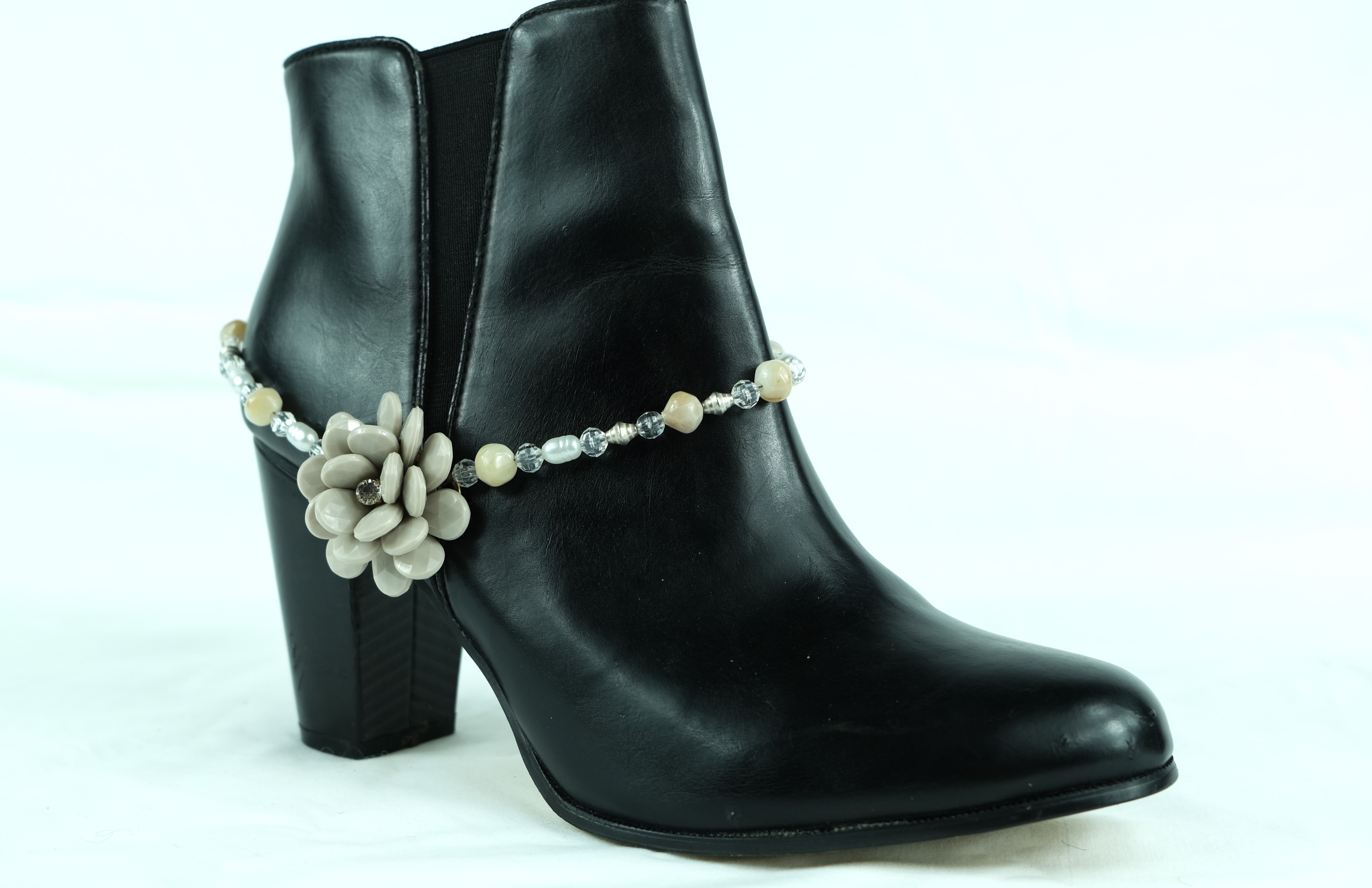 This sweet grey flower Boot Bracelet is elegant and casual at the same time. The beads are white, clear, silver, and natural stone on wire with silver lobster clasp.