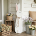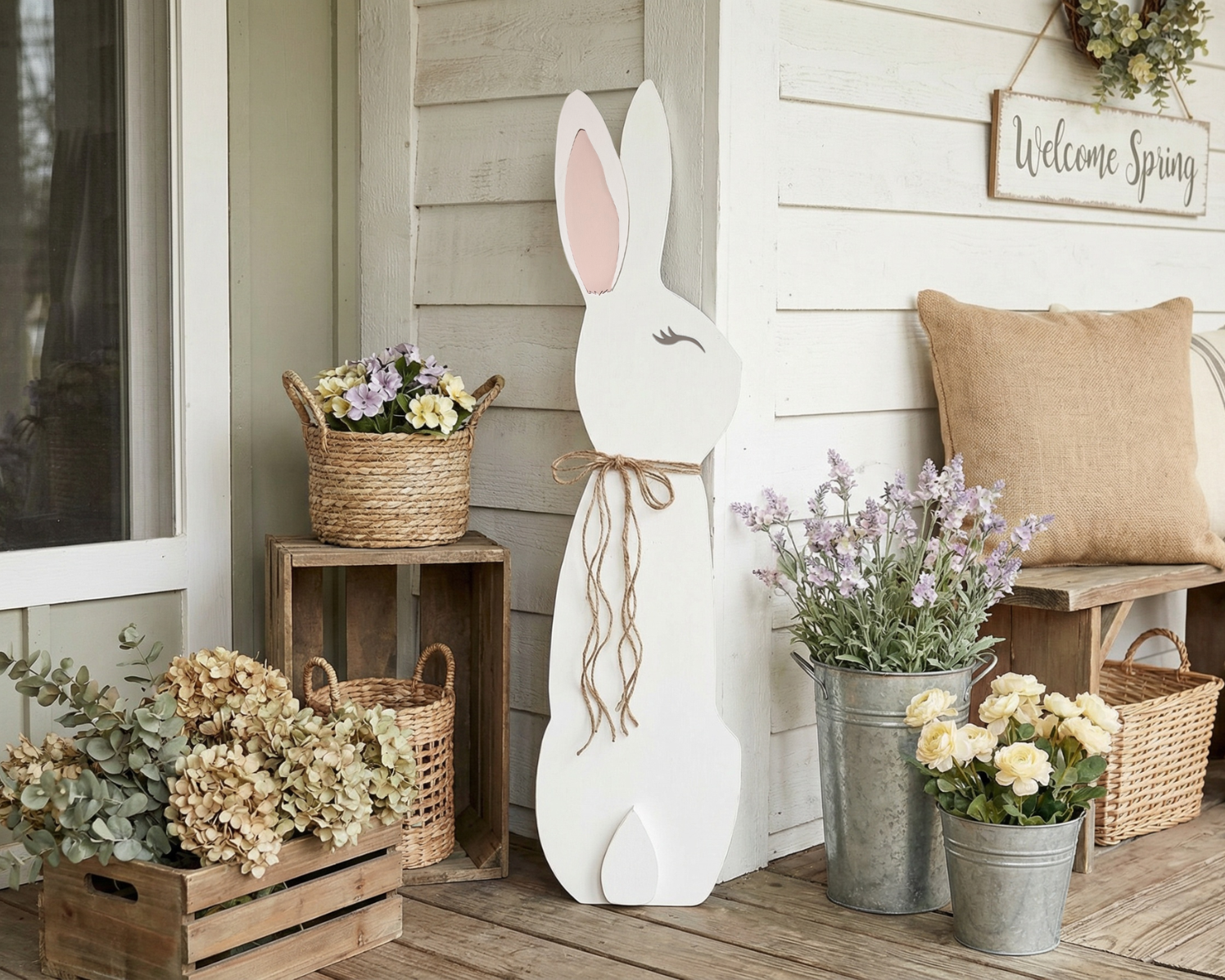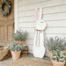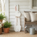 3D detailed wooden porch leaner sitting white rabbit with jute twine bow.