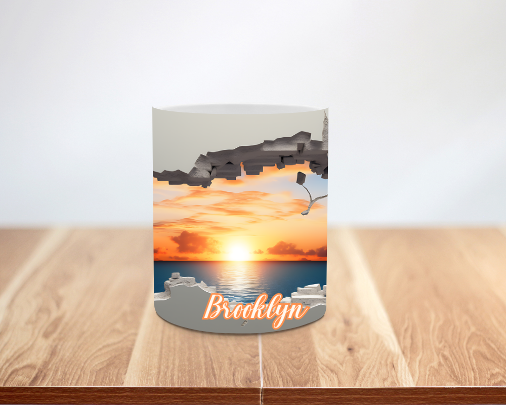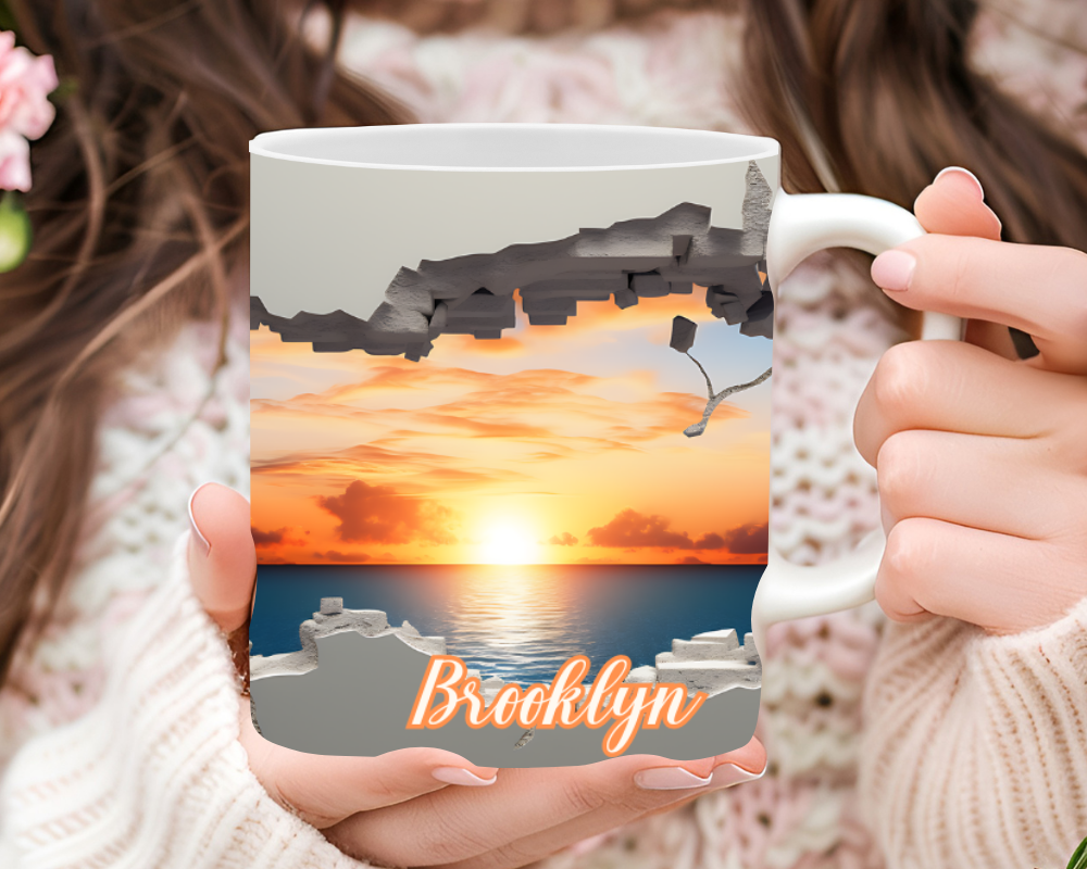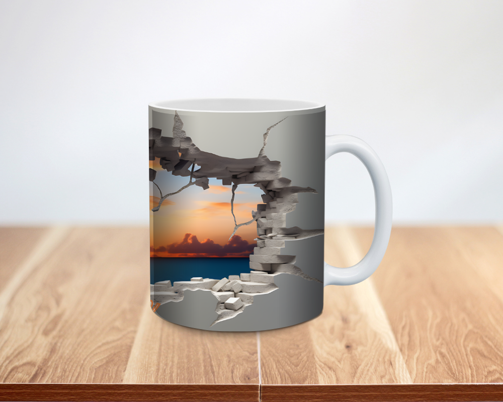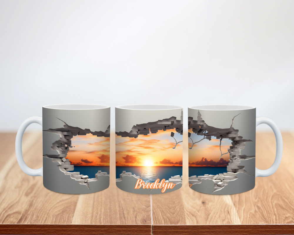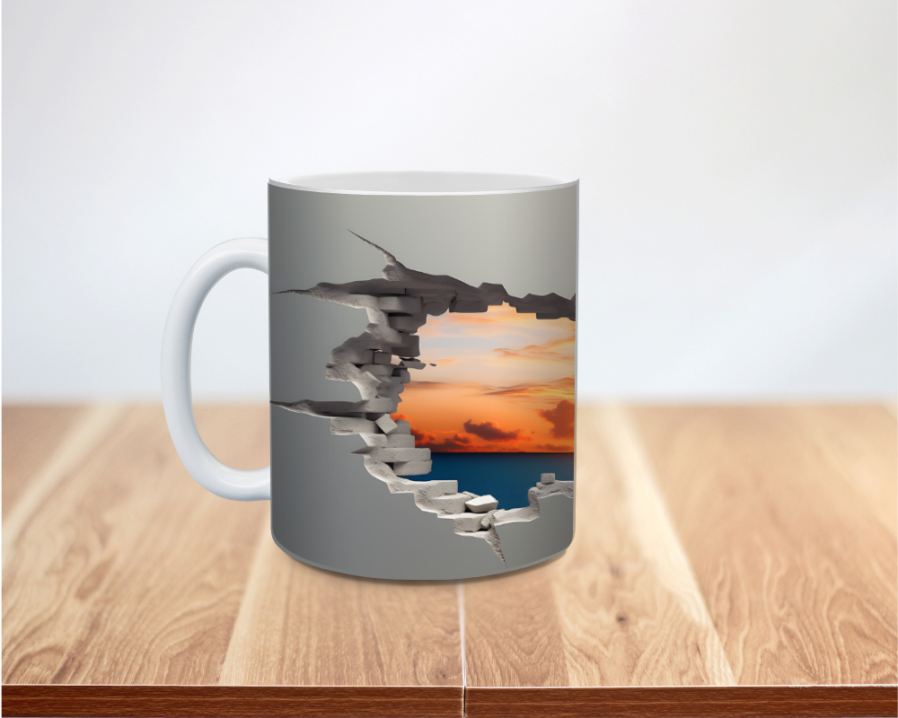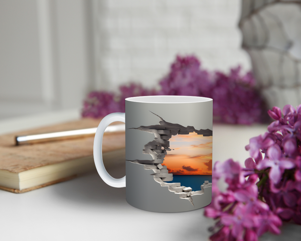 Sip the sunset. This mug looks like the cup torn open to reveal a glowing sky. The 3D faux-hole effect frames a rich, golden sunset. Add your name or a short saying for a special touch. It feels bold, calm, and dreamy.