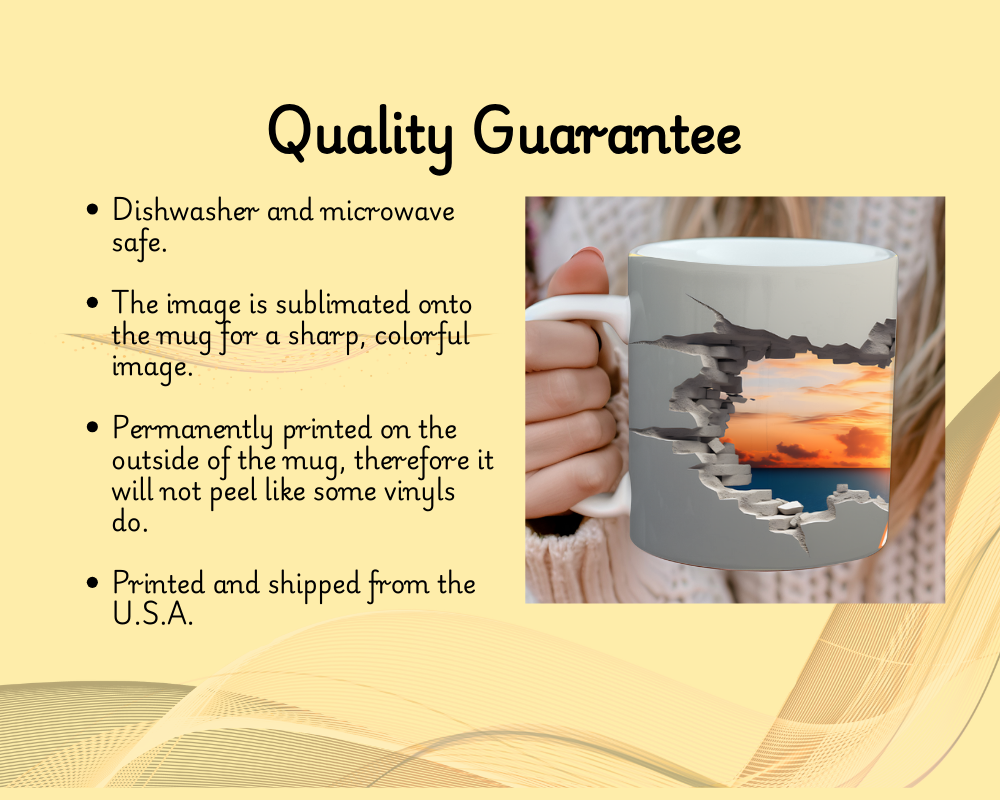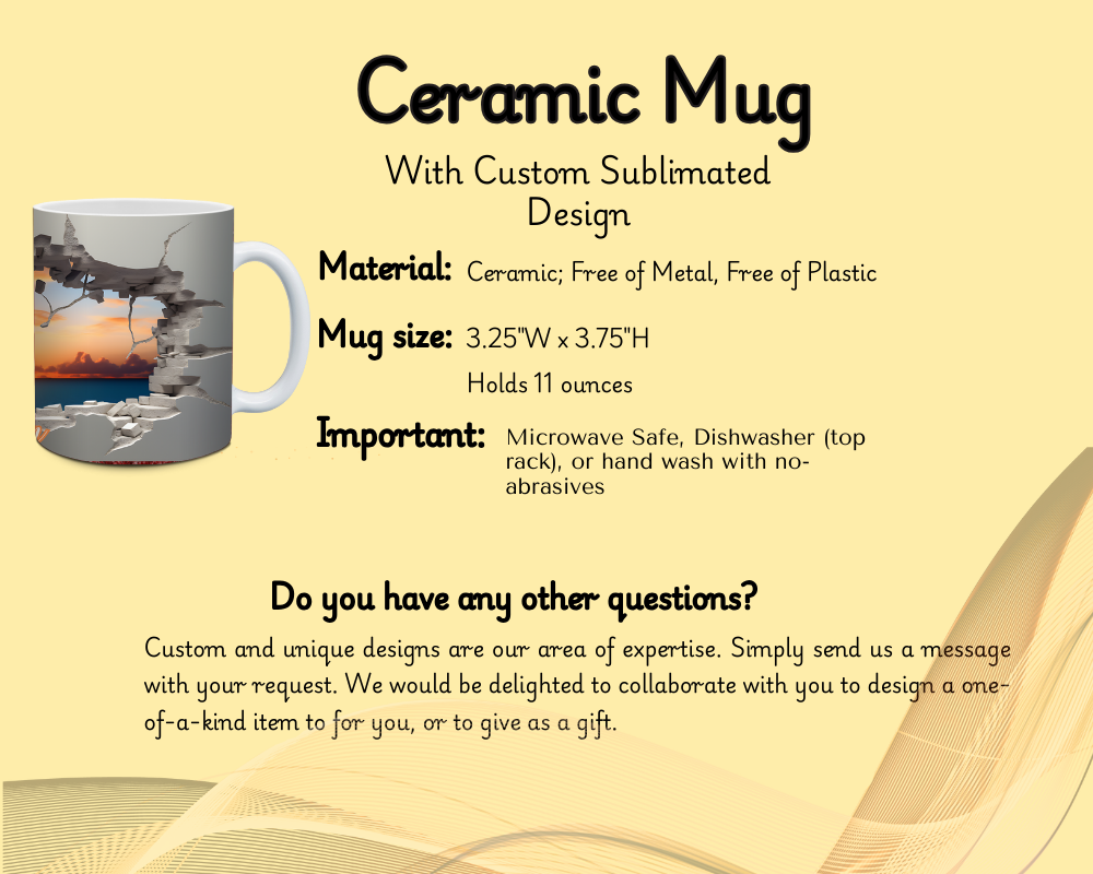 Personalize the front, back, or both sides. Add a name or special saying to make it truly one-of-a-kind. The 3D Faux-Hole Sunset Mug is perfect for nature and ocean sunset lovers.